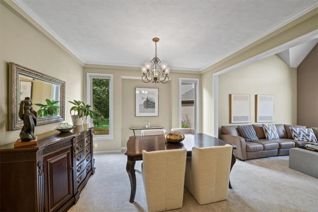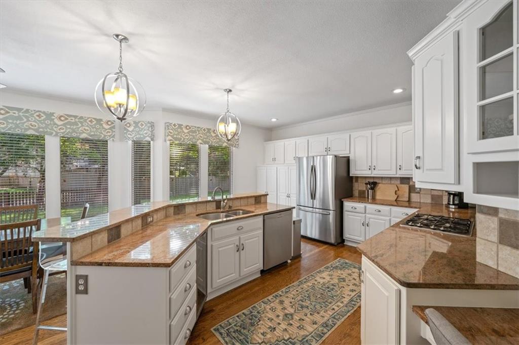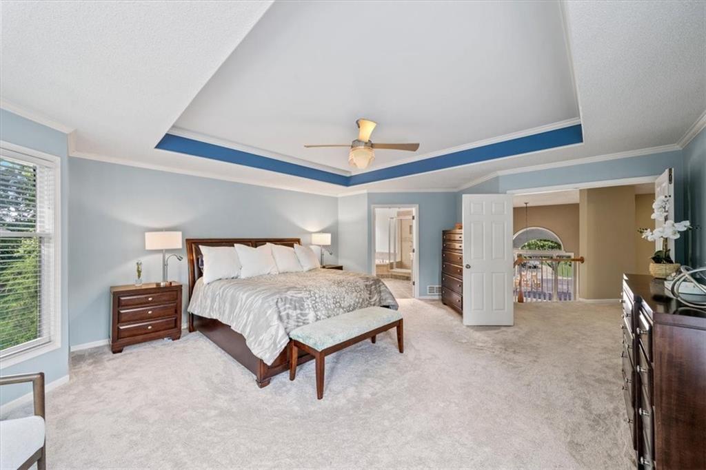 This is the home you have been waiting for in highly sought-after Blue Valley School District! Brand new freshly painted exterior on a spacious cul-de-sac lot. The private, fully fenced backyard is a serene retreat, featuring mature trees, low-maintenance rock landscaping, and a pergola-covered deck—perfect for relaxing or entertaining year-round. Inside, a stunning two-story foyer creates a warm and elegant first impression. The bright, open layout is enhanced by a wall of windows that fills the living spaces with natural light. The expansive kitchen showcases freshly painted soft-close cabinetry and an oversized island with generous seating, ideal for gatherings. The inviting family room offers a cozy fireplace and custom built-ins, perfect for everyday living or hosting guests. The spacious primary suite provides a peaceful escape with updated vanities and a whirlpool tub. Convenient second-floor laundry is located near all generously sized bedrooms. Fresh interior paint and new carpeting add a modern, refreshed feel throughout. Brand new carpeting and paint in the finished basement, complete with a second fireplace, offers versatile space for recreation, work, or relaxation. A three-car garage with an electric vehicle charger adds everyday convenience. Ideally located just minutes from top-rated schools, shopping, and dining.