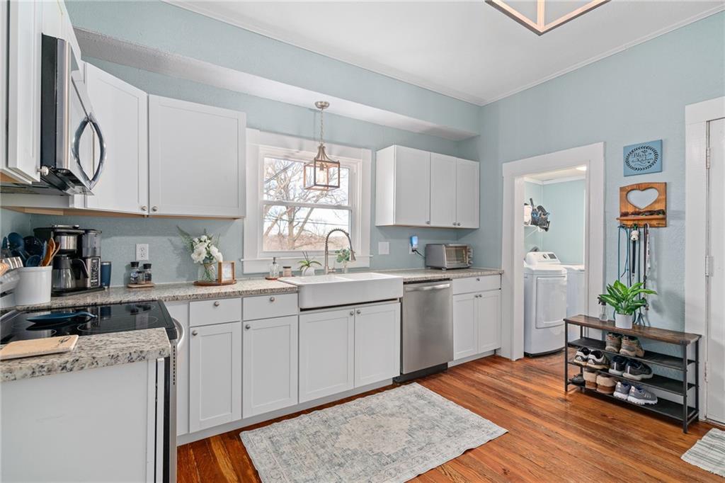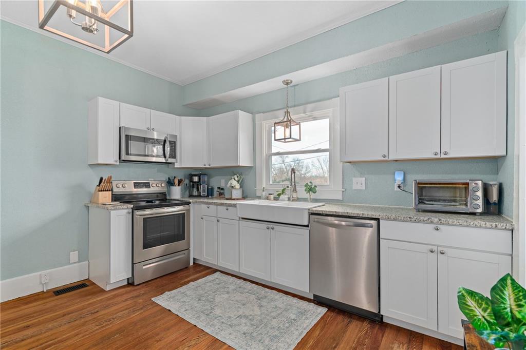 Start the new year in a home that blends classic charm with the comfort of modern updates. This beautifully refreshed ranch was thoughtfully renovated about four years ago, giving buyers the rare combination of character, convenience, and confidence. Major improvements were completed around 2021, including a new roof and gutters, new furnace, new water heater, and updated electrical, removing much of the stress that comes with older homes. Inside, the home feels bright and welcoming with tall ceilings, refinished hardwood floors, and original wood details that add warmth and personality. The updated kitchen features granite countertops, newer cabinets, a farmhouse sink, and stainless steel appliances, creating a space that’s both stylish and functional. A dedicated laundry area sits just off the kitchen for easy everyday living. Both bedrooms offer comfortable space and natural light, and the updated bathroom includes a surprisingly roomy closet. The dining room is perfect for gatherings, complete with a refreshed built-in buffet that adds charm and storage. Outside, enjoy the covered patio and generous yard—ideal for relaxing, grilling, or simply unwinding. To make the move even easier, the seller is including all appliances (washer and dryer too!), a small riding lawn mower, and a one-year home warranty. With its thoughtful updates, included extras, and truly move-in-ready condition, this home is an ideal fit for first-time buyers who want comfort, character, and fewer big-ticket worries.