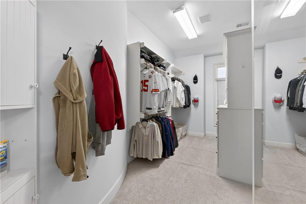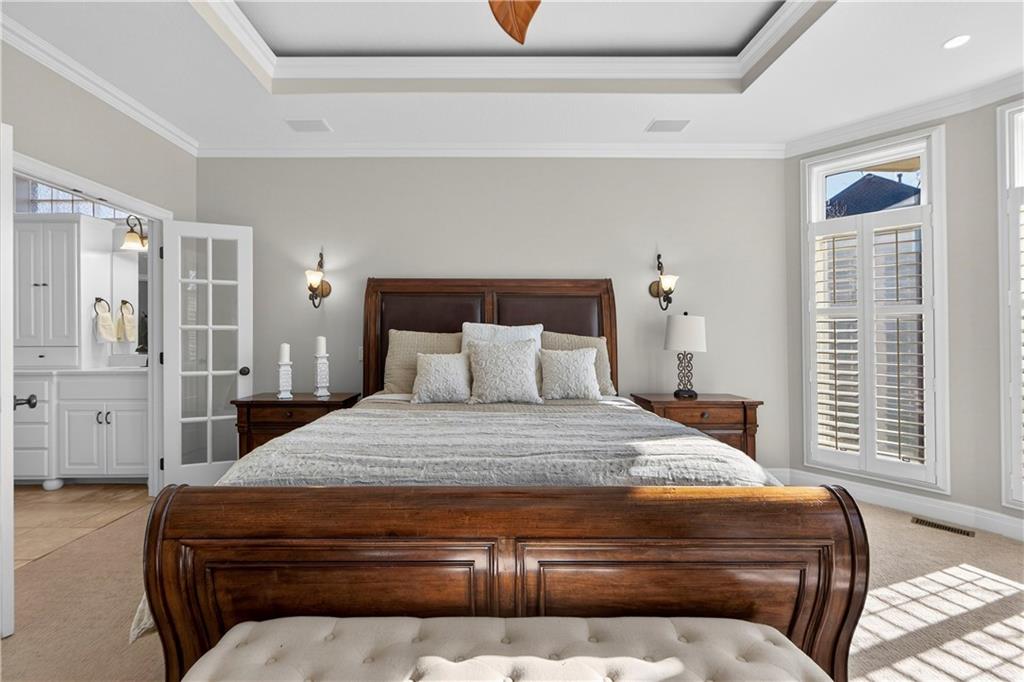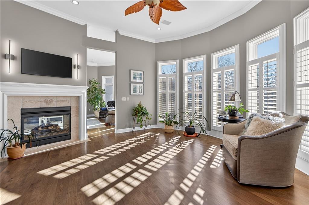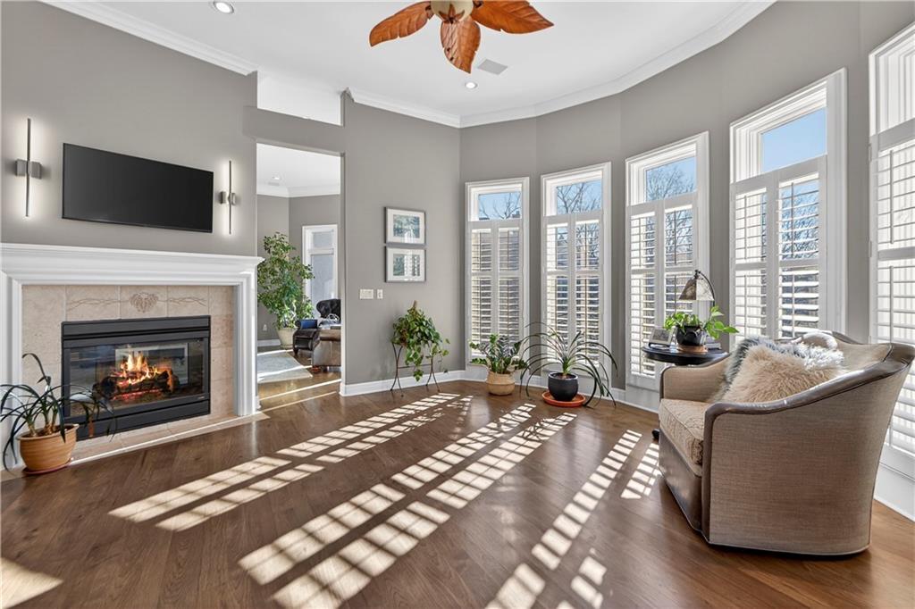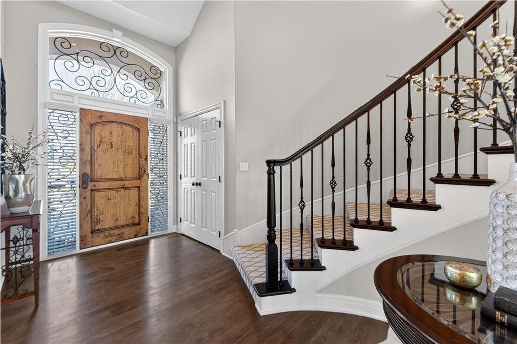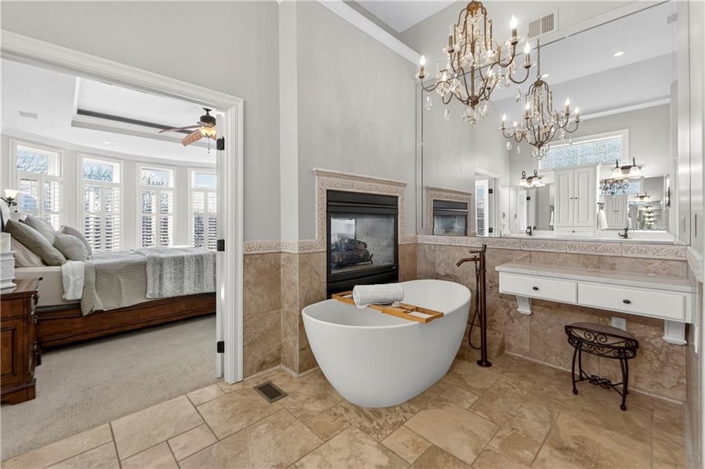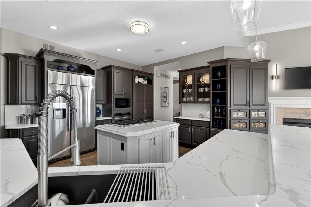 Nestled on a .56-acre treed corner lot in the prestigious Falcon Ridge community, this extensively updated home offers 4,598 sq ft of refined, functional living space. Notable features include a freshly painted exterior, circle drive, arched covered entry with custom door, 4-car garage with radiant heated floors, and a 50-year tile roof. The main level showcases new walnut hardwood floors, fresh interior paint, soaring ceilings, and abundant natural light. Formal living and dining rooms are anchored by a see-through gas fireplace and walls of windows overlooking the private backyard, while the hearth room flows seamlessly into the kitchen. The remodeled kitchen features new custom cabinetry, quartz countertops, a large island, walk in pantry, and high-end Monogram appliances, including a gas range, wall oven/microwave, dishwasher, and Dacor refrigerator. Just off the kitchen, access the brand-new Trex deck, perfectly positioned to enjoy the wooded views and outdoor entertaining. The main-level primary suite offers vaulted ceilings, plantation shutters, a see-through fireplace, and a spa-inspired bath with new cabinetry, quartz countertops, freestanding tub, walk-in shower, and expansive custom closet. Upstairs includes a private office with built-ins and half bath, along with unfinished attic space for storage or future expansion. The walk-out lower level is designed for entertaining with a new rec room featuring built-in projector and surround sound, wet bar with wine and beverage refrigerators, three additional bedrooms, a Jack & Jill bath, a private ensuite, and a non-conforming fourth bedroom ideal for a gym or office. Outdoor living continues to the patio with a gas-plumbed firepit and newly planted trees for added privacy. Additional highlights include zoned heating and cooling, new AC, 75-gallon water heater, and extensive recent updates throughout, making this Falcon Ridge home truly move-in ready.
