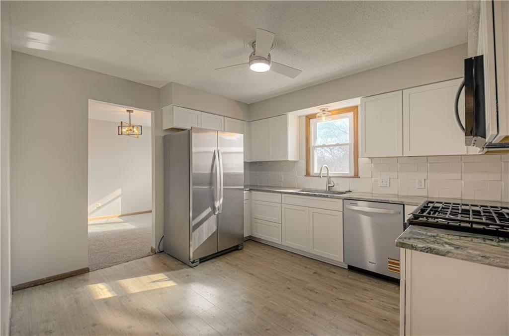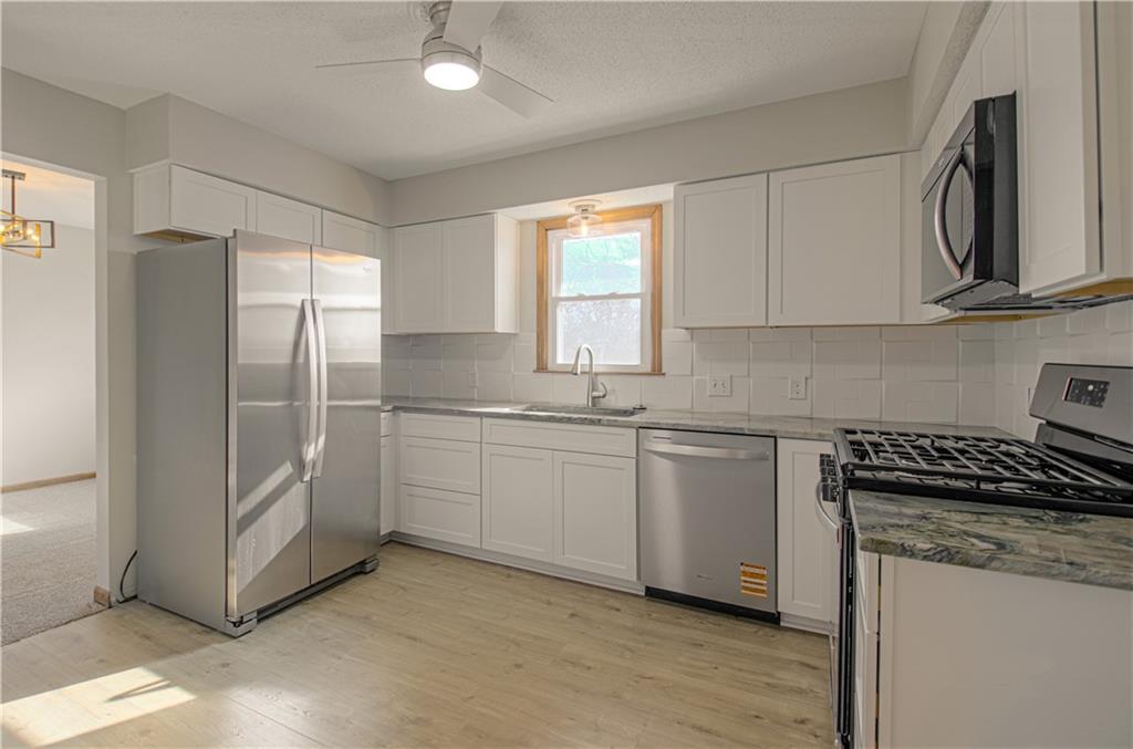 Adorable raised ranch,fully updated and move-in ready!Features include quartzite countertops, new cabinets thruout, beautifully updated baths, and two brick fireplaces for added charm and comfort. The family room with fireplace is flanked with bay windows in the front. Charming dining area overlooking flat treed lot-perfect for extra outside activities.Bedrooms are generous in size. 2 full baths completely redone with new plumbing throughout, Anderson Windows.Situated on a rare 3/4 acre lot with a 2 car garage, all just minutes from the new Lenexa City Center. A perfect blend of modern updates, space and location.