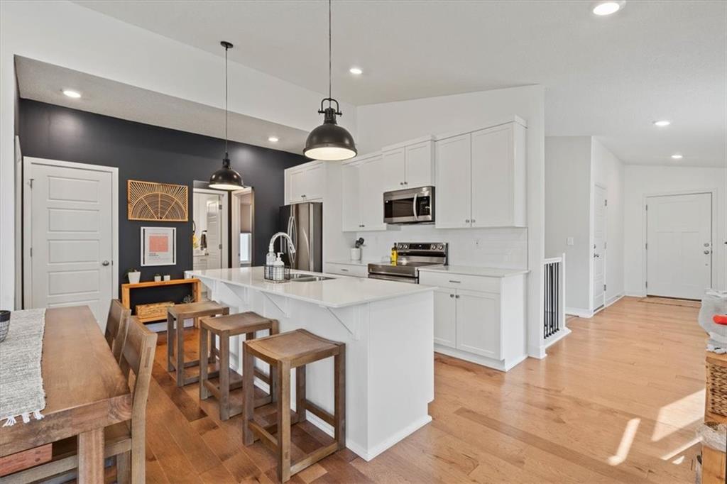 This striking modern home blends clean architectural lines, open-concept living, and elevated finishes to create a refined yet welcoming space designed for both everyday living and effortless entertaining. From the moment you arrive, the home makes a statement with its contemporary curb appeal and inviting presence. Inside, an open-concept layout is filled with natural light, enhanced by expansive windows and soaring ceilings that create a seamless flow between living, dining, and entertaining spaces. The heart of the home is the sleek, bright white kitchen, featuring stainless appliances, and a large island with seating. The master suite serves as a private retreat, complete with a walk-in closet, and fresh paint, pine shiplap and custom mirrors in master bathroom space. Finished basement provides plenty of extra living space with a rec room, gym area, kitchenette, 3rd bedroom and half bath. Situated in a desirable Overland Park location, this home offers the perfect blend of modern luxury and suburban tranquility, with easy access to the neighborhood pool, walking trails, shopping, dining, parks, and top local amenities. Every detail has been carefully curated to support a refined yet approachable lifestyle, making this property a standout opportunity for buyers seeking contemporary design, quality craftsmanship, and a place that truly feels like home.