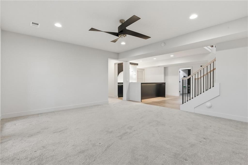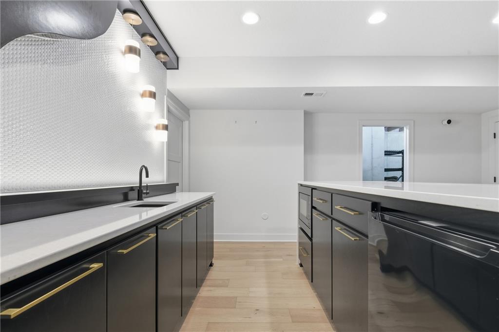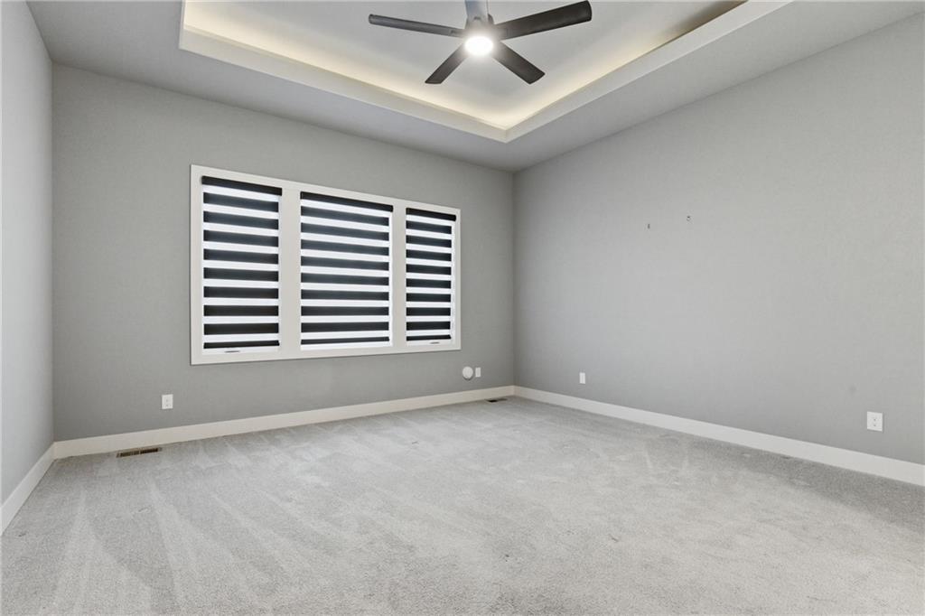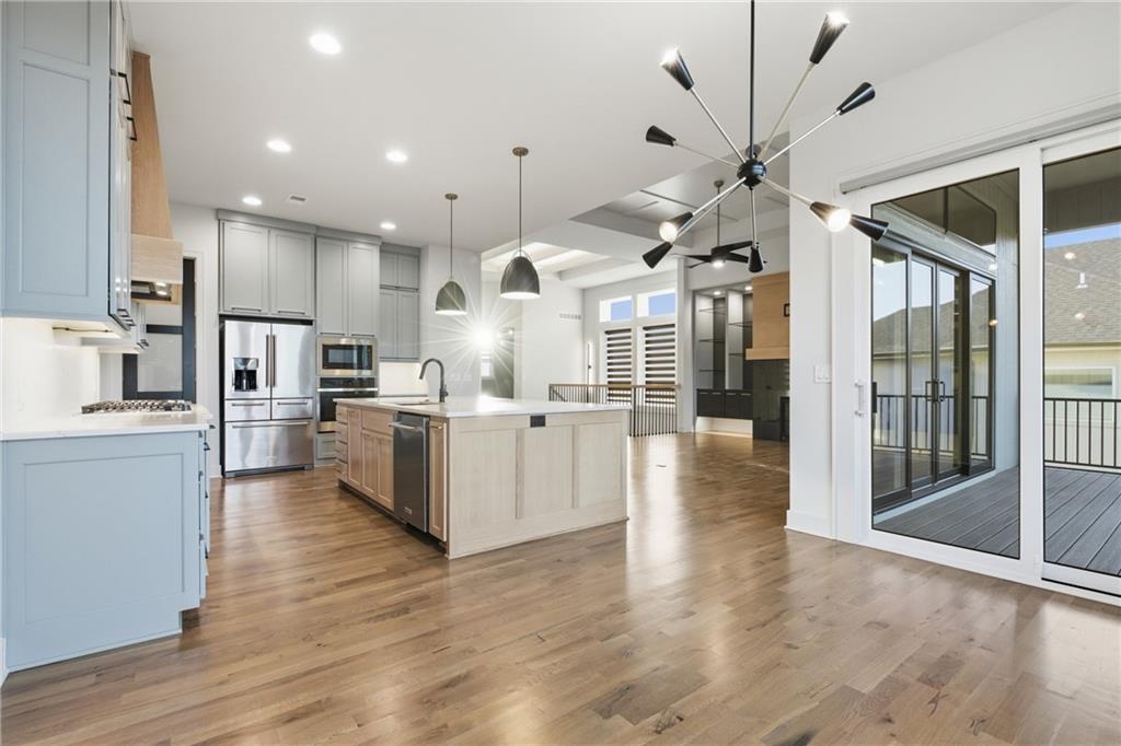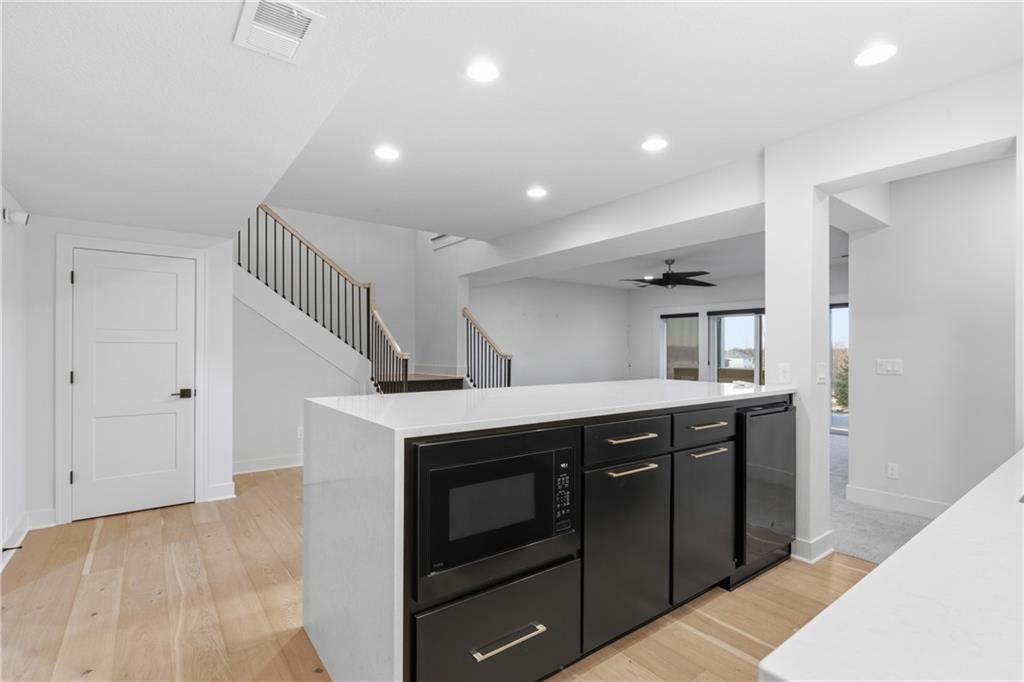 Built in late 2022 by the esteemed Don Julian Builders, this beautifully designed Reverse 1.5 story home is tucked within the premier Bristol Highlands Villas—where maintenance-provided living meets the peace and privacy of rolling hills and protected green space. Just minutes from Shawnee Mission Park, scenic trails and lakes, Lenexa City Center, dining, shopping, De Soto schools, and highway access—yet perfectly secluded—this home truly offers the best of both worlds. Thoughtfully designed for main-level living, the primary suite is a private retreat featuring separate vanities, luxurious soaking tub, walk-in shower with bench, and a spacious walk-in closet with direct access to the laundry room . A stylish powder room for guests and a dedicated office with double doors add both function and flexibility upstairs. The great room features custom built-ins, gas fireplace, and a seamless flow to the covered + screened deck overlooking tranquil green space with privacy! The kitchen—designed for entertaining and everyday living, showcases an oversized island with storage and seating, custom cabinetry to ceiling, quartz, and walk-in pantry. All SS appliances stay, including a newer KitchenAid dishwasher and high-end KitchenAid refrigerator! The walkout lower level is ideal for guests and gatherings, featuring a chic wet bar with beverage fridge, built-in microwave, and island. A cozy family room with slider access to the covered patio is perfect for movie night. One bedroom enjoys easy access to a full hall bath, while 2 additional bedrooms share a Jack-and-Jill bathroom with tub—perfect for hosting family & visitors. Features include high-efficiency HVAC, Lennox smart thermostat, ADT security, automatic privacy screens for the patio and deck, automatic blinds throughout, hardwood floors, and a coveted location backing to community green space. Low-maintenance living. High-end finishes. Don’t let this one pass you by—homes like this are truly special.