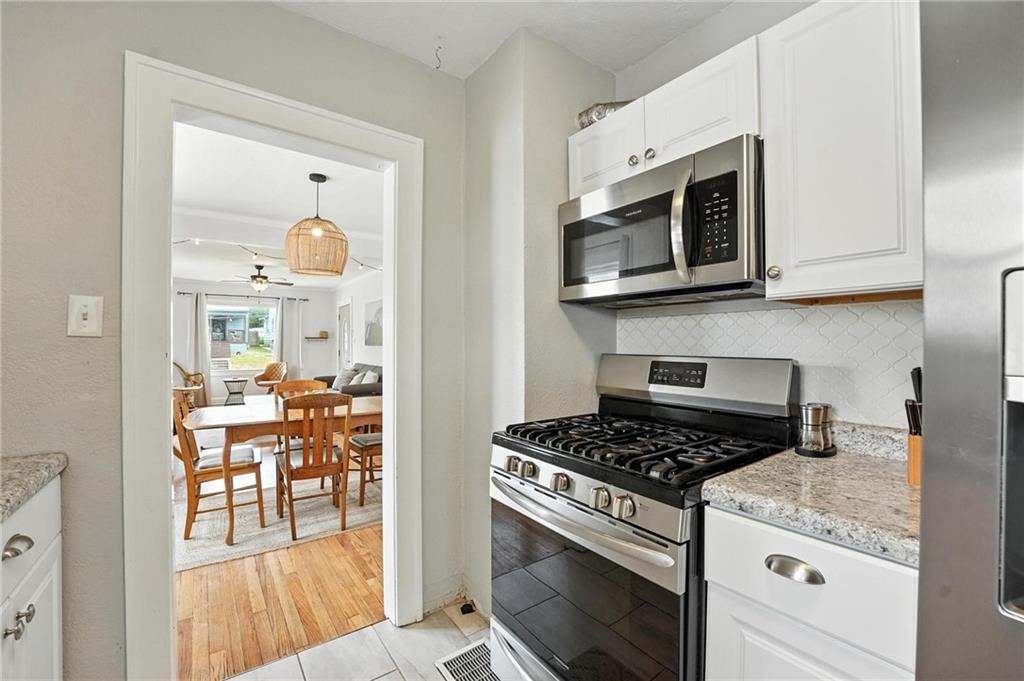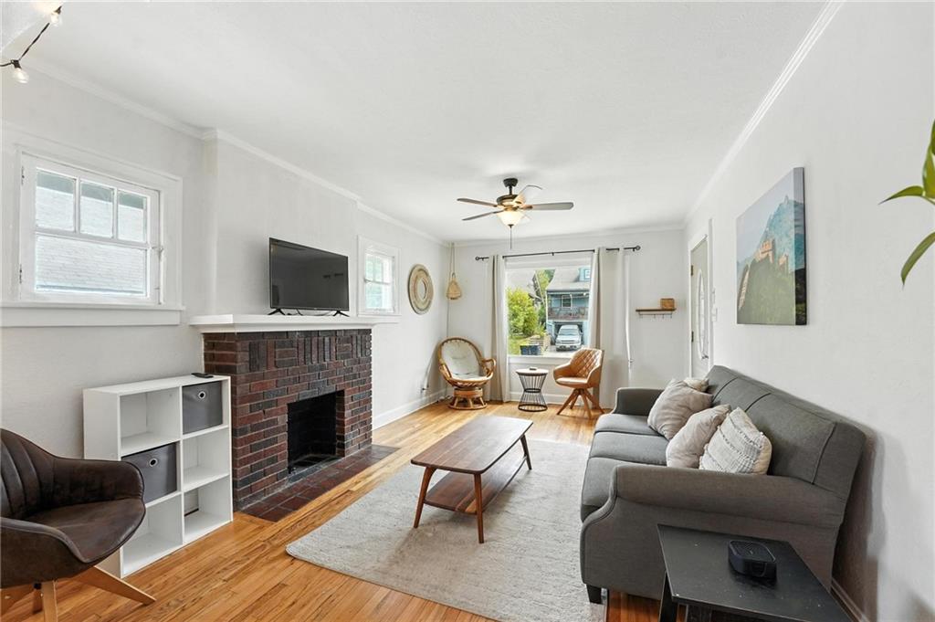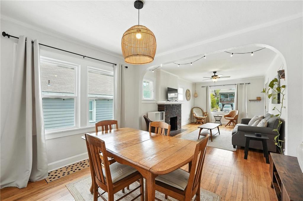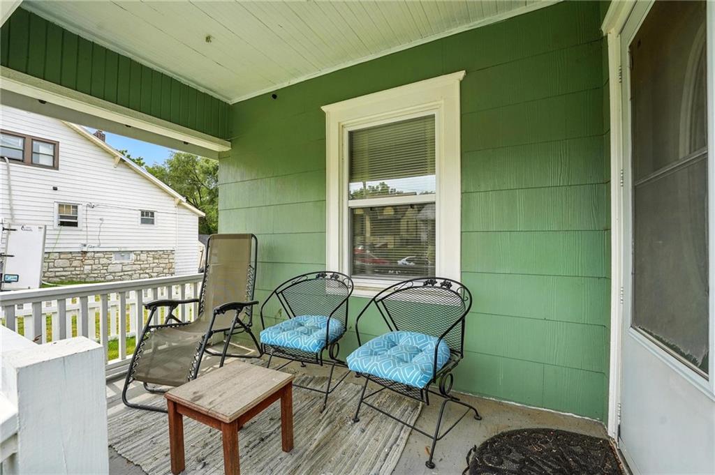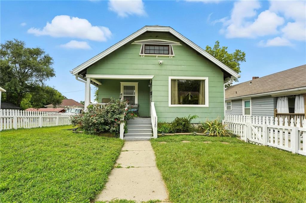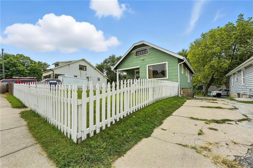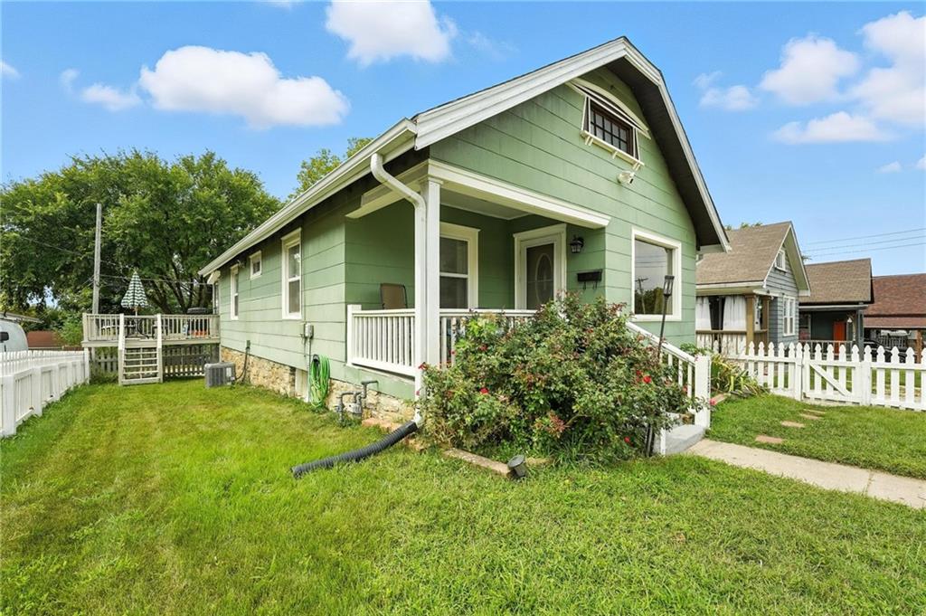 Charming bungalow with the white picket fence everyone dreams about. Major updates completed in 2022 include new windows, AC, water heater, gutters, and beautifully refinished hardwood floors. Rare large off street parking adds everyday convenience. The welcoming covered front porch sets the tone, leading into a light-filled living room with hardwood floors, a brick fireplace, ceiling fan, and a large picture window. The dining room features refinished hardwoods and an arched opening that flows seamlessly into the updated kitchen with tile flooring, laminate counters, and newer stainless steel appliances including a gas stove. A recently finished sunroom with new windows and an exterior door provides additional living space ideal for relaxing or entertaining. Both bedrooms feature hardwood floors, and the full bath offers a tiled shower surround. The stone basement includes storage and a garage door. Outside, enjoy a side deck, shared driveway, and rear parking. The attic includes stairs and windows, offering excellent potential for future living space.
