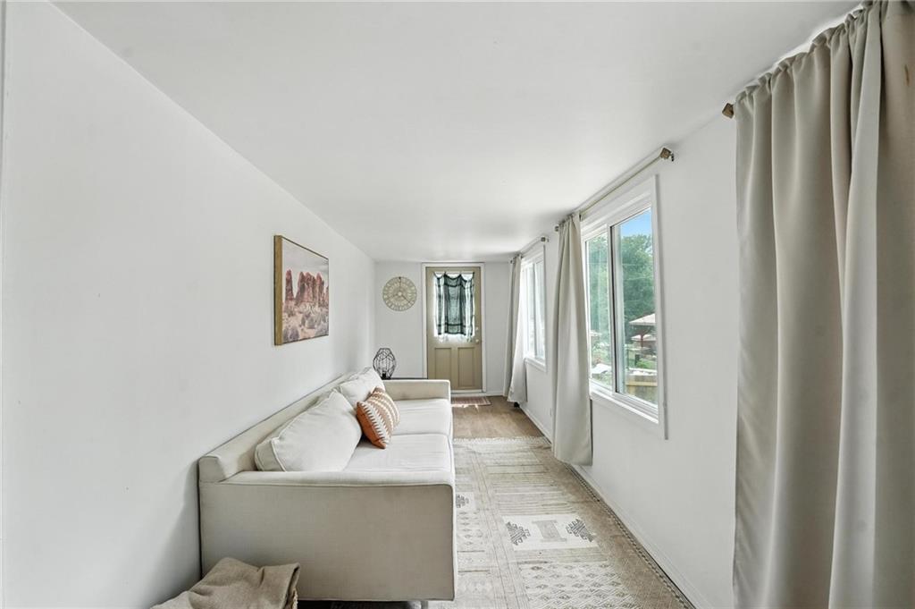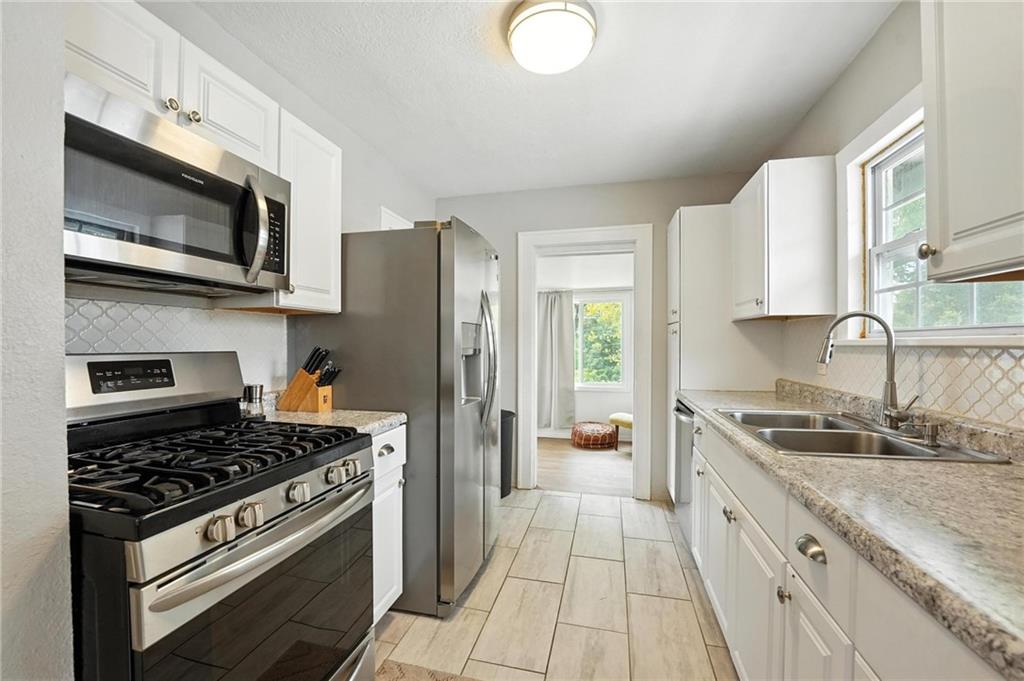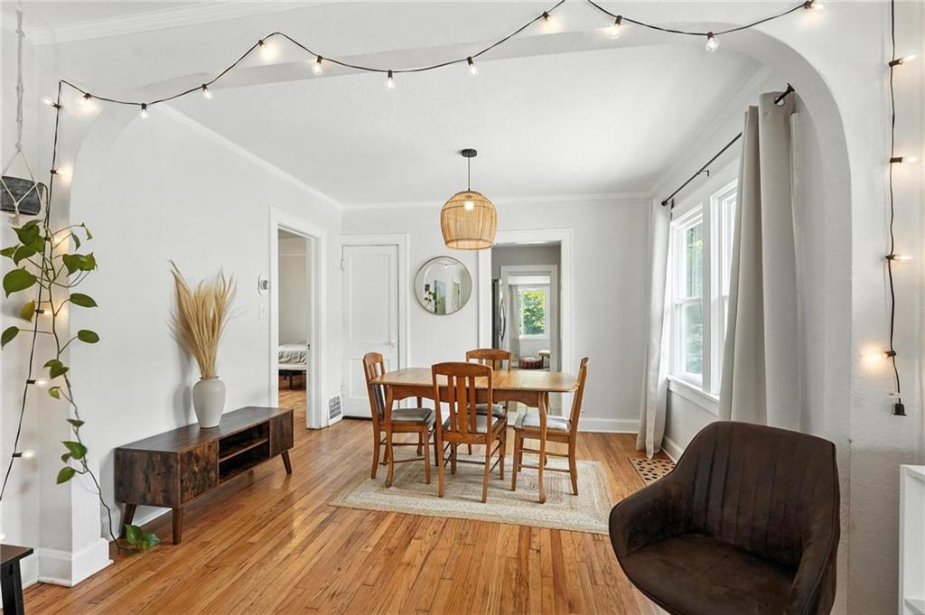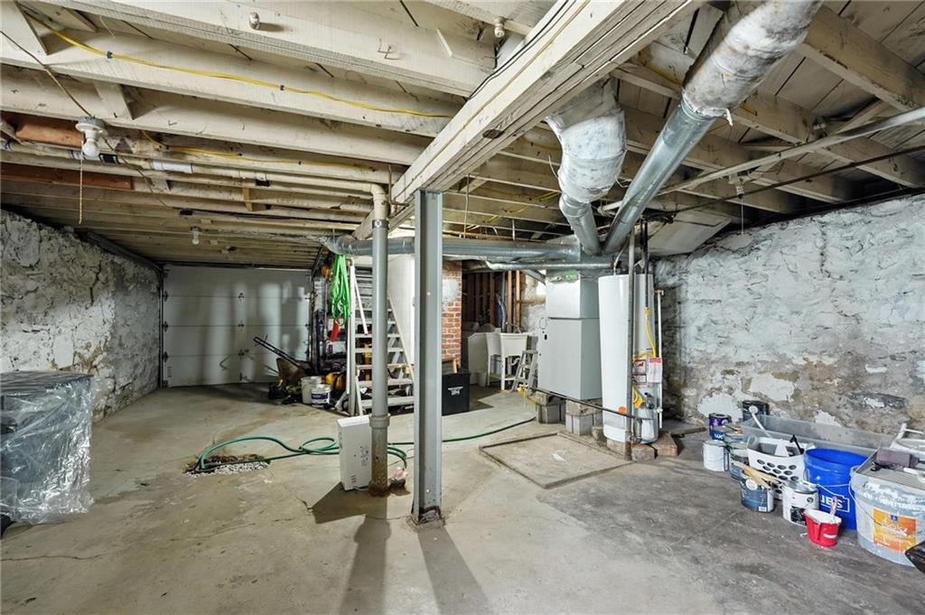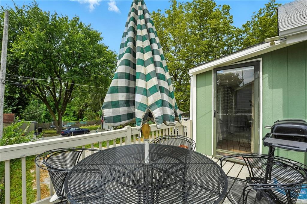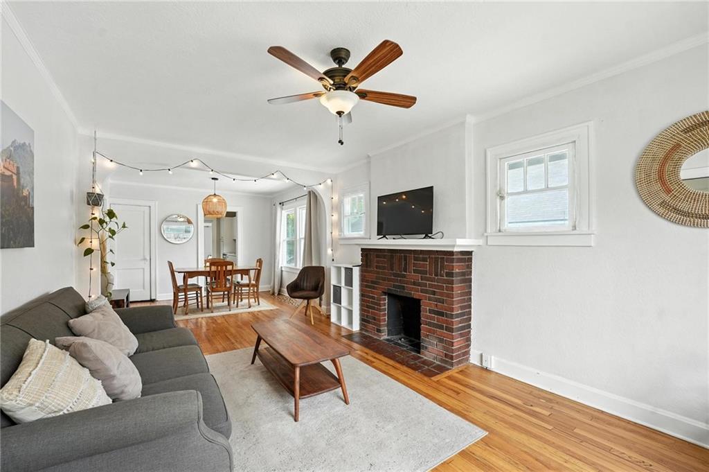 Charming bungalow with the white picket fence everyone dreams about. Major updates completed in 2022 include new windows, AC, water heater, gutters, and beautifully refinished hardwood floors. Rare large off street parking adds everyday convenience. The welcoming covered front porch sets the tone, leading into a light-filled living room with hardwood floors, a brick fireplace, ceiling fan, and a large picture window. The dining room features refinished hardwoods and an arched opening that flows seamlessly into the updated kitchen with tile flooring, laminate counters, and newer stainless steel appliances including a gas stove. A recently finished sunroom with new windows and an exterior door provides additional living space ideal for relaxing or entertaining. Both bedrooms feature hardwood floors, and the full bath offers a tiled shower surround. The stone basement includes storage and a garage door. Outside, enjoy a side deck, shared driveway, and rear parking. The attic includes stairs and windows, offering excellent potential for future living space.