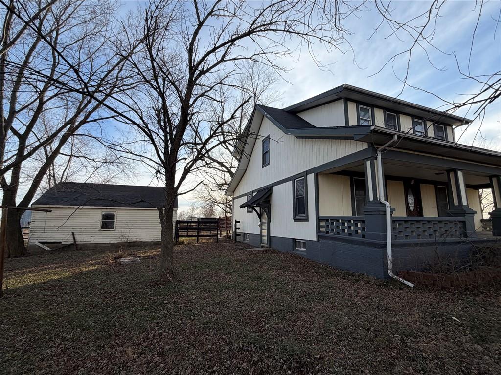 - Welcome to 21709 E 321st Street, Harrisonville, MO, where peaceful country living meets convenience. Situated on 5 beautiful acres on a corner lot, this property offers space, privacy, and opportunity with multiple outbuildings, two grain bins, and a scenic landscape filled with a wide variety of mature trees. The home itself is a classic older farmhouse full of character and charm, featuring a covered front porch, a large back deck, and solid bones throughout. While the home will require a full cosmetic update, it feels structurally rock solid, making it an excellent candidate for renovation, restoration, or modernization to suit your vision. The acreage is thoughtfully sprinkled with multiple buildings, offering flexibility for storage, workshops, hobbies, livestock, or future expansion. Enjoy the serenity of rural living with the added benefit of easy access to the city, making this property ideal for buyers seeking space, and privacy. This is a rare opportunity to own acreage with character, and upside-bring your vision and make it your own.