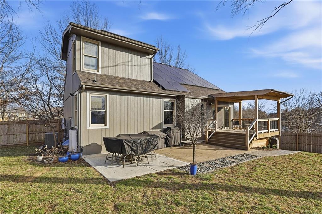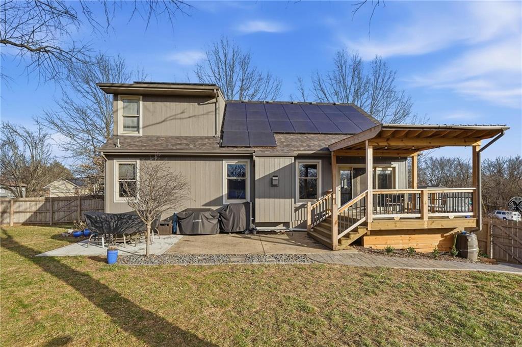 Welcome home to timeless comfort and thoughtful design. Situated on a large corner lot, this well-maintained home offers exceptional indoor and outdoor living space, featuring an open floor plan with a spacious living room, dining area, and kitchen accented by high ceilings that create a bright, inviting atmosphere. The large primary bedroom includes a walk-in closet, while recent updates such as a newer roof, newer flooring throughout the main level, and newer kitchen countertops add both style and peace of mind. Outdoor living shines in the generous backyard with a covered deck, expansive patio, and fire pit—perfect for family time, entertaining, or quiet evenings at home. Additional highlights include a large front porch, oversized garage, and HVAC systems less than two years old. Energy-efficient solar panels offset approximately 90% of the home’s annual electricity usage, complemented by a whole-home backup battery that helps keep most of the house powered during outages. Conveniently located near elementary school and middle school, this home offers the space, efficiency, and location today’s families are looking for. Schedule your showing today!
