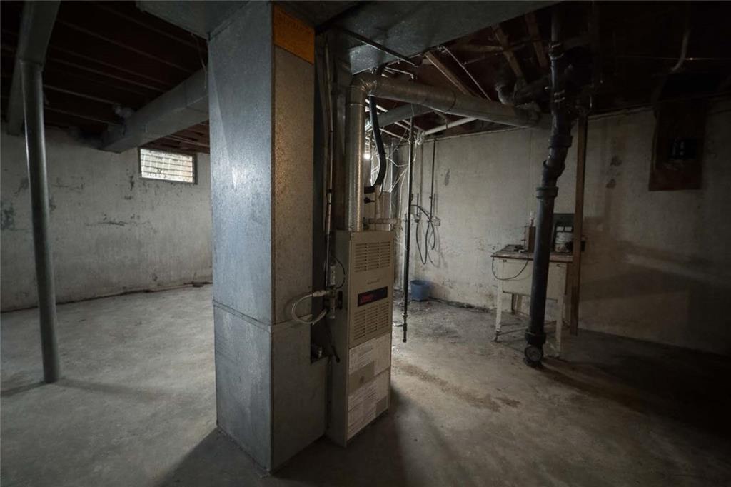 Basement featuring heating unit and electric panel
