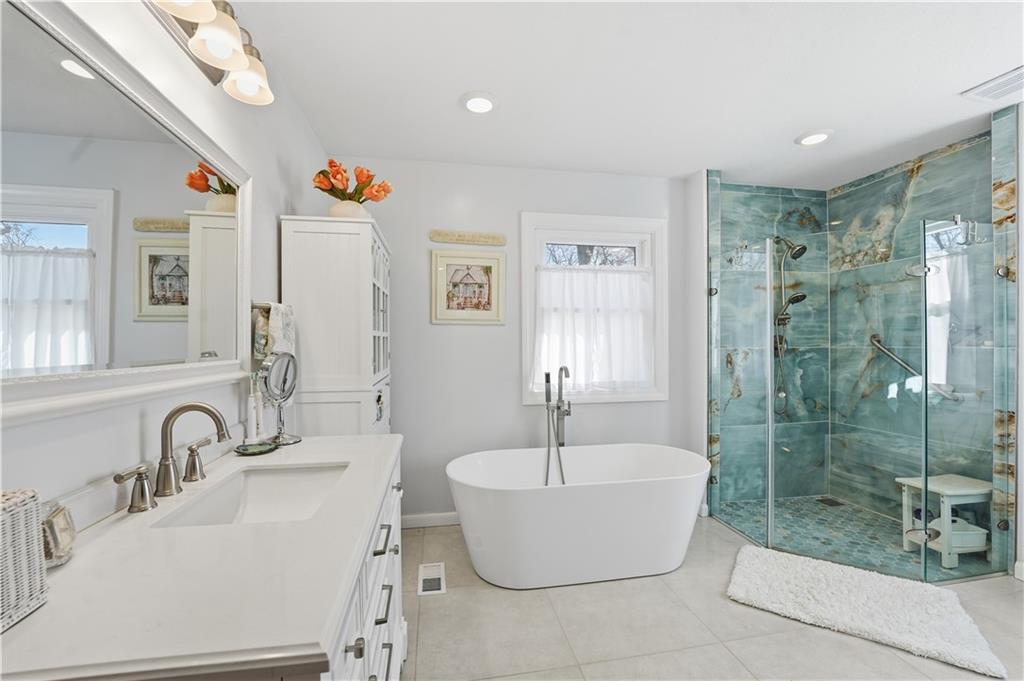 PRICED TO SELL! Step into your own beach-inspired oasis in Leavenworth, KS. This cheerful yellow and blue home offers a light, coastal feel paired with thoughtful updates throughout. The remodeled 2-bedroom, 1.5-bath layout includes a spa-like primary suite featuring a stunning tile shower, standalone soaking tub, large vanity, tile floors, and a walk-in closet, your personal retreat at the end of the day. The living room is filled with natural light from a large picture window overlooking the backyard and peaceful creek beyond. The updated kitchen boasts a modern design with an island, generous counter space, and plenty of room for cooking. A second main-level bedroom is currently being used as an additional dining space, offering flexibility to suit your lifestyle. Downstairs, you’ll find an open, insulated basement that’s already being used as a living area and is ready for a new owner to add finishing touches. Unique dual garage access includes one garage on the main level and another at the basement level- perfect for storage, hobbies, or extra parking.
