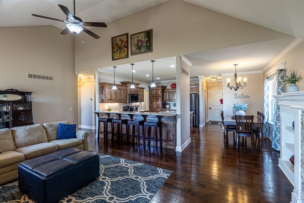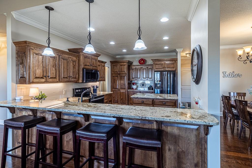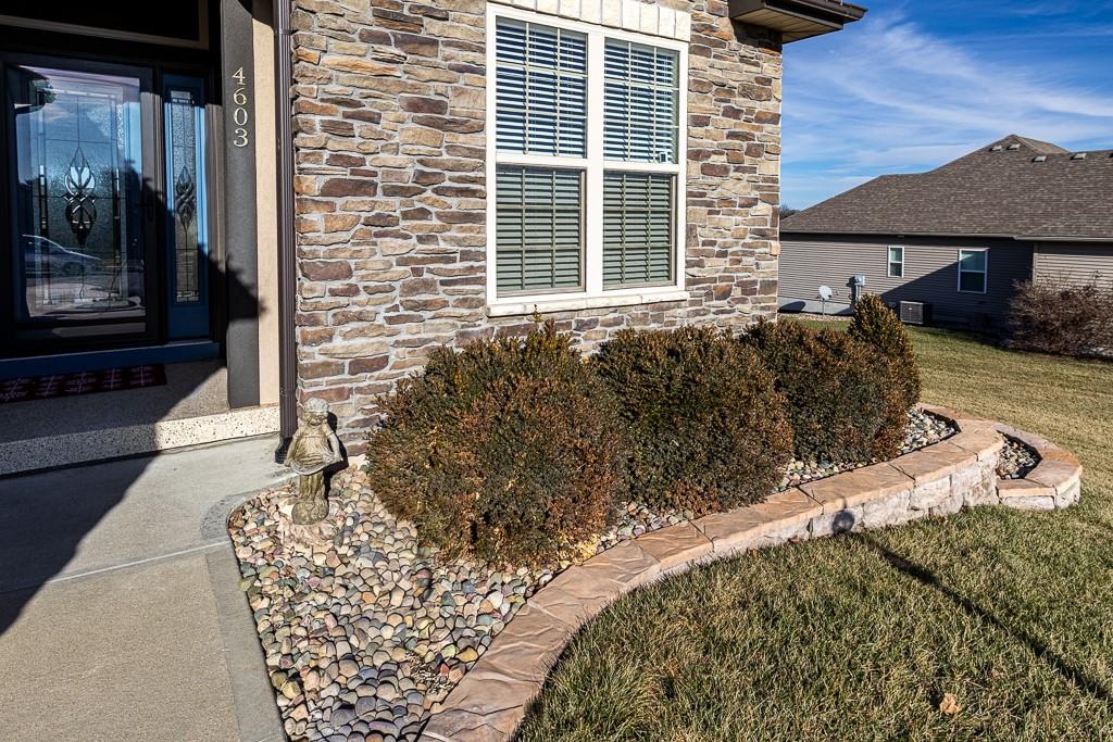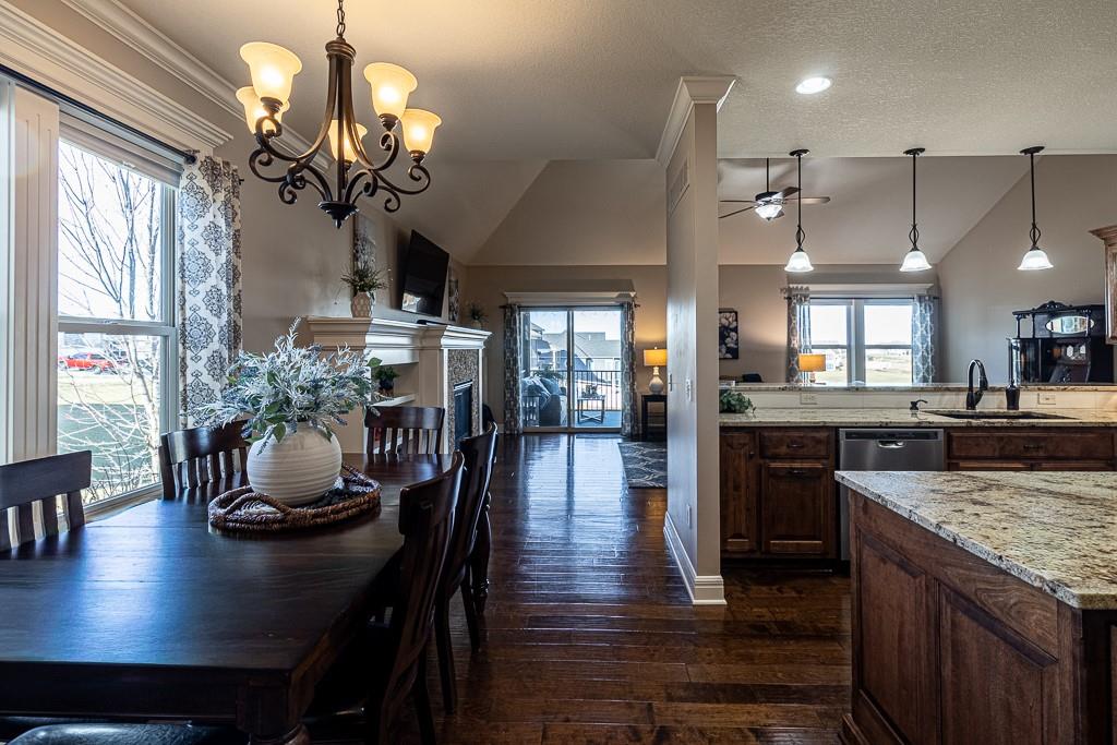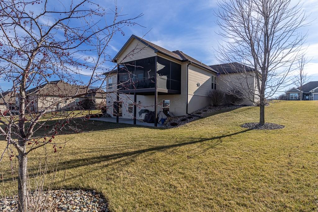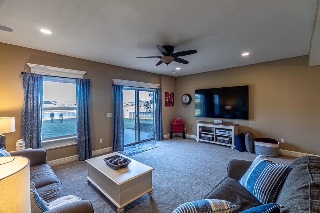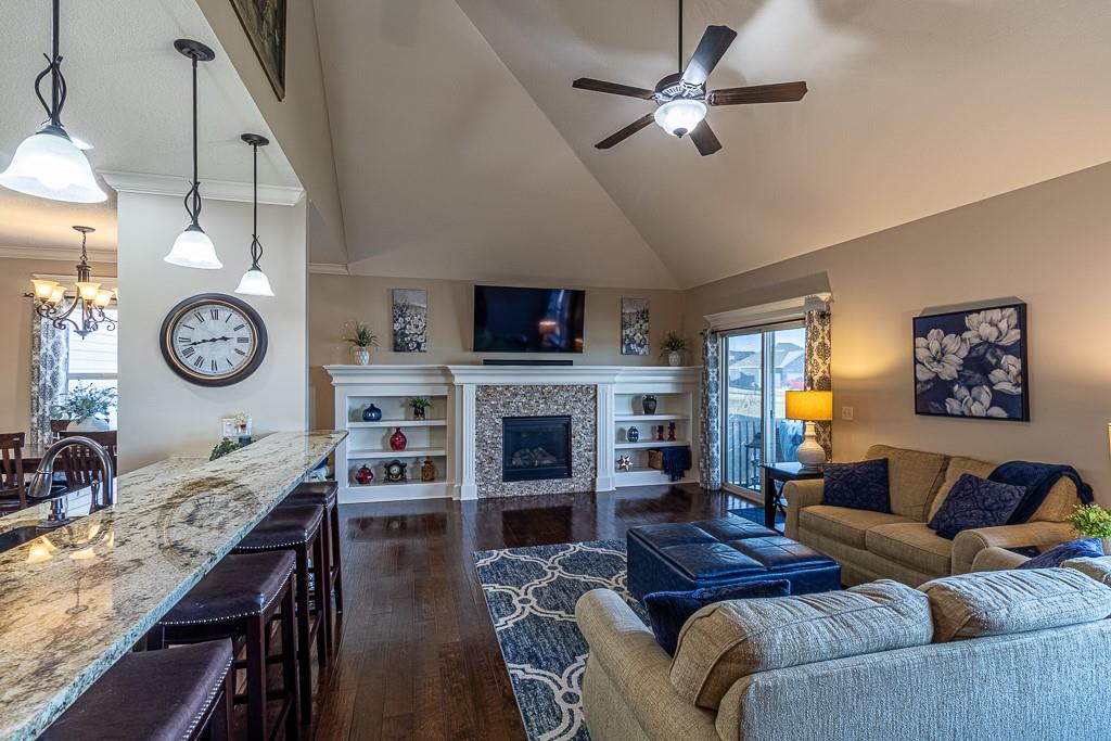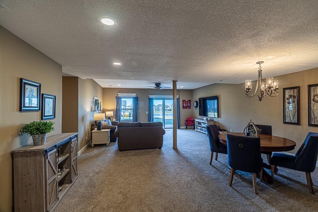 Attention Greystone Buyers!! This immaculate 4 bedroom reverse 1 1/2 story has it all! Beautifully maintained, custom built one owner home features warm wood flooring, upgraded kitchen with large island, stained cabinetry with roll out shelving, deep drawers, pantry and stainless appliances, including refrigerator. The open floor plan is ideal for entertaining or everyday living. The spacious great room is highlighted by an attractive gas fireplace and built-in book cases, tall ceiling and access to the screened deck. Be sure to check out the view of the association pond and common grounds from the deck and patio. The primary suite includes a large bedroom plus walk-in closet, double vanity and attractive tiled shower. Also conveniently located on the main level is the 2nd bedroom, laundry room (washer & dryer stay) and a 3 car attached garage. The tastefully finished lower level boasts a well lighted family room that includes a kitchenette, 2 additional bedrooms, 3/4 bath and storage room. Easy access to the expanded patio from the family room for additional enjoyment. Additional improvements & upgrades: Garage floor & front stoop epoxy finish, humidifier on the furnace, lawn irrigation system, water softener, garage cabinets added, professional landscaping. Better check this one out before it's sold! (portable shelving in storage room, slat tool racks & refrigerator in garage do not stay)