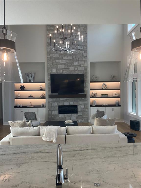This exceptional 1.5 story home is where comfort, style, and functionality come together. 6 beds/6.1 baths + rare 4 car garage situated on quiet culdesac lot! From the moment you step inside, you’ll be captivated by the open-concept design, seamlessly connecting the kitchen, dining, and living areas—perfect for hosting lively gatherings or enjoying cozy evenings at home. The great room is anchored by an impressive floor-to-ceiling stone fireplace, while the chefs dream kitchen shines w/sleek SS appl., a spacious island, HUGE walk-in pantry and ample room to create culinary masterpieces. Just off the kitchen, a flexible bdrm or home office or playroom with a full bth offers the perfect retreat for guests or a quiet space to work remotely with creative statement wall. Practicality meets elegance with a spacious mudroom with built in boot niche that helps to keep life organized and a convenient half bath on the main level. Upstairs, all bedrooms are ensuite and generous in size, offer walk in closets plus share a useful multi-purpose loft and second convenient laundry. The SENSATIONAL finished daylight lower level is a haven for entertainment and relaxation, featuring a full handsome bar (w/ exotic granite) a cozy recreation room, a theatre room, game area an additional bedroom, another full bath and ample storage space. When you’re ready to enjoy the outdoors, step onto the charming screened-in porch with its inviting fireplace or head down to the lower patio to soak in the tranquil backyard views. This home truly has it all (coastal themed wallpaper, decorative trimmed out mirrors, contemporary courtyard garage doors & impressive treatment walls) Welcome to your dream retreat! Tons of upgrades and extras + value priced, the similar Bristol plan sold for 1.8 new construction across the street. WHY BUILD WHEN YOU CAN GET ALL THIS WELL UNDER REPRODUCTION PRICE? Come check out this masterpiece! Located close to the sub. pool & shops at BluHawk with easy highway access!