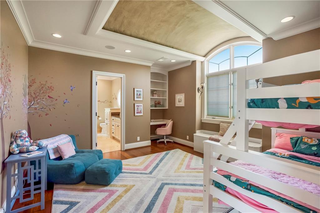 Incomparable custom home designed by Scott Bickford & meticulously built by Charles Kraft. Spectacular views of Shadow Lake & long vista's overlooking the Cedar Creek valley! Recent updates include a completely modernized theater room, new light fixtures & electronics. This phenomenal 5 level property features extensive Brazilian cherry hardwood floors & extensive heated floors as well! Main floor includes a stunning 2-sty Great rm. w/FP, formal dining, Den w/FP, spacious guest suite & casual dining. Dream kitchen features 3 Gaggenau ovens, separate wood front Bosch fridge & freezer, huge walk-in pantry & mud room, twin GE Profile DW's & a 6-burner gas Dacor range! 2nd floor features a spectacular primary suite w/marble bath & FP, custom walk-in shower, expansive walk-in closet, exercise rm., sitting rm., w/adjoining covered deck. Built-ins include a dry-cleaning unit, mini fridge, DW, microwave & make-up vanity w/sink! Three spacious bedrooms all w/private baths & walk-in closets share a versatile loft space. The 3rd floor boasts a large recreation/game rm. & home office, both enjoy the most dramatic views! The finished walkout LL begins with a large Family rm w/stone FP, walk-behind wet bar w/triple Sub Zero fridge/freezer/wine cooler, Meile beverage center, Game rm, 2 additional guest bdrms., full bath, walk-in safe rm & a 22 x 19 tiered Home Theater retreat! Basement level 30' x 25' indoor basketball court w/20 ft. ceilings & climbing wall, which could also be utilized as a golf simulator space, 1/2 pickleball or volleyball court! Over 1,000 sq ft of outdoor paver brick & stained concrete patio space, covered outdoor kitchen & deck w/FP, & plenty of backyard space w/infrastructure in-place to add a swimming pool. Tile roof, circle driveway, exterior constructed with a mix of 100-year-old Coffeyville brick & native limestone. Note: Potential option to enroll children in the Olathe School District if preferred & also close proximity to St. James high school.