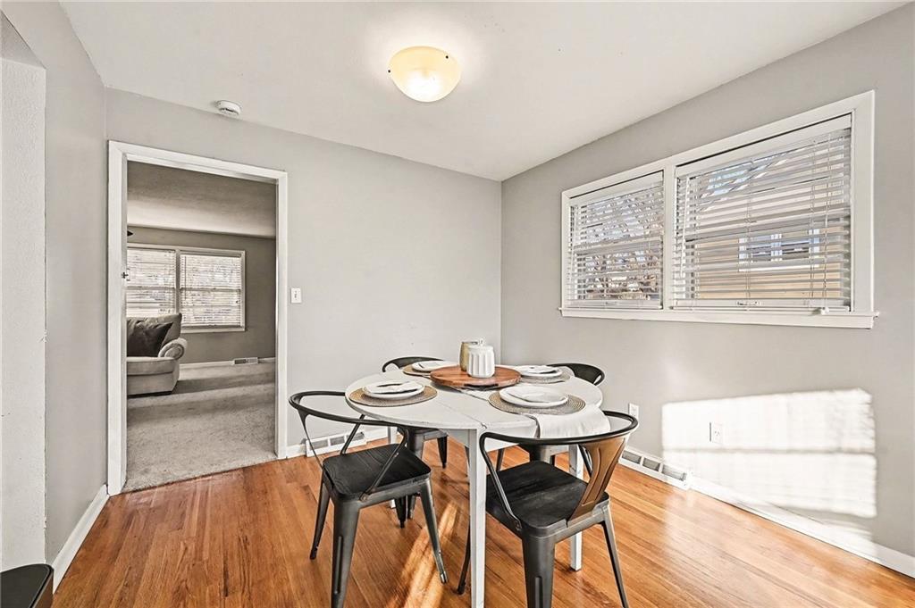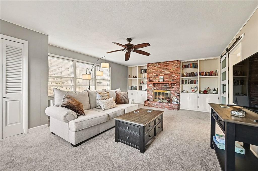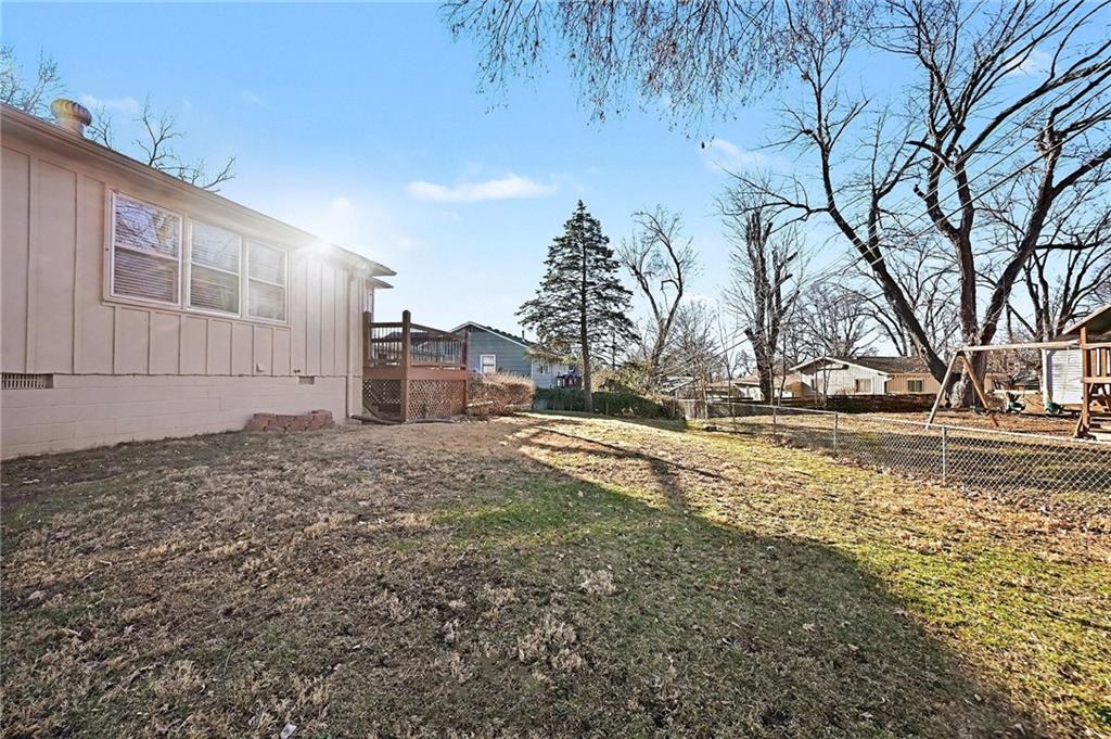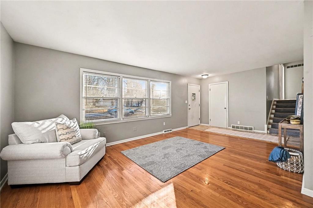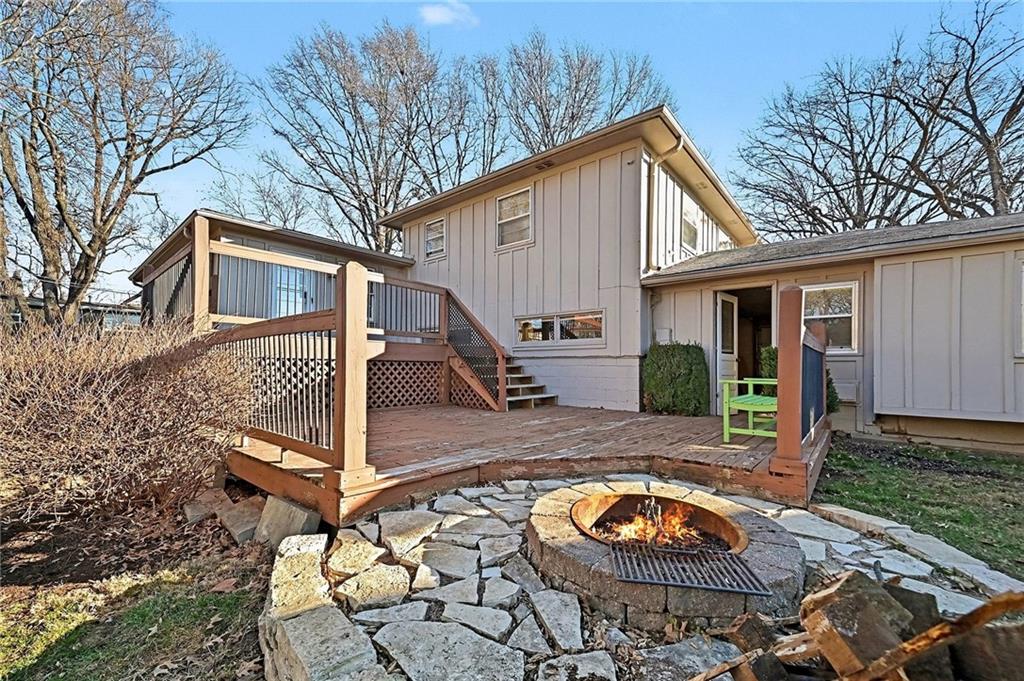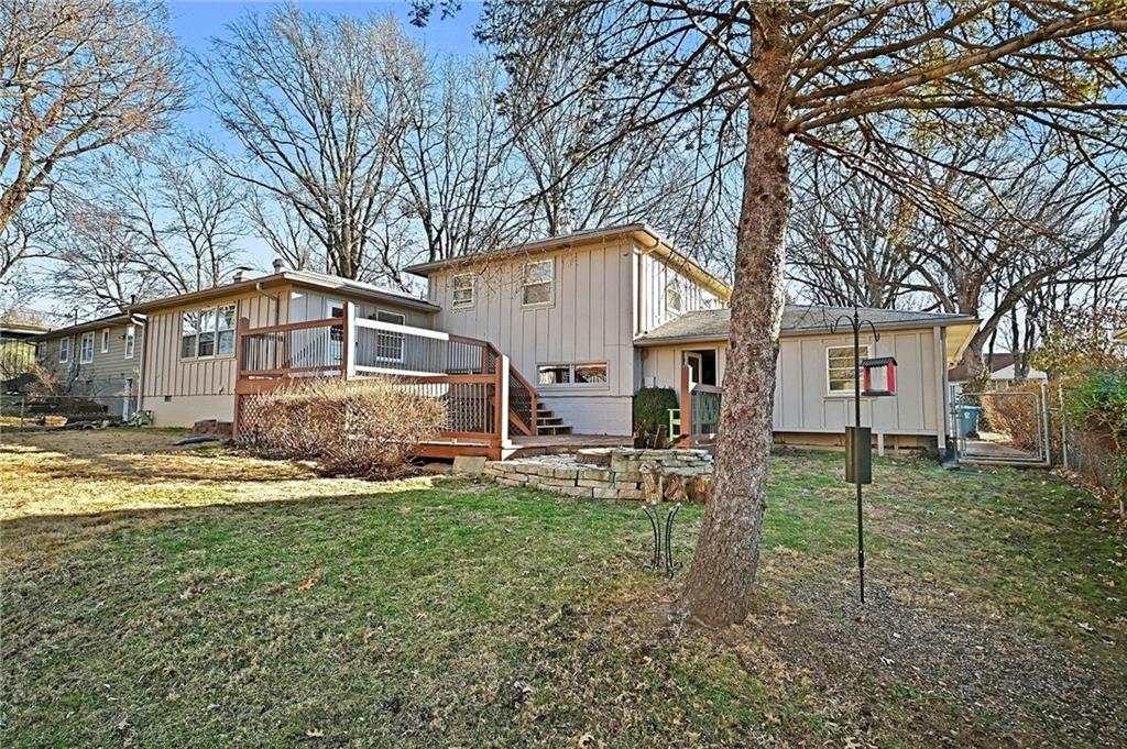 This super cute and unique home is full of charm from the moment you step inside. Wood floors run throughout the home, and newer carpet gives the space a bright and comfortable feel. The front living room welcomes you with an abundance of windows that fill the space with natural light. Just off the living room, the open dining area flows seamlessly into the kitchen, where charming white cabinetry ties the home together perfectly. Through a sliding barn door, you will find a cozy additional living space featuring more windows, a brick fireplace with surrounding built in shelving for added charm and storage, a convenient storage closet, and a classic built in cabinetry bar area that adds character you rarely find in homes today. The lower level offers a large utility room, a full bathroom, a non conforming bedroom, and an additional storage room providing plenty of space for organization. Upstairs, there are three bedrooms, including the primary bedroom with a private half bath ensuite. A full bathroom completes the upper level. Outside, the unique deck wraps beautifully around the fire pit, creating the perfect space for entertaining or relaxing. The spacious, fully fenced yard offers room to play, garden, or simply enjoy the outdoors. Located in a great Prairie Village location and close to Shawnee Mission schools, this home offers both charm and convenience.