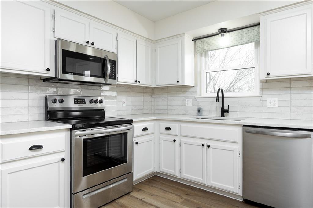 Move in ready, Kearney raised ranch. 3 bed room two full baths and stubbed for a full third bath in unfinished basement. Deep two car rear entry garage, full privacy fenced back yard. Remodeled featuring: New roof and gutters in Oct 2025, all flooring removed to original subfloor and replaced with Luxury Vinyl Plank and carpet. New dishwasher, full interior paint and recent exterior paint. New hot water heater. New quartz counter top and backsplash. New soaker bath tub/shower installed in primary bedroom bath and new vanity and stool. Deck pressure washed, sealed and stained. All windows and doors on main level replaced 2022, furnace and air replaced 2018, and hall bathroom updated in 2023.