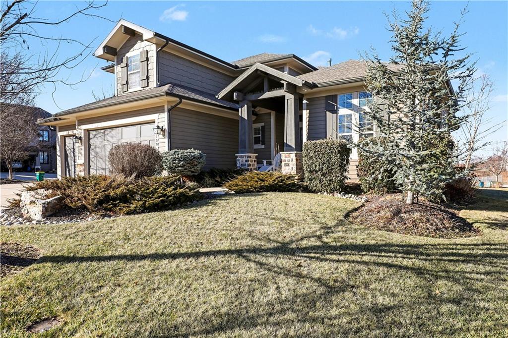 Welcome to 9158 W 178th Terrace, a beautifully maintained Emery Expanded 1.5-story home by James Engle Custom Homes, located on a quiet lot with pond views in the desirable Arbor View subdivision. This elegant home offers 6 bedrooms, 4.5 baths, and a 3-car garage, with an open, light-filled layout and upscale finishes throughout. The gourmet kitchen features granite countertops, a large island, stainless steel appliances, and a walk-in pantry. The main level includes a private primary suite with a spa-like bath and direct access to the laundry room, plus a flexible bedroom or office. Enjoy outdoor living on the covered patio with a fireplace overlooking the beautifully landscaped yard. Upstairs offers spacious bedrooms and a loft, while the finished lower level includes a recreation area, a sixth bedroom with egress, a full bath, and ample storage. Premium upgrades, including trim work, whole-home audio, and landscaping, make this move-in-ready home a must-see in prime Overland Park!