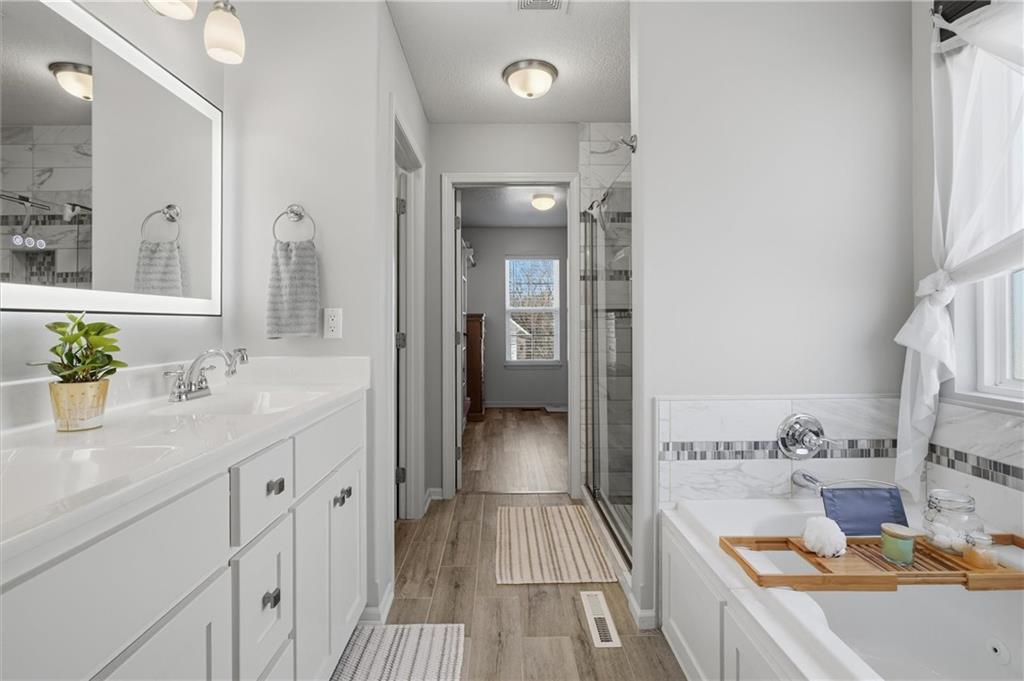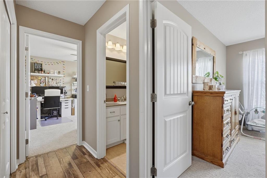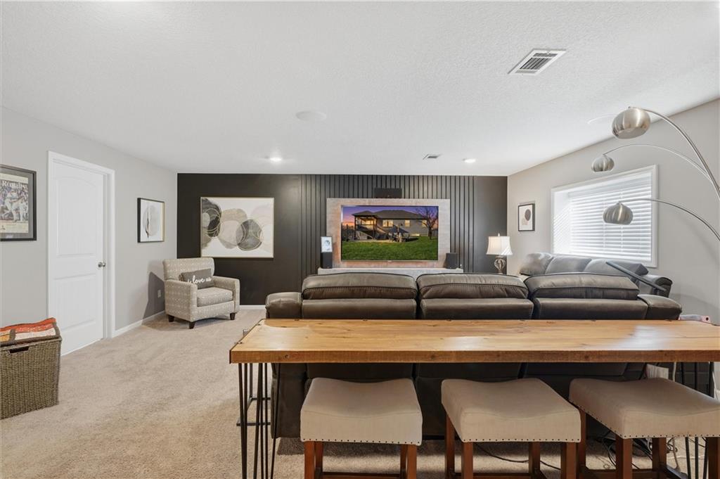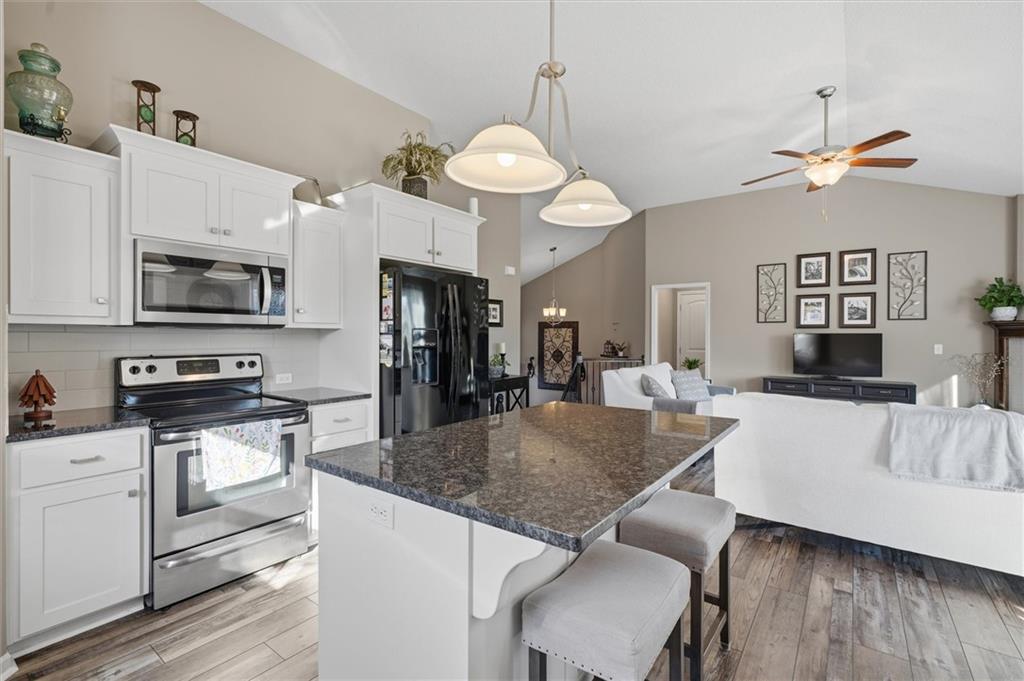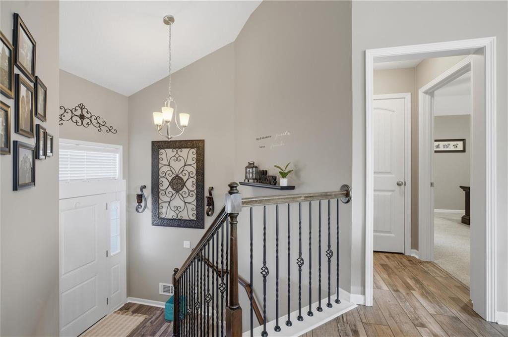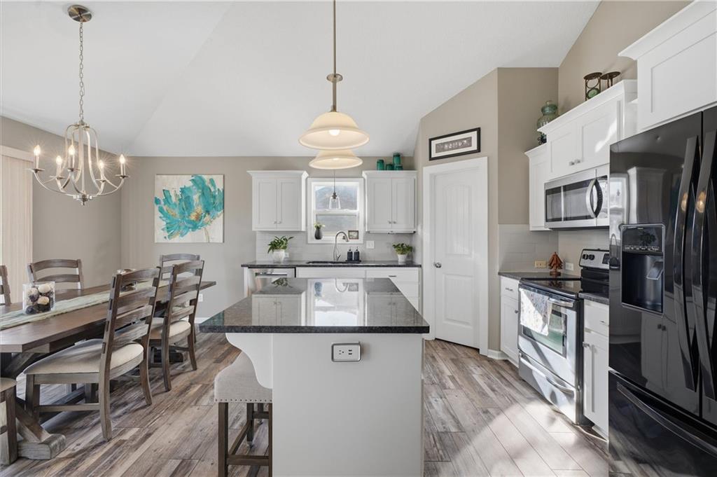 Wide stair entry enhances the curb appeal of this Kansas City address located in the desirable Smithville School District. Step into a spacious entry leading to a light-filled great room with fireplace and an abundance of windows. The open layout flows seamlessly into the kitchen, featuring a granite island with seating, walk-in pantry, tile backsplash, hardwood floors, and an expansive dining area that opens to the deck—perfect for entertaining. The primary suite offers a vaulted ceiling and a luxurious ensuite bath with onyx finishes, double-sink vanity, tile-surround tub, separate shower, and walk-in closet. The finished lower level includes a large family room anchored by a striking dark accent wall with custom slat detailing that defines the entertainment space, plus a bedroom and full bath. A wainscot-accented entry bench off the garage adds both function and style. Outdoor living shines with a freshly stained covered deck, an amazing stamped patio, and a large fenced yard. Enjoy access to the neighborhood pool, adding even more value and convenience for summer fun and community living. FAST AND EASY 435 access