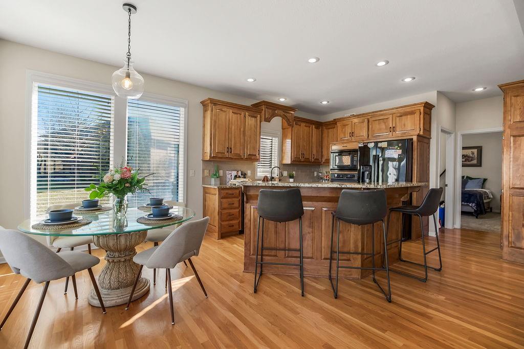 Beautiful 4-bedroom, 4-bathroom ranch home with a 3-car garage in the sought-after Staley Farms neighborhood. This home features a bright, open floor plan with hardwood floors throughout the main living, kitchen, and dining areas, anchored by a stunning fireplace with built-in cabinetry. Large windows fill the space with natural light, creating an airy and inviting feel. The dining and family area opens to an upper-level deck with stairs leading down to the yard-perfect for entertaining or enjoying outdoor living. The finished lower level offers additional living space with hardwood floors, ideal for a rec room, media area, or guest retreat. A thoughtfully designed layout, quality finishes, and a prime location makes this home a must-see.