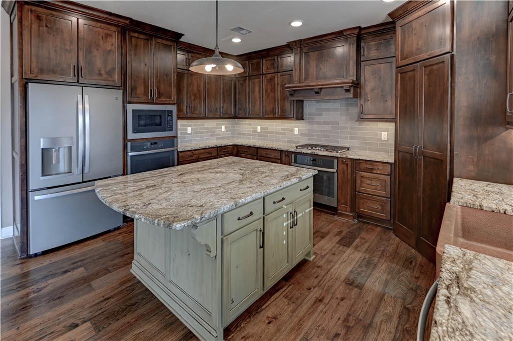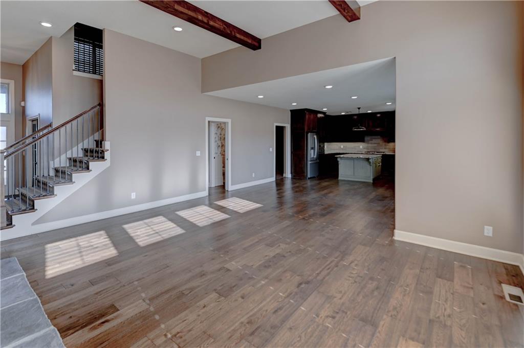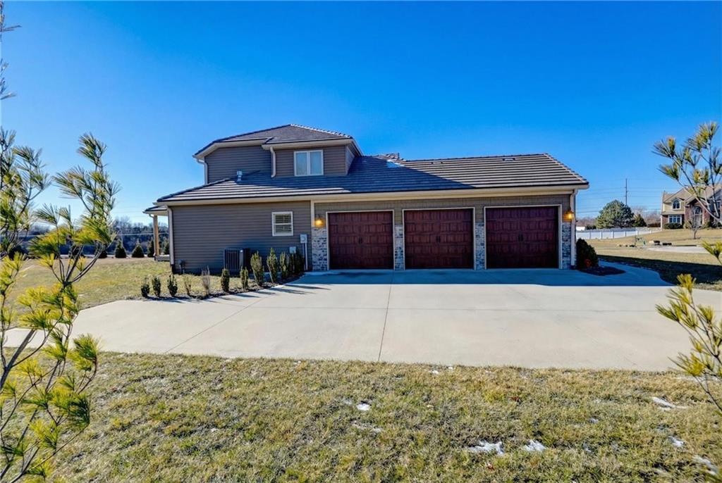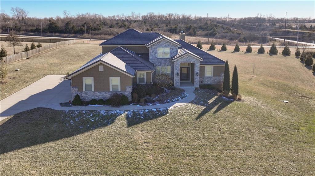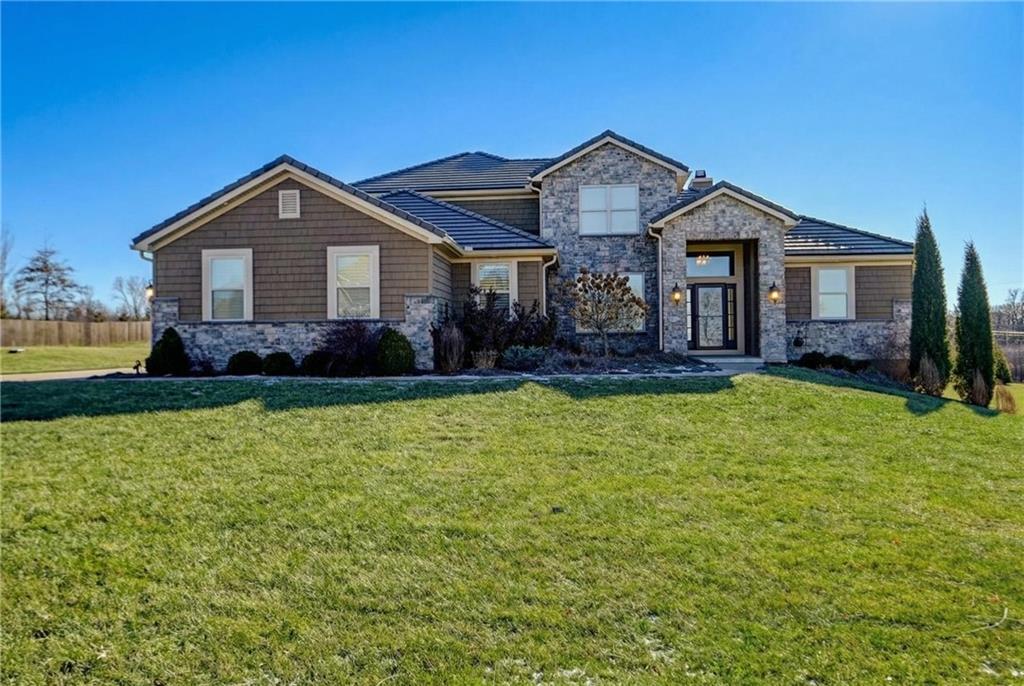 Stunning custom-built Jay Jackson home offering quality craftsmanship and timeless design on 1.5 beautifully landscaped acres. The oversized three-car garage features individual doors, larger bays, workshop space, and a wash sink. A spacious mudroom includes stone paver flooring, seating cubbies, folding area, broom closet, and laundry with cabinets. Hardwood floors flow through the kitchen, dining, and great room. The kitchen is designed for entertaining with GE Profile gas range, custom stained cabinetry, painted oversized island, granite countertops, copper farmhouse sink, and a large walk-in pantry. The dining area opens to a covered patio with ceiling fan. Plantation shutters throughout. The great room features a floor-to-ceiling stone fireplace and exposed beams. A custom half bath adds charm. The office offers wood floors, built-ins, and French doors, ideal for a flex or TV room. The entry showcases a striking light fixture, and the covered front porch is accented with stone. The main-level primary suite includes carpet, ceiling fan, exposed beams, walk-in closet, and master bath with double granite vanities and tiled shower with bench and dual shower heads. The upper level includes a large loft (possible 4th bedroom), two bedrooms with walk-in closets, and a Jack-and-Jill bath. The walk-out lower level is unfinished, plumbed for a bath, and offers excellent expansion potential. Additional highlights include a tile roof, stone and Hardy board siding, and beautiful seasonal landscaping.