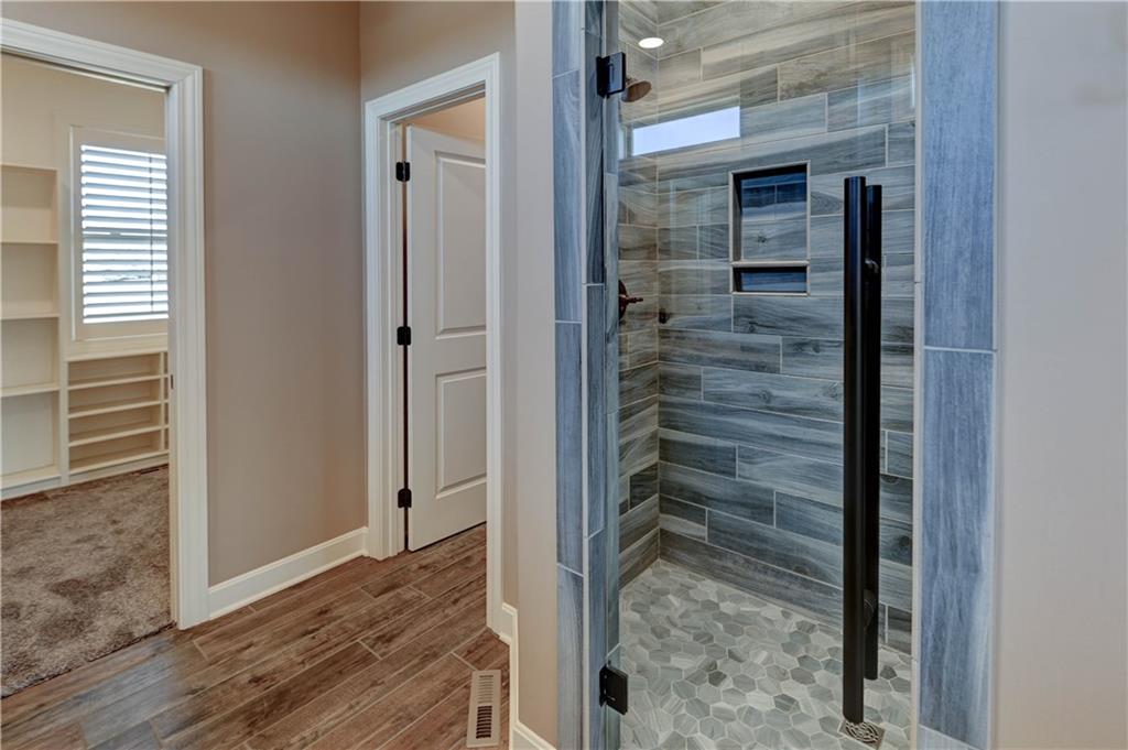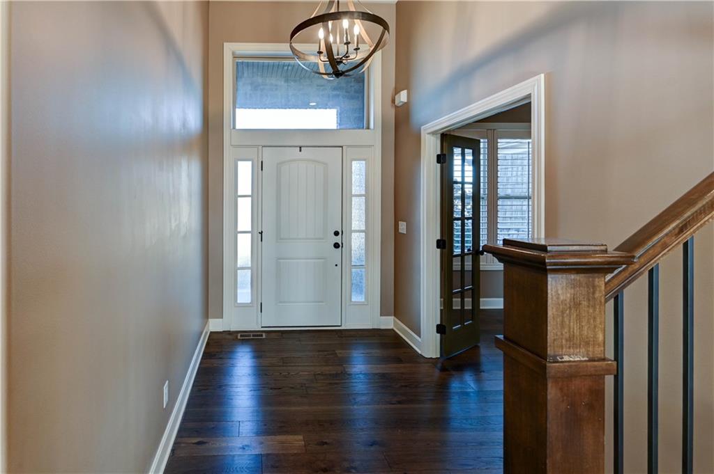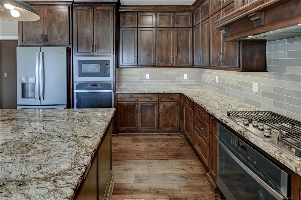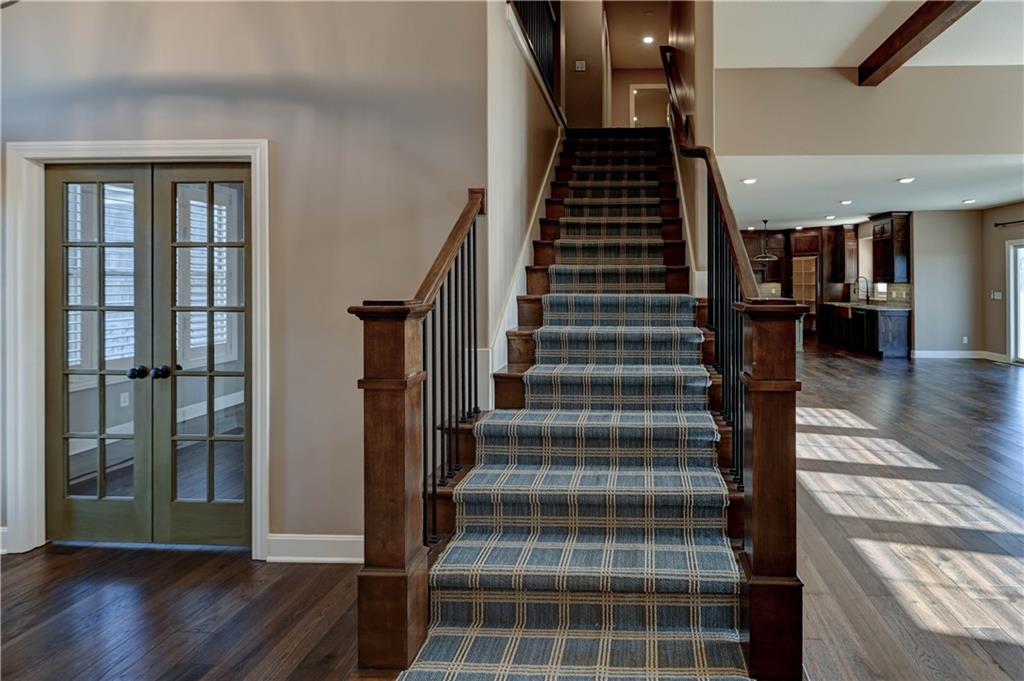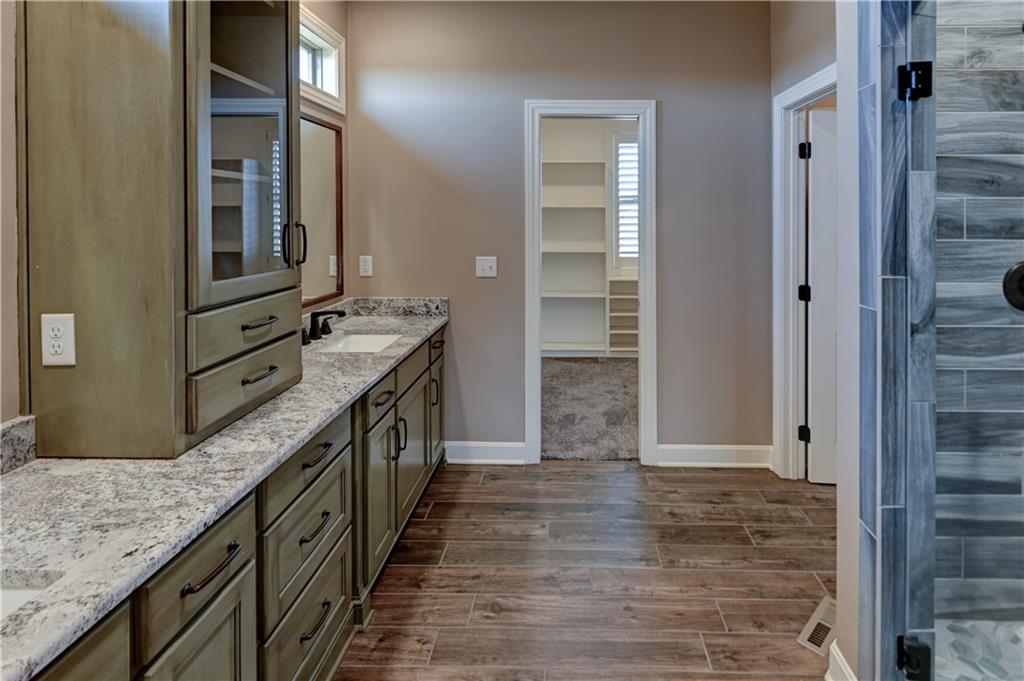 Stunning custom-built Jay Jackson home offering quality craftsmanship and timeless design on 1.5 beautifully landscaped acres. The oversized three-car garage features individual doors, larger bays, workshop space, and a wash sink. A spacious mudroom includes stone paver flooring, seating cubbies, folding area, broom closet, and laundry with cabinets. Hardwood floors flow through the kitchen, dining, and great room. The kitchen is designed for entertaining with GE Profile gas range, custom stained cabinetry, painted oversized island, granite countertops, copper farmhouse sink, and a large walk-in pantry. The dining area opens to a covered patio with ceiling fan. Plantation shutters throughout. The great room features a floor-to-ceiling stone fireplace and exposed beams. A custom half bath adds charm. The office offers wood floors, built-ins, and French doors, ideal for a flex or TV room. The entry showcases a striking light fixture, and the covered front porch is accented with stone. The main-level primary suite includes carpet, ceiling fan, exposed beams, walk-in closet, and master bath with double granite vanities and tiled shower with bench and dual shower heads. The upper level includes a large loft (possible 4th bedroom), two bedrooms with walk-in closets, and a Jack-and-Jill bath. The walk-out lower level is unfinished, plumbed for a bath, and offers excellent expansion potential. Additional highlights include a tile roof, stone and Hardy board siding, and beautiful seasonal landscaping.