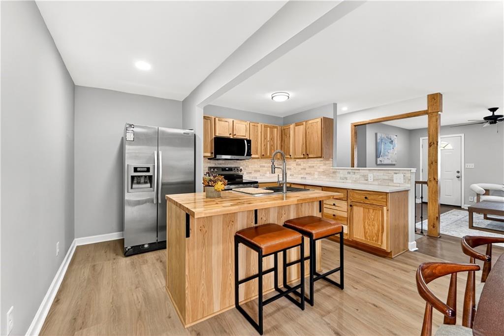 STYLE, SPACE and VALUE come together beautifully in this fully updated ranch—offering incredible versatility at approximately $87 per square foot. With 5 true bedrooms plus a 6th non-conforming bedroom, this home delivers the kind of flexibility today’s lifestyles demand, with room to grow, gather, and truly settle in. The open-concept main level is designed with both everyday living and entertaining in mind. At the heart of the home, the kitchen impresses with brand-new custom cabinetry and a striking statement island—perfect for hosting holidays, weekend brunches, or late-night snacks. The kitchen flows seamlessly into the dining and living areas, where warm finishes and abundant natural light create an inviting, connected space. Step outside to the NEW elevated deck and enjoy peaceful moments overlooking the backyard. Tucked just off the kitchen, the private primary suite offers a quiet retreat from the rest of the home. With THREE dedicated closets, a cozy fireplace, and a stylish en suite bath with tile surround, it’s a space designed for comfort and relaxation. The main level is rounded out by three additional bedrooms and an updated full bathroom, offering plenty of room for family, guests, or home offices. Downstairs a dedicated media area sets the stage for movie nights, while a large bedroom, full bathroom, and an additional expansive family room—filled with natural light—provide endless possibilities. This space could function as a bonus non-conforming bedroom, guest suite, or home studio. The lower level walks out to a covered patio with recessed lighting, creating a private outdoor hangout. With thoughtful updates throughout, including a NEW roof, NEW deck, flexible living spaces, and quick highway access in a convenient location, this home delivers modern comfort, peace of mind, and exceptional value—all while offering privacy for the whole family. Schedule your showing today and experience everything this incredible home has to offer.