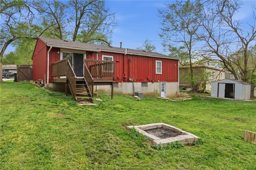 Welcome home to this spacious ranch home located just 10 minutes from the new 2031 season Chiefs stadium! This home combines timeless quality updates with plenty of storage and living space, featuring 3 bedrooms and 1 bath on the upper level and a fourth bedroom, a fifth non-conforming bedroom, and second full bath in the finished walkout basement. The welcoming kitchen features a unique custom epoxy bartop overlooking the dining area. Walk out to the back deck and expansive fenced in backyard, perfect for yard games, firepit cookouts, and all your outdoor activities. You won’t want to miss this gem of a house! Please note that part of the garage has been converted to the dining area living space, so the garage is smaller than the typical garage space. It won't fit most trucks or standard sized SUVs.