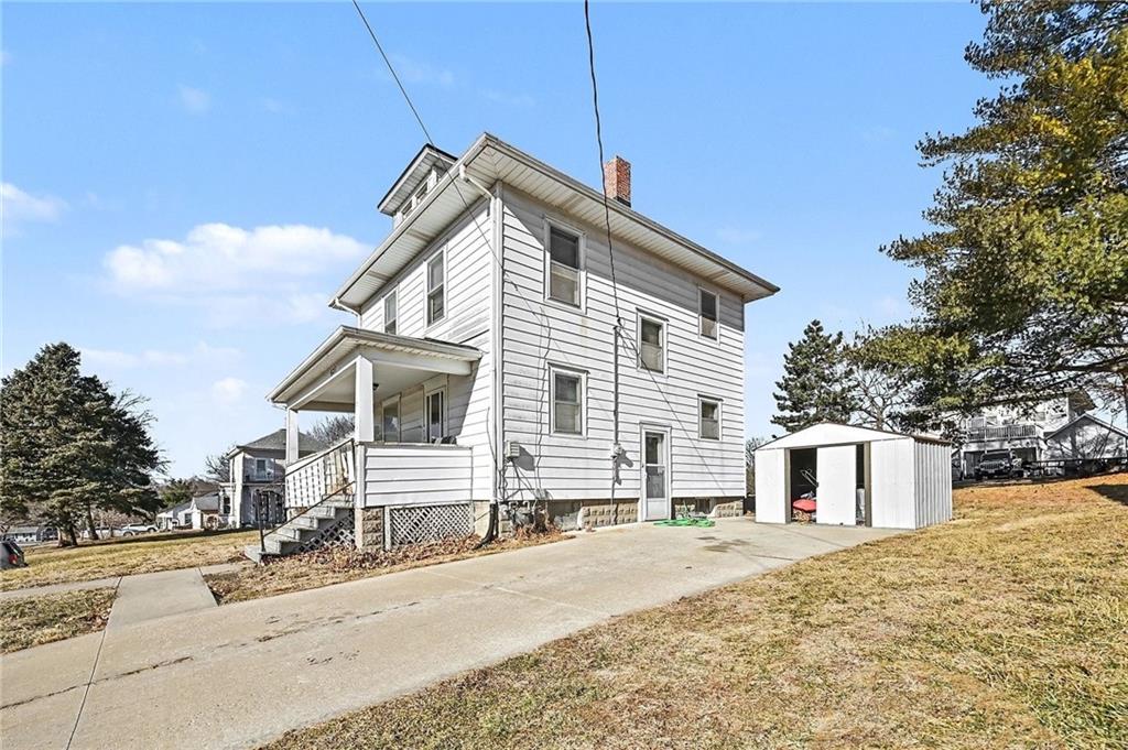 Investment opportunity! This 4 bedroom, 1 bath home would make the perfect rental, flip or first home! Loads of potential with the original hardwood floors, craftsman style trim, beautifully detailed baluster and lovely French doors still intact! Several big ticket updates have already been completed including a new roof, newer furnace and updated bathroom. Full basement offers ample storage space and laundry hook ups. Located on a large corner lot adjacent to Judah Park and just minutes from Northwest Missouri State University! 10x10 storage shed stays with property.