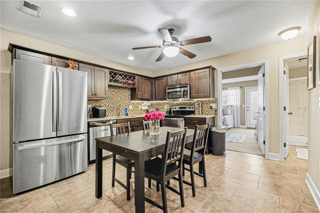 Light, bright, and open, this welcoming Townhome is ready to call home! The open-concept main level features a spacious Living Room with ceiling fan and carpet, flowing seamlessly into the kitchen and dining area. The Kitchen is well-appointed with granite countertops, tile backsplash, stainless steel appliances, a pantry, and a refrigerator included. The Primary Suite is conveniently located just off the kitchen and offers tall ceilings, a walk-in closet, direct bathroom access, and access to the back patio. A main-level washer and dryer are also included for added convenience. Upstairs, you’ll find a generously sized Second Bedroom, a Full Bathroom, and a large Loft featuring a cozy fireplace and walk-in closet—perfect for a home office, media room, or additional living space. Recent updates include a newer HVAC system, refrigerator, washer, and stair carpet. HOA includes exterior maintenance including roof, siding, lawn care and snow removal, and don't miss the Neighborhood Pool!