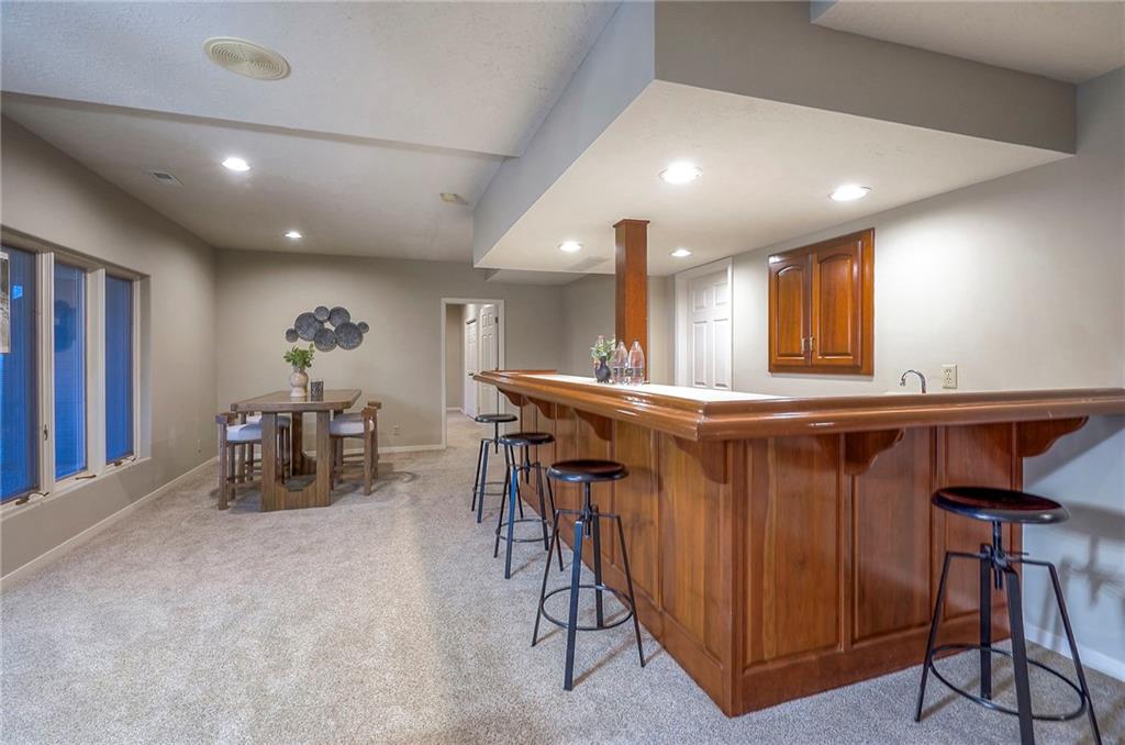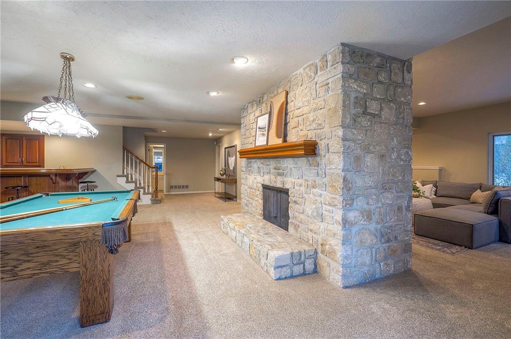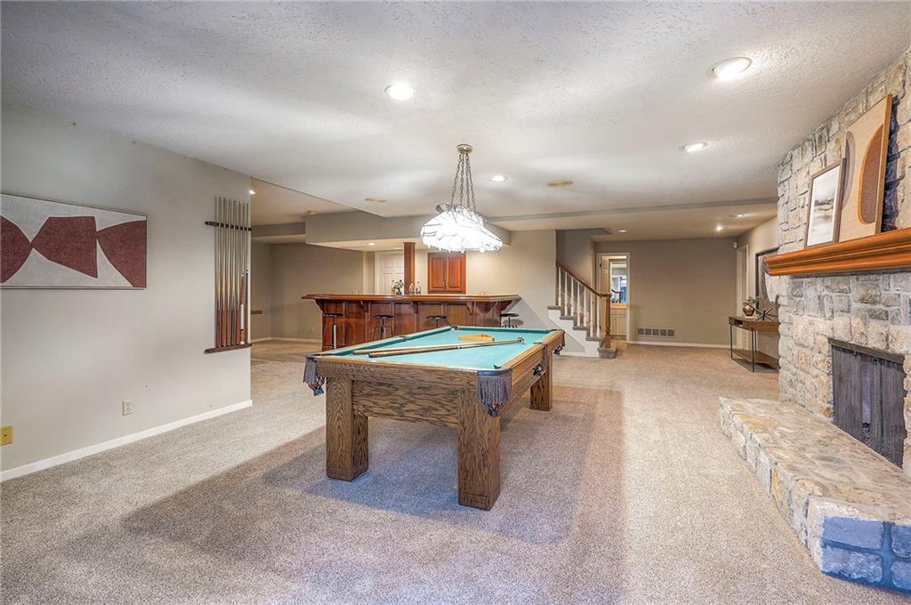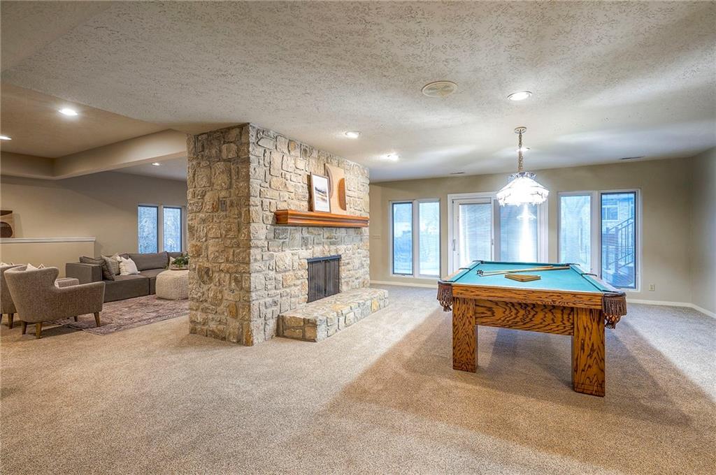 Welcome to this expansive and well-built 1.5-story home offering 4,224 square feet on the main & second floors, plus a large finished walkout basement with 1,500 finished square feet. The home sits on a beautifully landscaped lot in a prime Overland Park location. You’re greeted through a leaded glass front door from a charming courtyard into an impressive two-story entry, where a nearby three-story fireplace anchors the home & immediately showcases its grand scale. The main level features a spacious living room with wood beams, a fireplace & abundant natural light. A large formal dining room easily accommodates entertaining on a grand scale. The kitchen boasts several high-end Wolf appliances & a four-burner gas stove with a griddle. Just off the kitchen is an exceptionally large laundry room. The main-floor primary suite features a vaulted ceiling, generous closet space, and an en-suite bath with separate tub and shower and extensive storage. The second floor offers three very large bedrooms, excellent closets, and two and one-half bathrooms. The half bathroom could potentially become a second laundry room. There is also a bonus room featuring a wet bar, a fireplace and a large vaulted ceiling. It has the potential to serve as a second primary suite. The finished walkout basement is designed for entertaining, with a large bar, multiple gathering areas, wine storage, an additional bedroom and full bath, and access to a spacious patio. There is also significant unfinished space. Additional highlights include a huge deck overlooking the private lot, mature landscaping, a deep side-entry garage well-suited for large SUVs, trucks, and storage, zoned HVAC, partial HVAC replacement, and a major investment in several newer windows. This home offers a rare opportunity—exceptional bones, generous proportions, and a premier location with excellent schools, quick highway access, and nearby shopping and dining—ready for the next owner to bring their design vision to life.