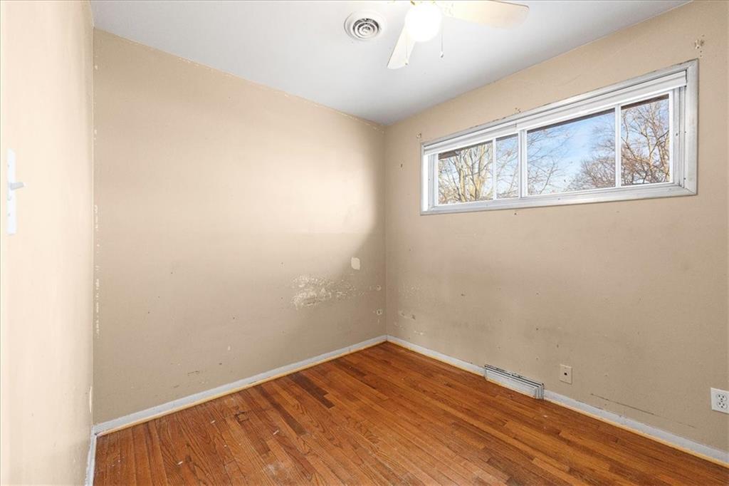 This classic ranch offers a straightforward layout and solid fundamentals, ready for its next chapter. The main level features three bedrooms, a full bath, original hardwood floors throughout, and large windows that draw in natural light. The living and dining areas flow into an updated kitchen with abundant cabinet space, tile flooring, and a functional workspace overlooking the backyard. A full basement expands the usable square footage, providing a wide-open area for storage and hobbies along with a separate finished room that can flex to a variety of needs. The attached garage offers convenient parking and additional utility space. Outside, the fenced yard includes mature trees and a storage shed, with plenty of room for future landscaping or outdoor projects. Located on a quiet street with quick highway access and nearby conveniences, this home is an excellent opportunity for investors, first-time buyers, or anyone looking to add value through updates while building equity.