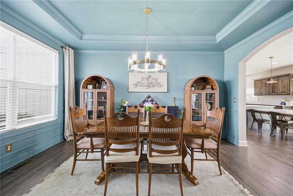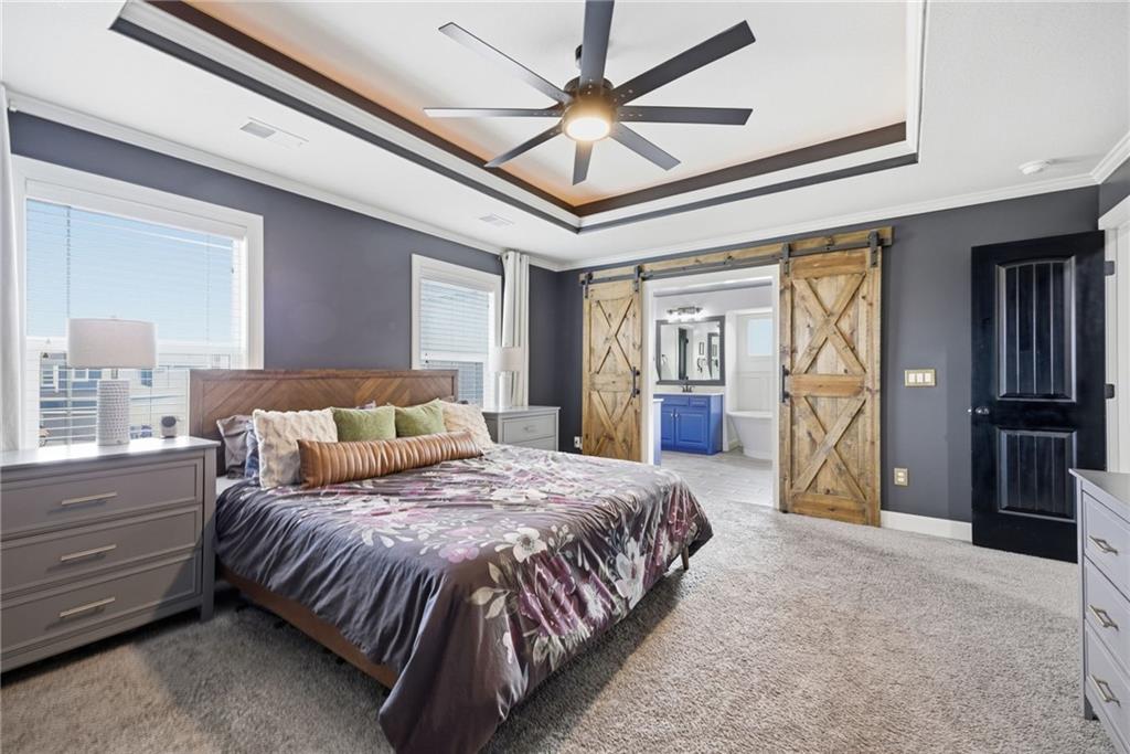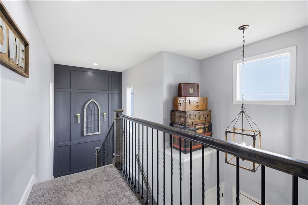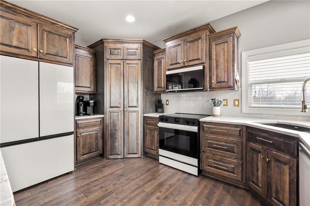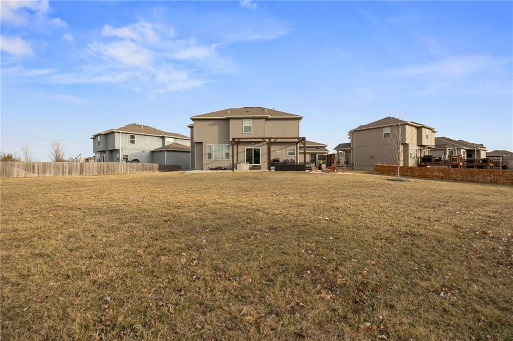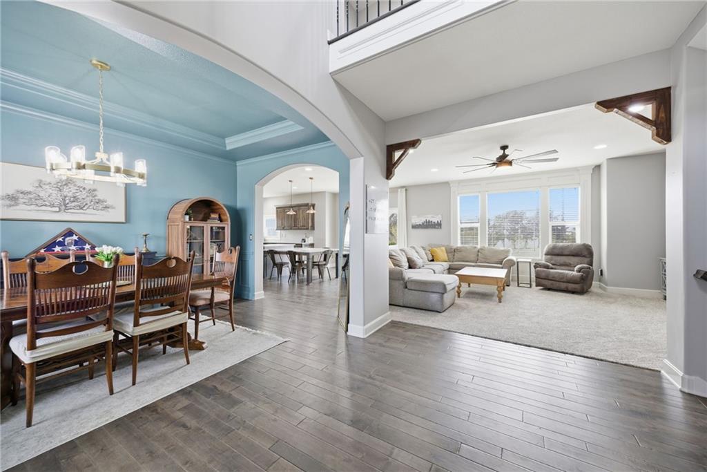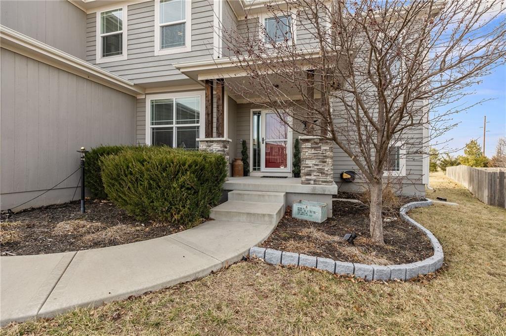 Stunning two-story home in sought-after Heather Ridge South, perfectly situated in south Olathe and located within the highly regarded Spring Hill School District. This move-in-ready home is filled with modern updates throughout, including fresh paint, new appliances, new great room carpet, and new decorative stair carpeting. Step inside to rich, dark hardwood floors and an inviting main level designed for both everyday living and entertaining. To the left, a flexible formal dining room or home office features wide arched doorways, while straight ahead the great room impresses with a gas fireplace accented by a stone ledge surround, modern built-in hanging shelves, and a wall of windows overlooking the expansive patio. The adjoining breakfast area offers a built-in quartz breakfast table and walk-out access to outdoor living, seamlessly connecting to the updated kitchen with new glass-front appliances, dark stained cabinetry, corner sink, quartz countertops, a quartz island that flows into the breakfast table, and a walk-in corner pantry. A short hallway leads to the interior garage entrance with a functional mudroom featuring coat hooks, shoe cubbies, and bench seating, along with a convenient main-level half bath. Newly carpeted decorative stairs lead to the private bedroom level. The primary suite showcases French doors, a stepped ceiling, accent wall, and dual sliding barn doors opening to a spa-like bath with tiled floors, dual vanities, soaking tub, separate shower, and walk-in closet. Two additional bedrooms offer walk-in closets and ceiling fans and share a Hollywood bath with double vanity and tub/shower. The fourth bedroom features luxury vinyl plank flooring, walk-in closet, and private bath. The finished lower level expands living space with luxury vinyl plank flooring, a recreation area with bar and built-ins, a large family room with integrated Murphy bed and bookshelves, and a full bath with subway tile shower.