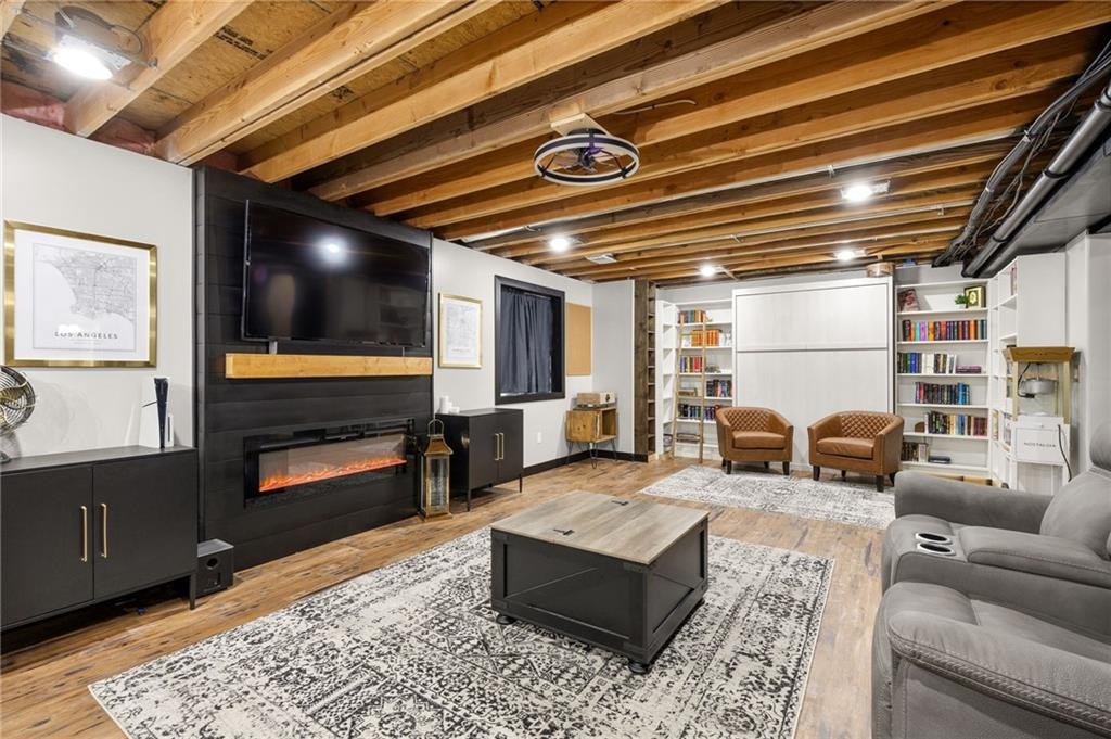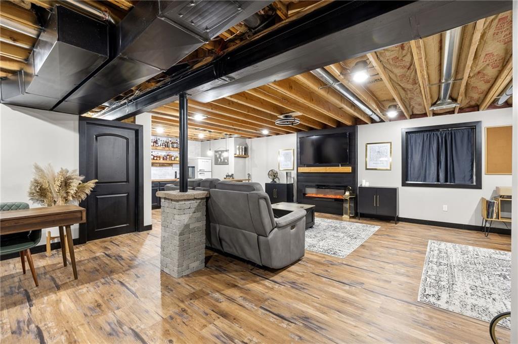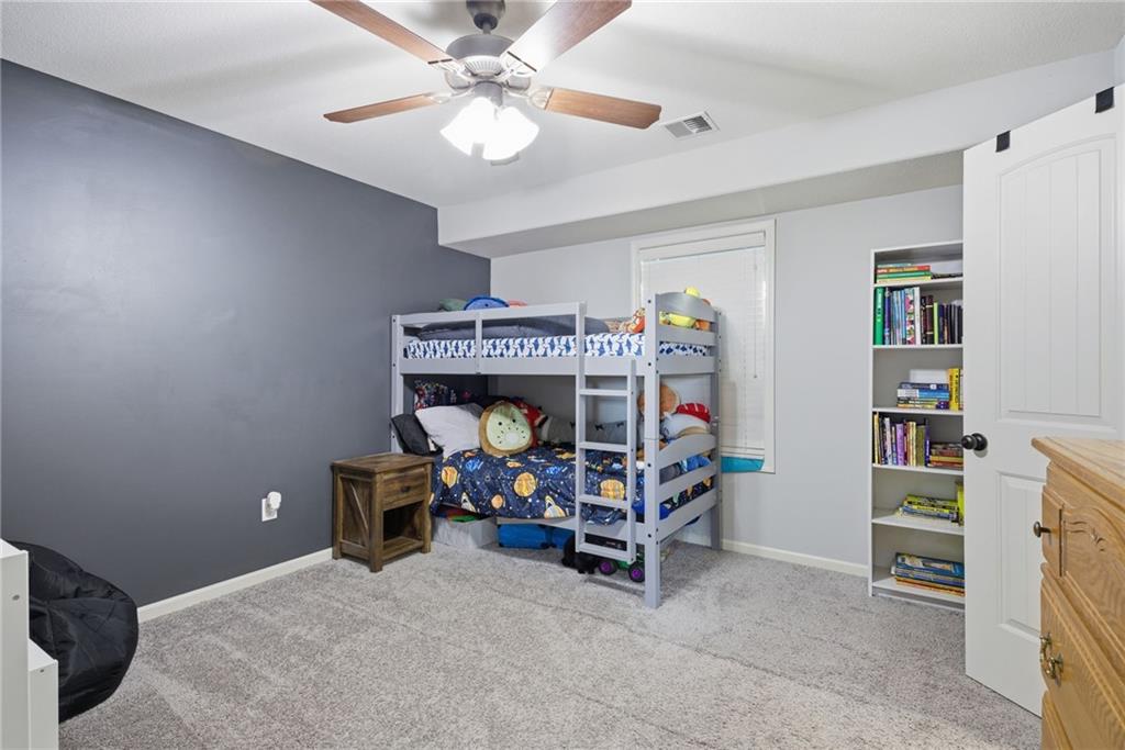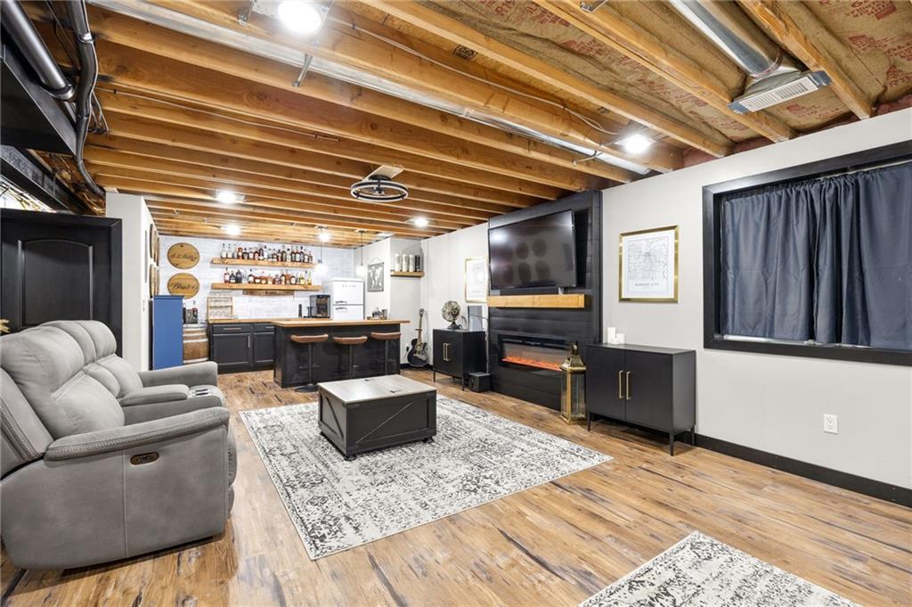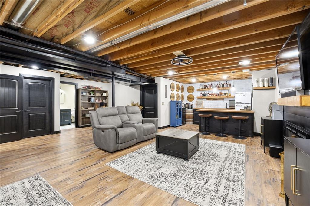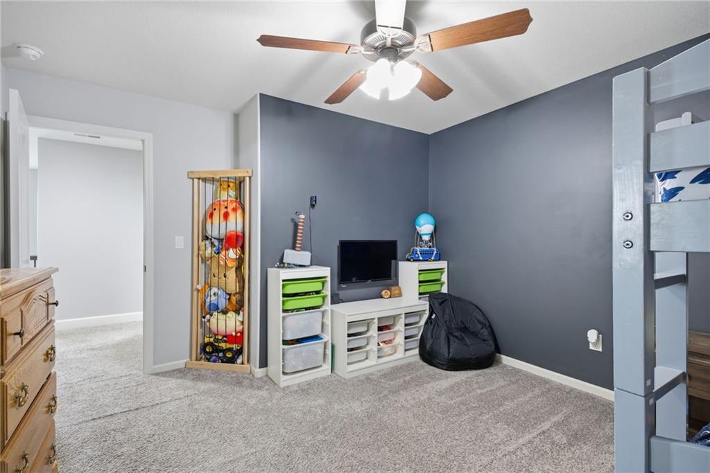 Stunning two-story home in sought-after Heather Ridge South, perfectly situated in south Olathe and located within the highly regarded Spring Hill School District. This move-in-ready home is filled with modern updates throughout, including fresh paint, new appliances, new great room carpet, and new decorative stair carpeting. Step inside to rich, dark hardwood floors and an inviting main level designed for both everyday living and entertaining. To the left, a flexible formal dining room or home office features wide arched doorways, while straight ahead the great room impresses with a gas fireplace accented by a stone ledge surround, modern built-in hanging shelves, and a wall of windows overlooking the expansive patio. The adjoining breakfast area offers a built-in quartz breakfast table and walk-out access to outdoor living, seamlessly connecting to the updated kitchen with new glass-front appliances, dark stained cabinetry, corner sink, quartz countertops, a quartz island that flows into the breakfast table, and a walk-in corner pantry. A short hallway leads to the interior garage entrance with a functional mudroom featuring coat hooks, shoe cubbies, and bench seating, along with a convenient main-level half bath. Newly carpeted decorative stairs lead to the private bedroom level. The primary suite showcases French doors, a stepped ceiling, accent wall, and dual sliding barn doors opening to a spa-like bath with tiled floors, dual vanities, soaking tub, separate shower, and walk-in closet. Two additional bedrooms offer walk-in closets and ceiling fans and share a Hollywood bath with double vanity and tub/shower. The fourth bedroom features luxury vinyl plank flooring, walk-in closet, and private bath. The finished lower level expands living space with luxury vinyl plank flooring, a recreation area with bar and built-ins, a large family room with integrated Murphy bed and bookshelves, and a full bath with subway tile shower.