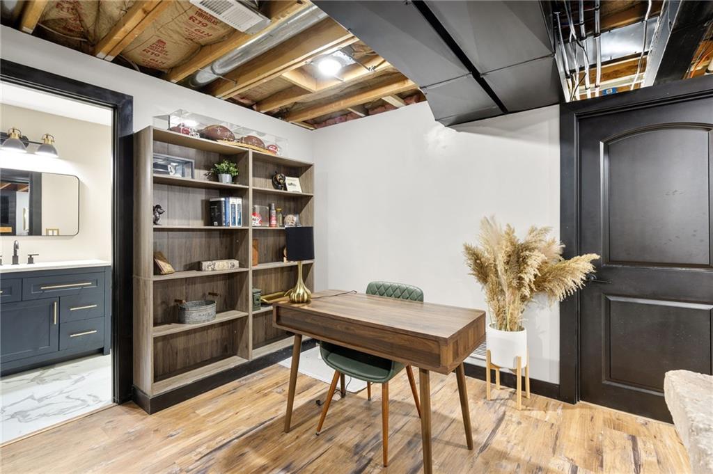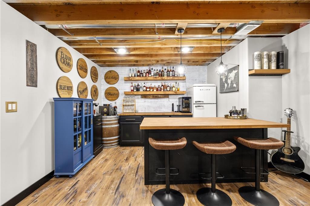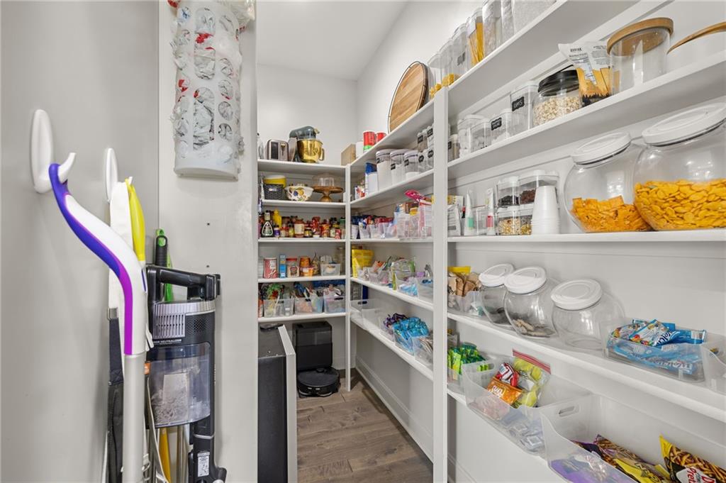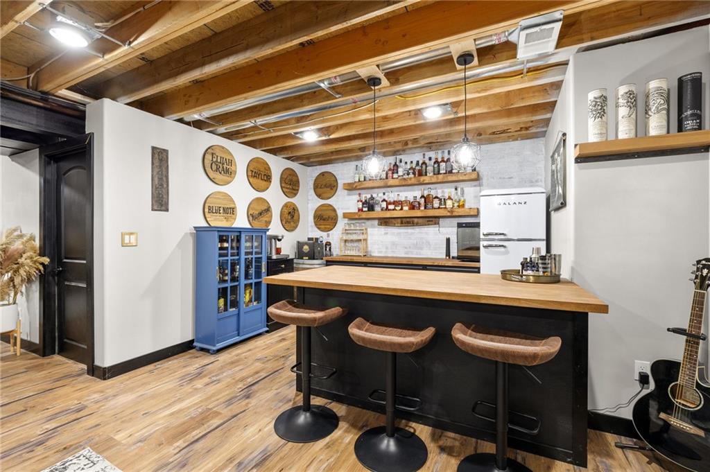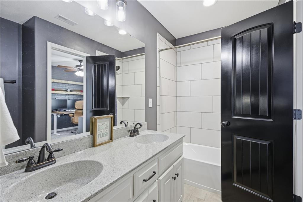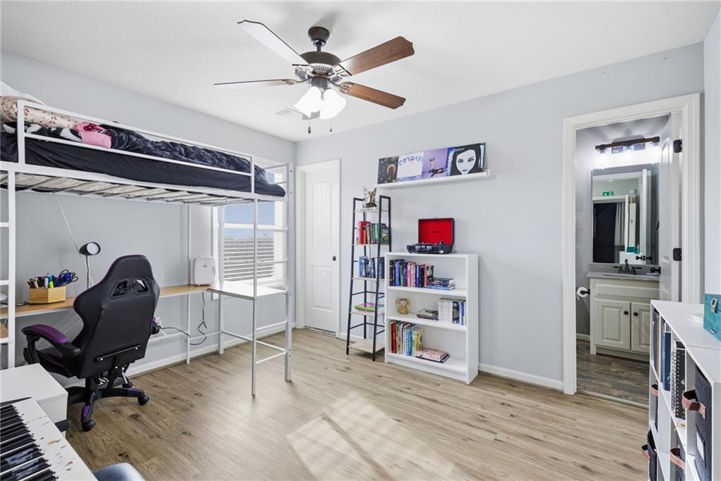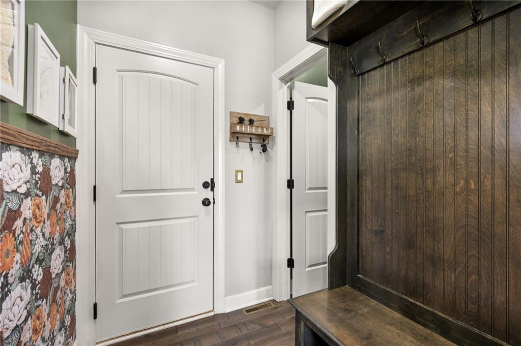 Stunning two-story home in sought-after Heather Ridge South, perfectly situated in south Olathe and located within the highly regarded Spring Hill School District. This move-in-ready home is filled with modern updates throughout, including fresh paint, new appliances, new great room carpet, and new decorative stair carpeting. Step inside to rich, dark hardwood floors and an inviting main level designed for both everyday living and entertaining. To the left, a flexible formal dining room or home office features wide arched doorways, while straight ahead the great room impresses with a gas fireplace accented by a stone ledge surround, modern built-in hanging shelves, and a wall of windows overlooking the expansive patio. The adjoining breakfast area offers a built-in quartz breakfast table and walk-out access to outdoor living, seamlessly connecting to the updated kitchen with new glass-front appliances, dark stained cabinetry, corner sink, quartz countertops, a quartz island that flows into the breakfast table, and a walk-in corner pantry. A short hallway leads to the interior garage entrance with a functional mudroom featuring coat hooks, shoe cubbies, and bench seating, along with a convenient main-level half bath. Newly carpeted decorative stairs lead to the private bedroom level. The primary suite showcases French doors, a stepped ceiling, accent wall, and dual sliding barn doors opening to a spa-like bath with tiled floors, dual vanities, soaking tub, separate shower, and walk-in closet. Two additional bedrooms offer walk-in closets and ceiling fans and share a Hollywood bath with double vanity and tub/shower. The fourth bedroom features luxury vinyl plank flooring, walk-in closet, and private bath. The finished lower level expands living space with luxury vinyl plank flooring, a recreation area with bar and built-ins, a large family room with integrated Murphy bed and bookshelves, and a full bath with subway tile shower.