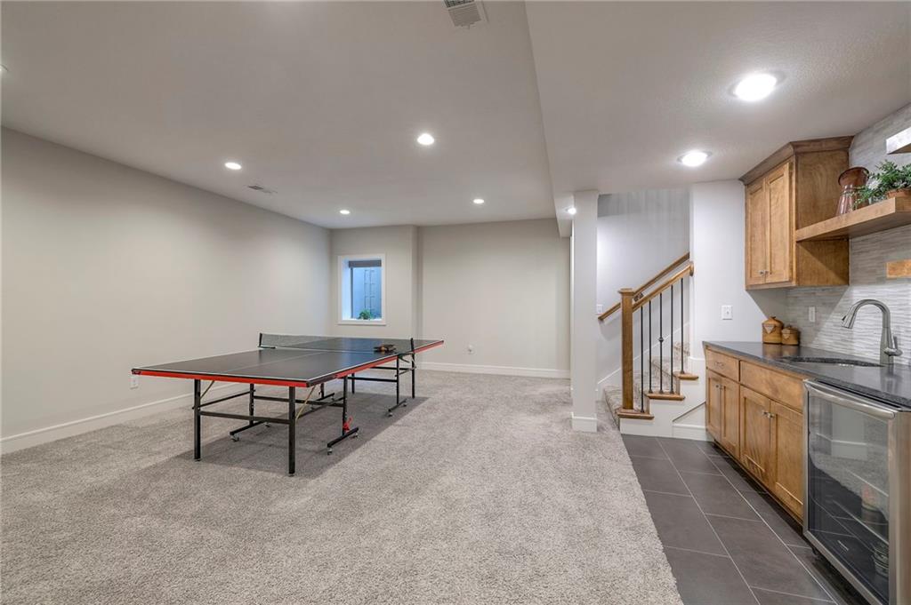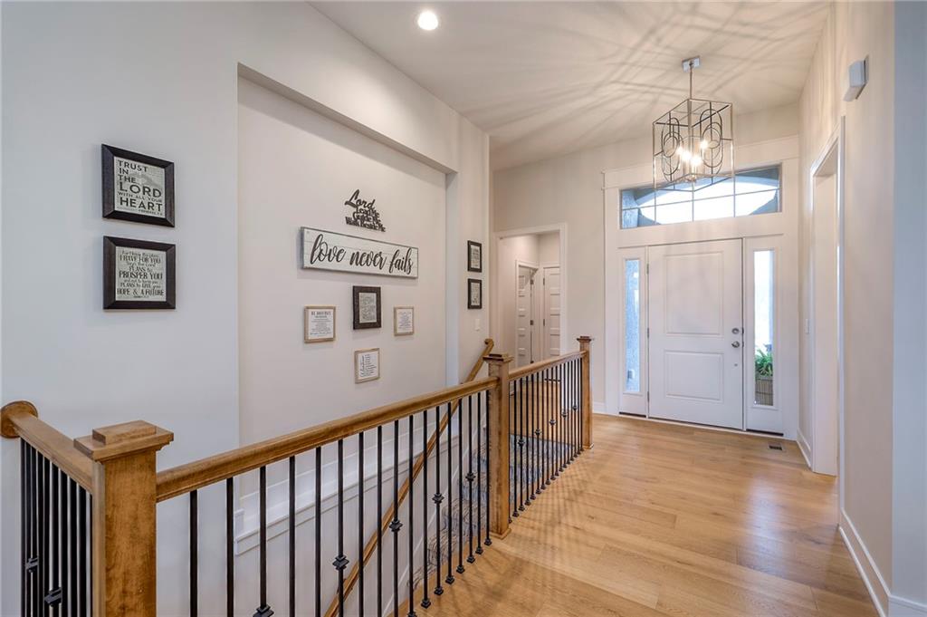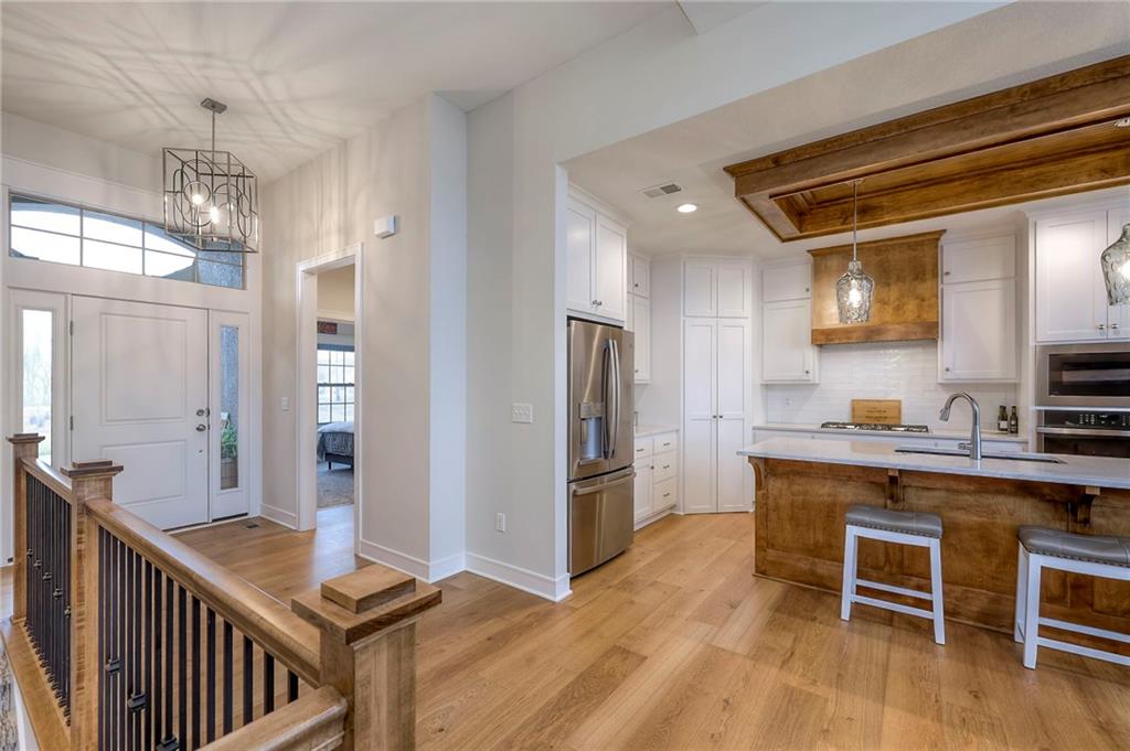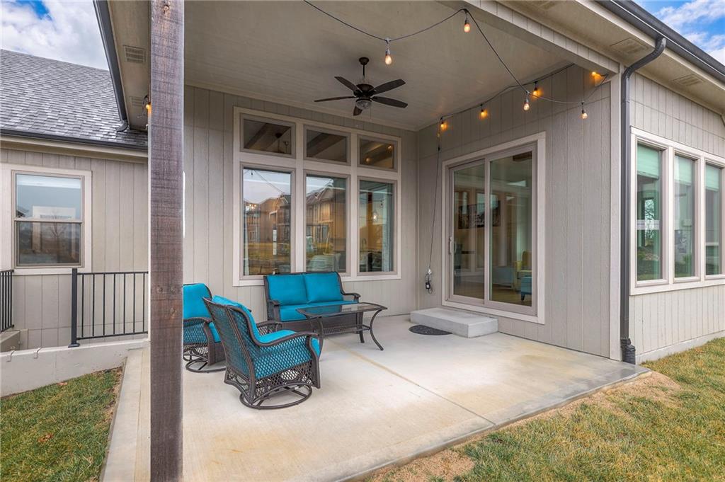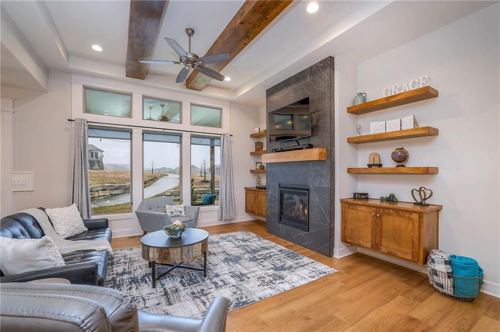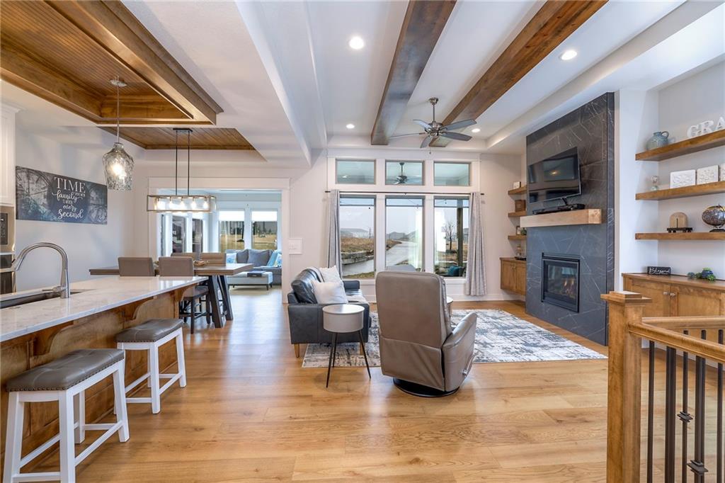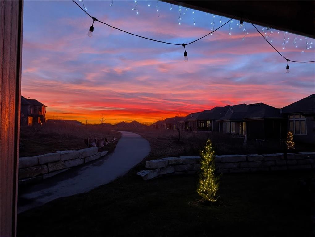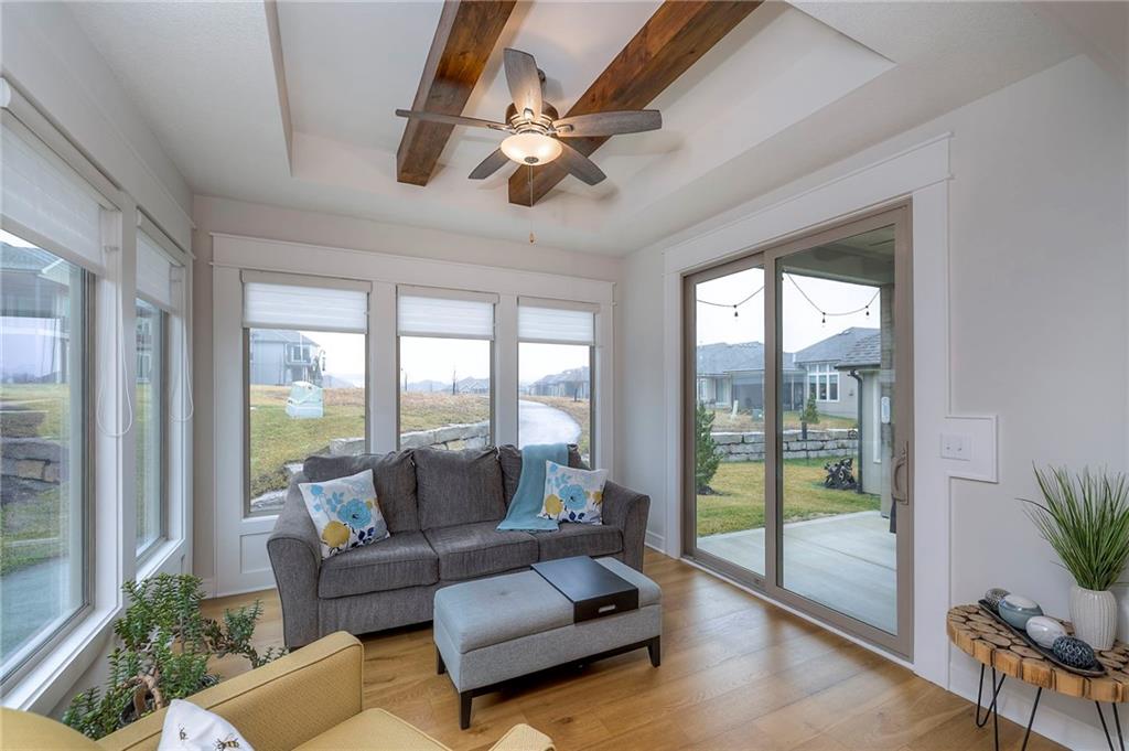 Welcome to the Catalina with Sunroom by Crestwood Custom Homes! A beautifully designed and expanded reverse 1.5-story patio villa built in 2021 offering 3,052 square feet of upscale, low-maintenance living. This well maintained, move in ready home, feels brand new, but better! No need to worry about purchasing window coverings, and paying the higher price tag that comes with new construction. From the moment you step inside, the 10-foot ceilings, walls of windows, and wide-plank hardwood floors create a bright and open feel. The great room features a stunning box-vaulted ceiling with beams, custom-built-ins, and a cozy gas fireplace—the perfect centerpiece for everyday living or entertaining. The kitchen is equally impressive with a large quartz island, gas cooktop, built-in oven, painted custom cabinetry, walk-in pantry, and modern finishes throughout. The main-level primary suite truly feels like a retreat, complete with a zero-entry walk-in shower, freestanding soaking tub, and spa-like finishes. An additional bedroom and the beautiful sunroom, filled with natural light, complete the main floor. The finished lower level is ideal for entertaining, featuring a spacious family room and walk-up bar with sink, mini fridge, and quartz/granite countertops. Two additional bedrooms (one with double doors, perfect for an office or exercise room) and a full bath offer flexible living options. The icing on the cake for this home will be the gorgeous sunsets and peaceful views you will have from your sunroom and covered patio. No matter the season, this home offers year round views and comforts. Located close to shopping, dining, and everyday conveniences, this barely lived in home offers the perfect blend of luxury, ease, and modern design, without the wait of building new.