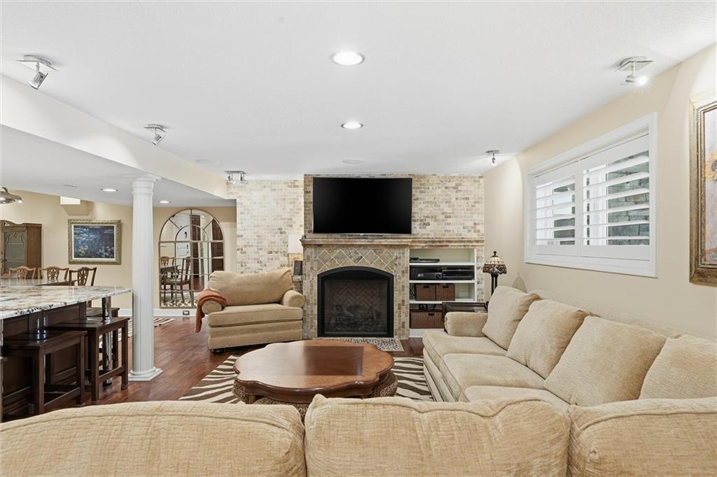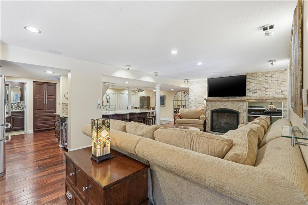 Exceptional luxury living awaits in Nottingham by the Green. Tucked on a quiet cul-de-sac, this updated residence offers 5 bedrooms plus nursery/office, 5.1 baths, four living areas, and two full kitchens, making it ideal for entertaining, multigenerational living, or extended guest stays. The home features laundry on each level, abundant storage, and custom built-ins throughout. The main-level gourmet kitchen is a showpiece, featuring high-end appliances, dual dishwashers, dual-fuel range with grill and griddle, steam oven, built-in refrigerator and freezer towers, wine refrigerator, trash compactor, two sinks with instant hot water, walk-in pantry, custom cabinetry, and granite counters with stone accents. A spacious eating area adjoins the kitchen and hearth room. The home offers four bedrooms upstairs and two sleeping areas in the basement, one serving as a secondary primary suite and an additional flex room. There is also a built-in Murphy bed in the living area. All bathrooms have been updated, featuring heated tile floors in both primary baths, towel warmers, custom vanities with granite, and thoughtful details throughout. The finished walkout basement functions as a home of its own, complete with living and dining areas, full kitchen with professional appliances, gas fireplace, engineered wood and tile flooring, laundry room, specialty vented exterior doors, and abundant storage, including plumbed unfinished utility space. The oversized side-entry garage offers extra depth, epoxy floors, insulated carriage doors, insulated walls/ceiling, smart openers, overhead storage, insulated attic, ceiling fans, and exceptional functionality. The exterior is equally impressive, with elegant stone and stucco finishes, expansive windows, and multiple outdoor living areas. The property sits on a meticulously landscaped lot with mature trees, manicured gardens, and lush green spaces. Enjoy the spacious patio and room for entertaining or relaxing outdoors.