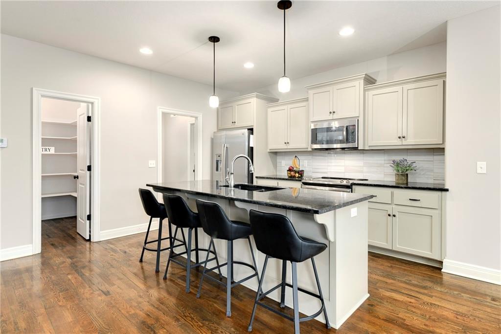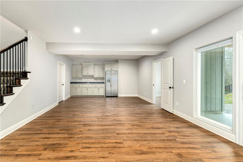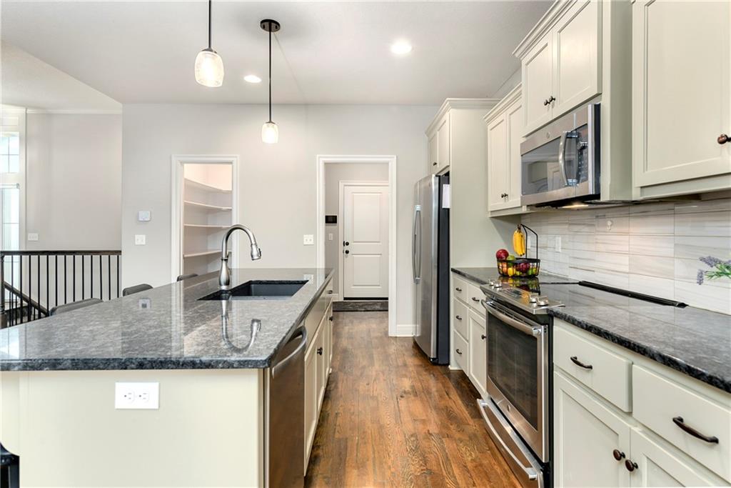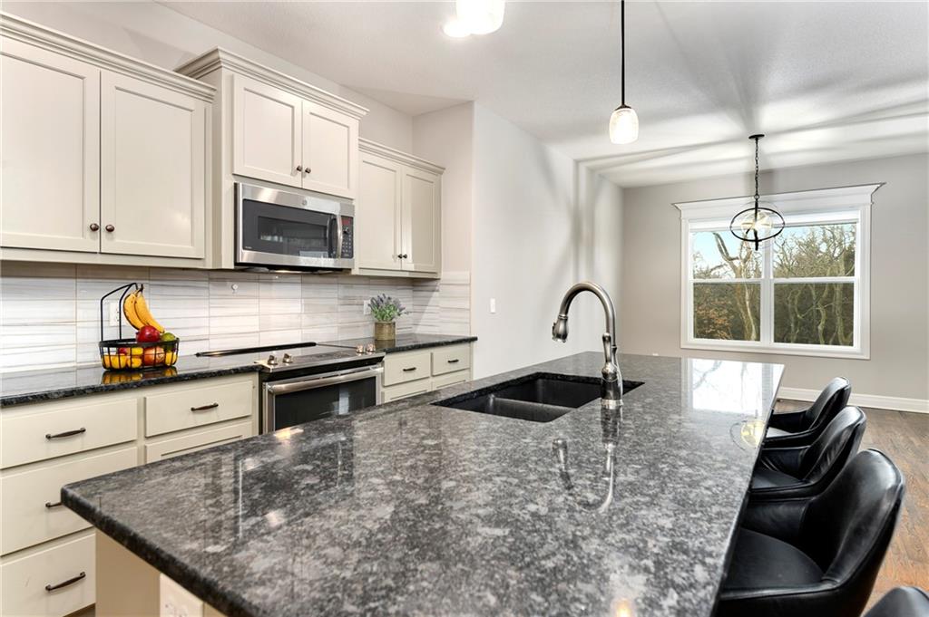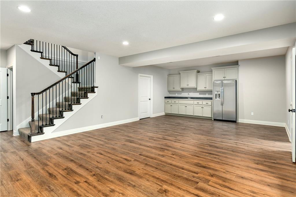 This stunning reverse 1.5-story home is nestled on an oversized lot backing to lush, mature trees—offering privacy and serene views. Enjoy outdoor living with a private balcony off the main living room and a spacious patio from the finished walk-out basement. On the main level you will enjoy hardwoods and tile, an open kitchen, dining room, and living room, along with a bathroom, deluxe bedroom, master bedroom suite, laundry room, and garage. On the lower level, you will enjoy LVP flooring, a full bathroom with a walkin shower, a partial kitchen, tons of storage, 2 true bedrooms, and another bonus room for whatever your heart desires (it is currently being used as a small 5th bedroom without a closet). The home includes three oversized garages, perfect for extra storage or a workshop. Lovingly built by its original owners as their forever home, no detail was overlooked—many thoughtful upgrades were added throughout, including tankless water heater, whole home water filtration system, jellyfish lighting, a black metal fence, epoxy floor coating and a separate heat/air unit in the garage. Located in a wonderful community with access to a fantastic pool, this home truly has it all! Welcome Home.