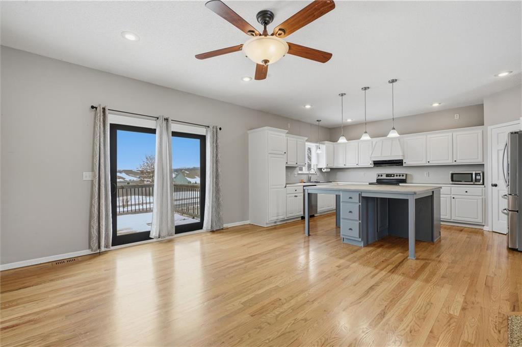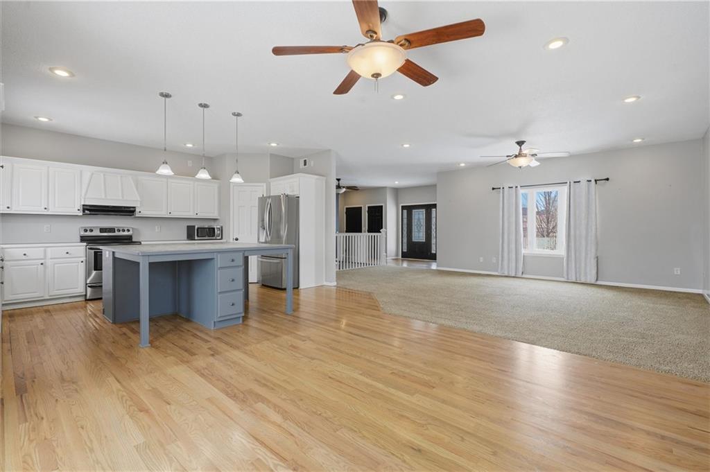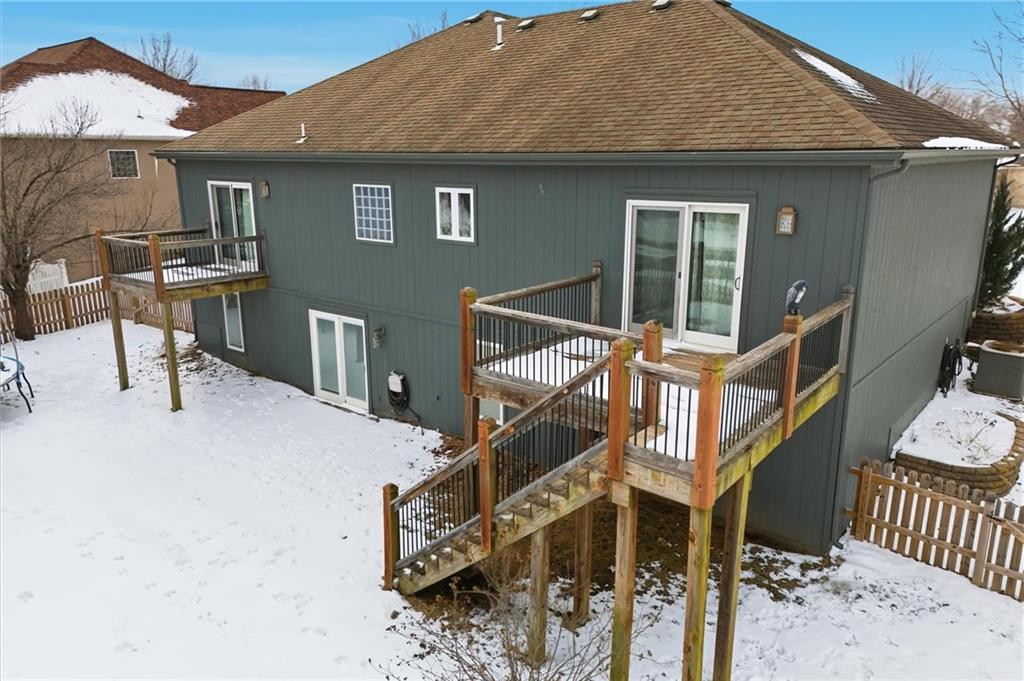 Spacious 4 bed, 2.5 bath, 3,400 sq ft 1.5-story home in the desirable Oaks of Edgewood. Hardwood floors welcome you into an oversized carpeted living/family area with a large window for natural light. The main-level kitchen features a large island, stainless steel appliances, pantry, kitchen/dining combo, and deck access. Half bath conveniently located on the main level. The primary suite, also located on the main level, is a true retreat with a fireplace, private deck, walk-in closet, attached laundry, and a double-door entry to the bathroom with double sinks, soaking tub, and tiled walk-in shower. Lower-level living quarters include three bedrooms, a kitchen, full bath, additional laundry, and abundant storage. Patio and fenced backyard complete the space. Additional highlights: solid-wood doors throughout, a 3-car garage, and ample basement storage. Grain Valley School District. Ready for its new owners!