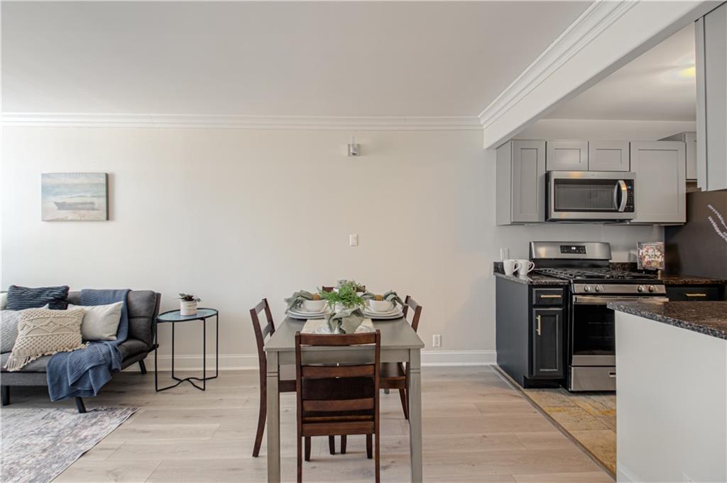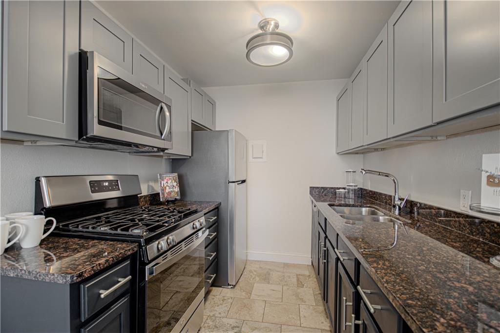 DONT MISS THIS! Welcome to this updated 1-bedroom, 1-bathroom condo at the Manhattan Condominium. This clean, move-in-ready unit features thoughtful updates that make it comfortable and appealing. Inside you'll find fresh LVP flooring throughout the unit, complemented by new crown molding, updated light fixtures, and new custom blinds. The real star of this home is the luxurious, spa-like bathroom with a stunning walk-in shower featuring beautiful tile work, modern fixtures, and a rain showerhead—a true retreat! The kitchen has been refreshed with new upper cabinets and includes a new refrigerator and microwave. The primary bedroom features a convenient laundry closet with a Bosch washer and dryer—no shared laundry facilities! Unit is being sold partially furnished, including a bed, dresser, futon in the living room, dining table with 4 chairs, kitchen utensils and cookware, living room TV and stand—perfect for those looking for a turnkey living situation or investment property! This well-maintained condo offers clean, comfortable living with some great updates where it counts. Perfect for anyone looking for a simple, functional space with one truly beautiful feature! Manhattan Condominium offers resort-style living with incredible amenities: a penthouse indoor pool, movie theatre, expansive gym with YouTubeTV, WiFi throughout the building, entertainment and grilling areas, elegant lobby, beautician and coffee shop on-site, and 24-hour maintenance services. There's a dog park nearby for your furry friends! Embrace hassle-free living with utilities, trash, and recycling included in HOA fees. Enjoy the security and convenience of a private garage with an assigned parking spot and additional storage unit. Long-term leasing is allowed, making this an excellent opportunity for investors or buyers seeking rental income potential.