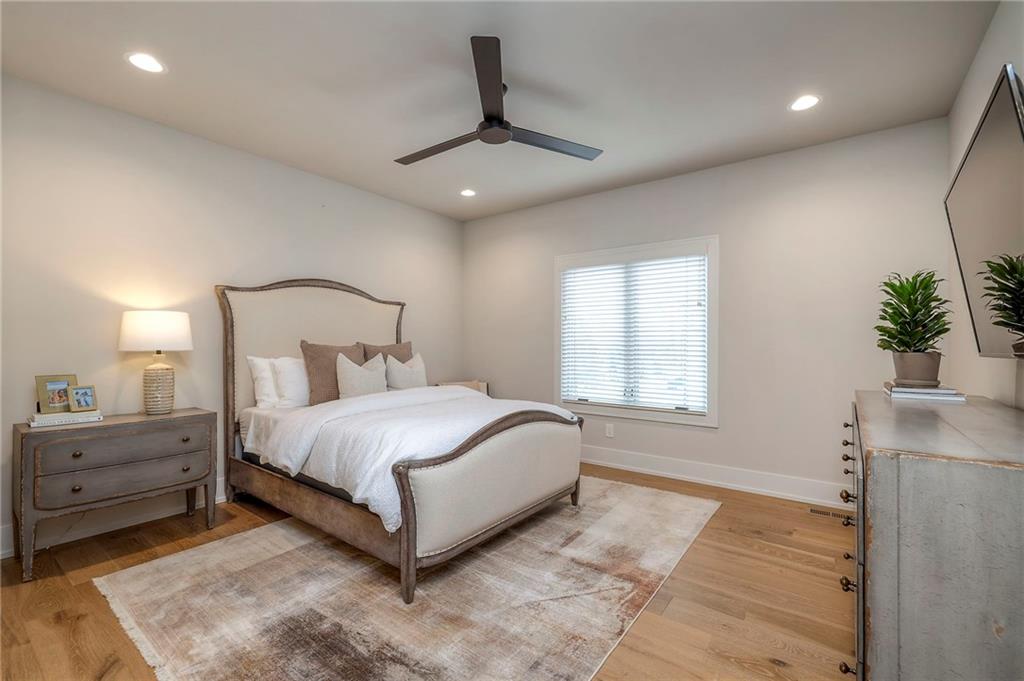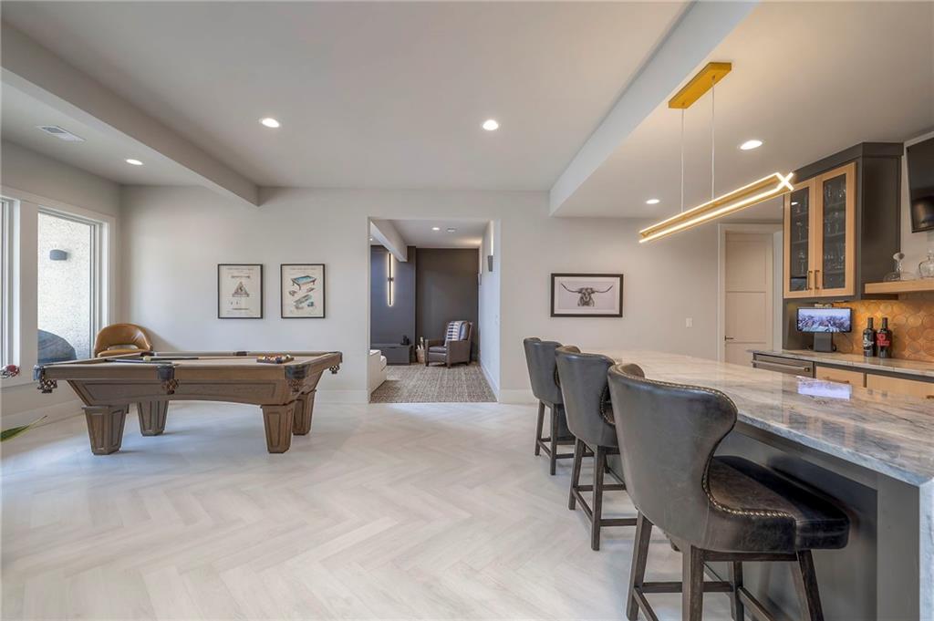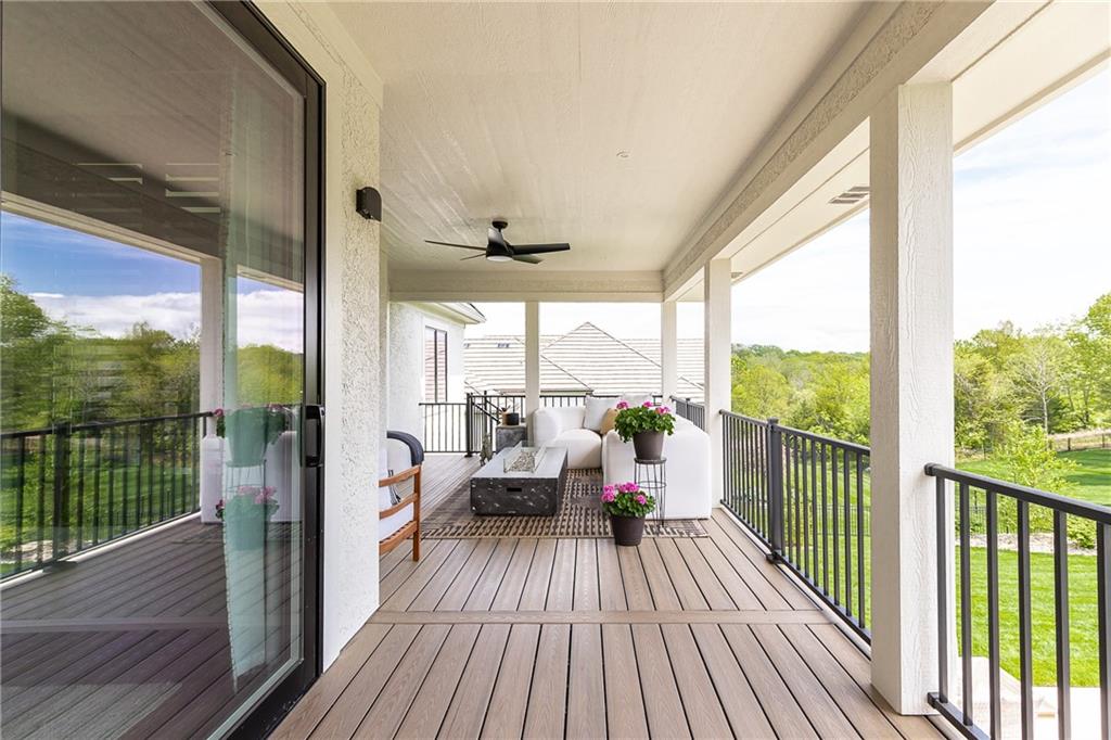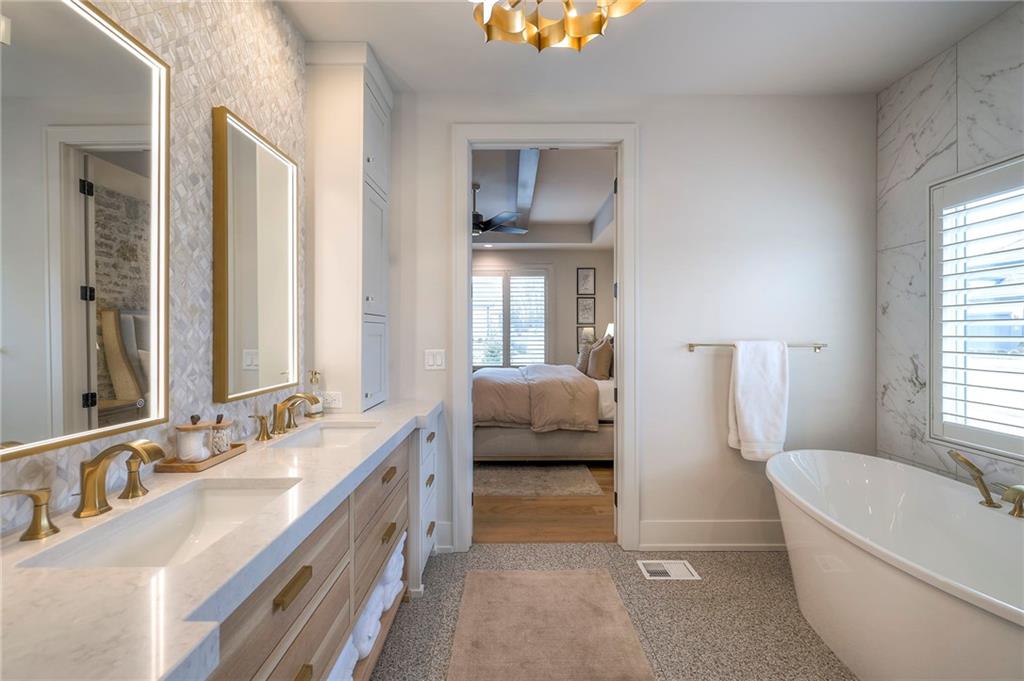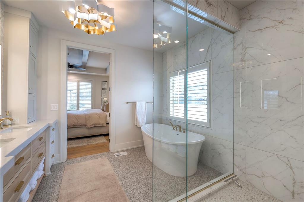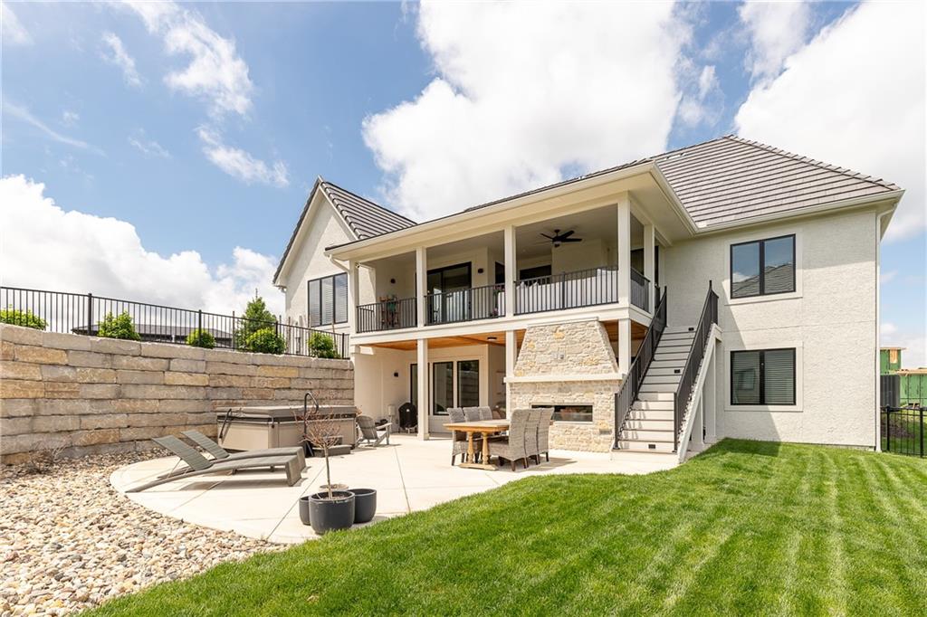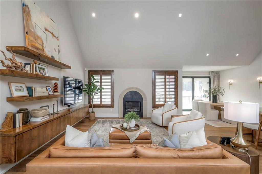Welcome to this stunning, thoughtfully designed home where elevated finishes and exceptional entertaining spaces come together beautifully. The dramatic living room showcases soaring 18-foot ceilings, custom built-ins, and charming arched fireplace, all complemented by wide-plank hardwood flooring that flows seamlessly throughout the main living areas. Plantation shutters throughout the home and elegant arched doorways add timeless architectural character, style, and privacy. The designer kitchen is both sophisticated and functional, featuring a gas range, quartzite countertops, striking stone feature wall, wine fridge, and abundant workspace for everyday living or hosting. Just off the kitchen, a spacious butler’s pantry provides additional storage and convenience, complete with a second oven, making entertaining effortless. The kitchen opens directly to a large covered deck with low-maintenance Trex decking, creating the perfect indoor-outdoor connection. The luxurious primary suite is a private retreat, highlighted by a beamed ceiling and stone feature wall, and complemented by a spa-inspired bath offering LED mirrors, quartzite countertops, a soaking tub, and an oversized walk-in shower. The laundry room is conveniently located just off the primary suite for added everyday ease. The walk-out lower level is designed for unforgettable gatherings, featuring a media room and an impressive entertaining bar with waterfall-edge quartzite countertops, microwave, drink fridge, and wine fridge. Step outside to the patio, partially covered for year-round enjoyment, complete with a see-through stone fireplace and hot tub, creating an inviting outdoor living space perfect for relaxing or hosting guests.
