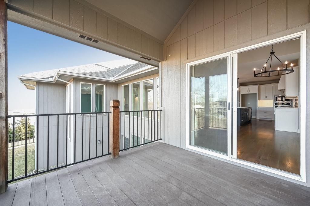 Enjoy main-level living in this stunning Reverse 1.5 Story, ideally located on a quiet cul-de-sac just steps from Lake Lenexa and the soon-to-be-completed neighborhood amenity center. Backing to treed greenspace, this home offers privacy, scenic views, and easy access to trails and community amenities. The open kitchen and dining area are designed for both everyday living and entertaining, featuring custom cabinetry, a large island, walk-in pantry, and direct access to the covered deck—perfect for grilling, relaxing, or outdoor dining. The main-level primary suite includes a spacious bedroom, spa-inspired bath, oversized walk-in closet, and conveniently connected laundry. A second main-floor bedroom and full bath provide flexibility for guests or a home office. The walkout lower level expands your living space with an oversized recreation room, large windows overlooking the trees, and a finished wet bar ideal for hosting or movie nights. Two additional bedrooms each have private baths, offering comfort and privacy. Notable features include a reinforced concrete storm shelter, dedicated electrical for a patio hot tub, and EV-ready wiring in the garage. Located in desirable West Lenexa with HOA amenities including pool, trails, play area, and more. All offers will be considered. A rare blend of location, design, and functionality—this home is a must-see.