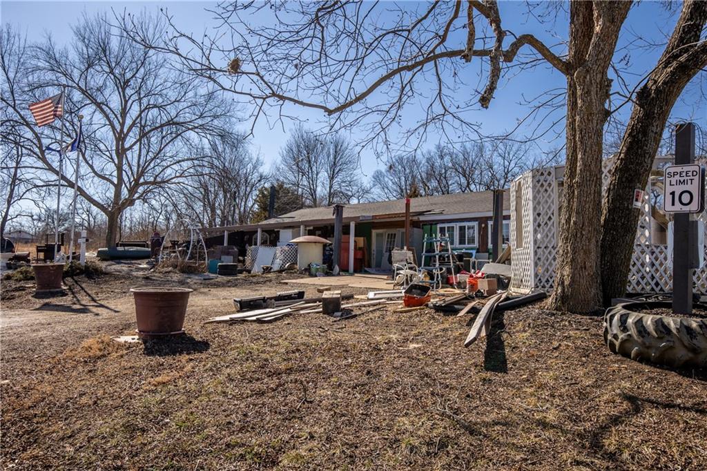 Renovators Welcome! This 3 bedroom, 1 bathroom home offers 1,395 sq ft of living space, plus an additional 744 sq ft garage that is closed in and ready to finish—providing an excellent opportunity to finish out and add substantial square footage. The home also features additional attic space with stairs already built, offering even more expansion or storage potential. Situated on four 2nd tier lots located at Holiday Lakes, just east of Pleasanton, KS. This property offers plenty of room to spread out in a rural setting while still enjoying lake life. The home is in need of major renovation, but the layout, lot size, and extra square footage opportunities make this a prime value-add project for an investor or buyer with vision.