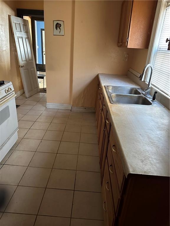 Kitchen with light countertops, white range, light tile patterned floors, and wood finish cabinetry