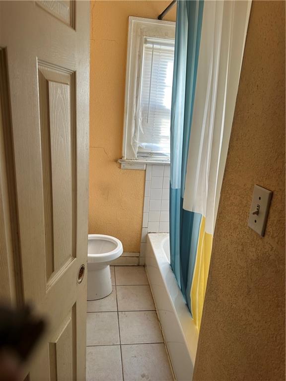 Bathroom featuring light tile patterned floors, a textured wall, and shower / bath combo