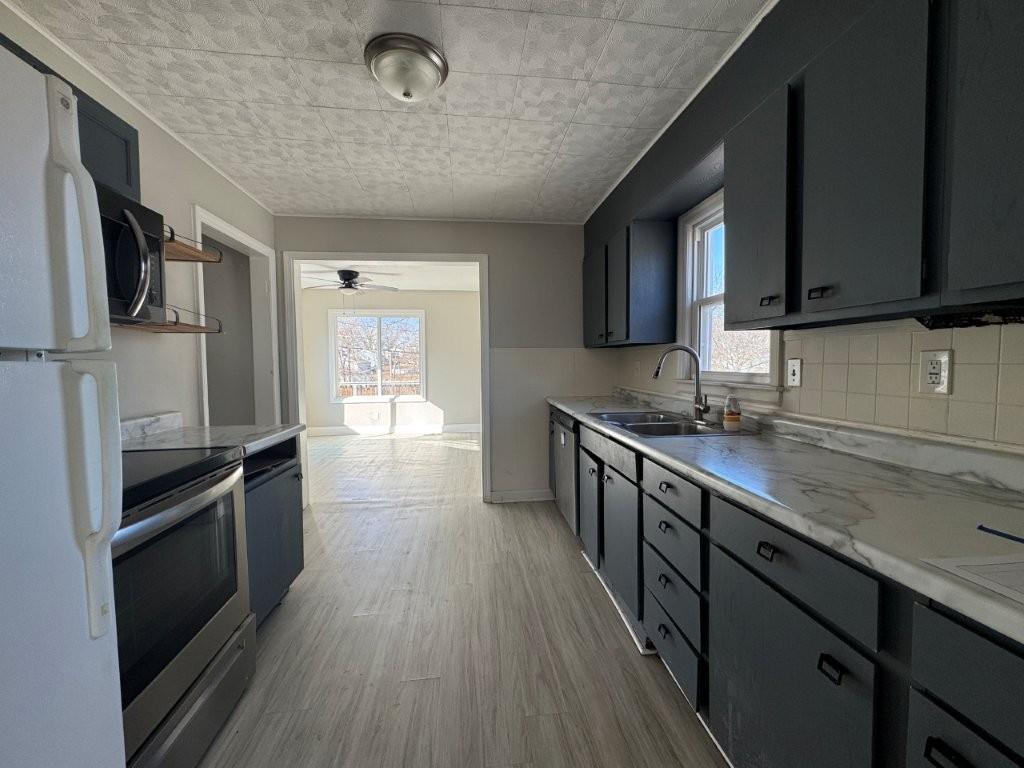 HUD Case #291-587831. Ranch-style home offering hardwood flooring and newer vinyl windows. Kitchen features painted gray cabinets with upgraded laminate countertops. Sunroom off the kitchen includes a white-washed brick fireplace, abundant windows, and access to the deck; currently staged as a dining area. Large living room accommodates oversized sectional or living/dining combination. Front patio and rear deck provide additional outdoor living space. Walkout basement offers flexible use for recreation room, home office, or media area; laundry located in basement. Eligible for FHA $100 Down Payment program for qualified owner-occupant buyers. Property sold AS-IS. Buyer to verify all information.