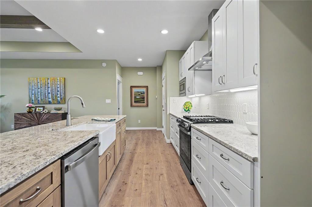 This impeccably built 3 bedroom, 1 and ¾ bath home offers 1,805 sq ft of comfort, quality, and timeless style. A welcoming wainscoted entry, designer interior doors, and quality finishes throughout elevate the home’s character. The kitchen is both functional and inviting, featuring a large island with farmhouse sink, an impressive gas range, and a 47-decibel ultra-quiet stainless steel dishwasher, ideal for entertaining or everyday living. The open living room is anchored by a stunning natural native Kansas limestone fireplace surround, wood burning fireplace made easy with gas log lighter, accented by exposed timber beams that continue into the primary bedroom for a warm, rustic elegance. Retreat to the primary bedroom enhanced by a custom designed accent wall and coffered ceiling, en suite primary bath boasts a large walk-in closet, walk-in shower and double vanity. The generous laundry room with sink adds convenience and practicality. One level living complete with an insulated 3-car garage for added ease and storage. Sound insulation in living areas and bathrooms and an insulated perimeter floor slab enable year-round comfort and quiet living. This thoughtfully designed home offers modern amenities and quality construction; perfect for those seeking space, style, and serenity.