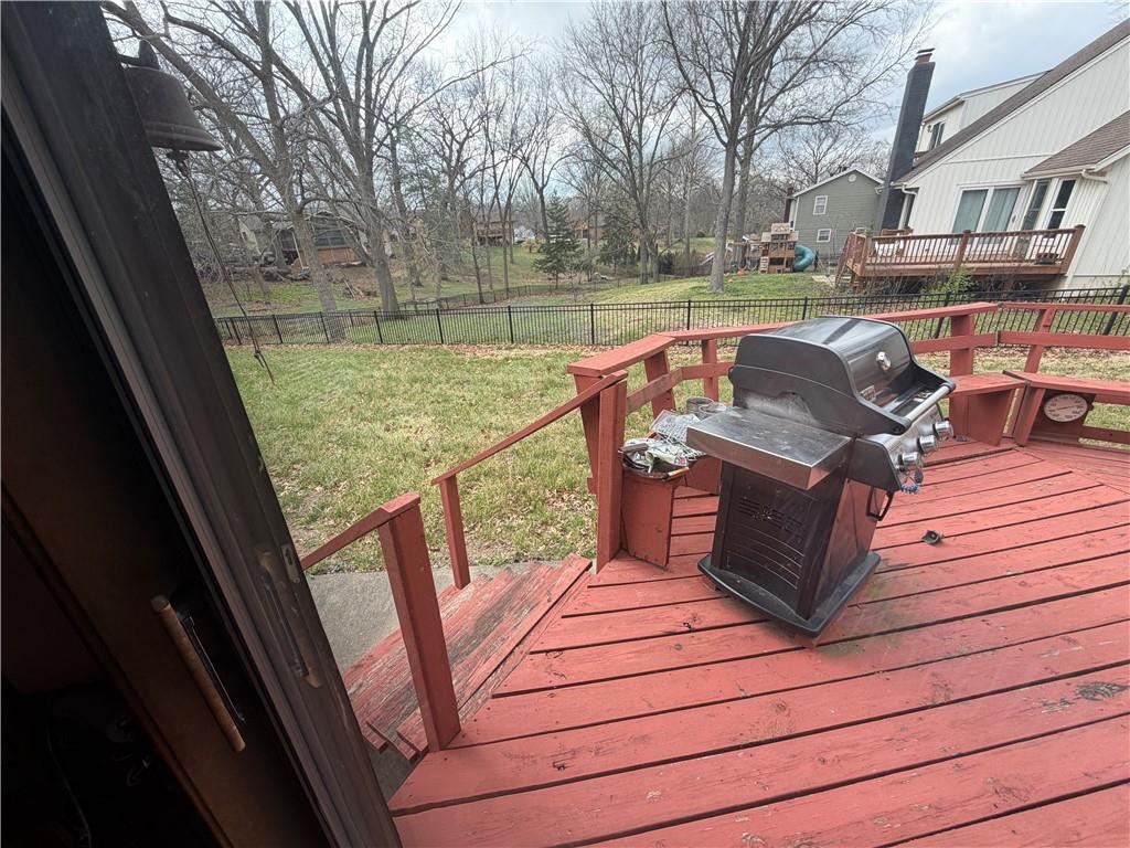 Excellent location in Piper School District. Close by golf course and to the Chief’s new stadium site. Nice size corner lot with circular driveway. Lots of built-in bookshelves in 2 of the main level bedrooms. Master bedroom has cathedral ceiling and en suite bathroom with accessible walk-in shower. Great room has a cathedral ceiling and large fireplace. Fireplace also in the family room downstairs.Two full bathrooms on main floor plus half bath off of the laundry room on main level. Breakfast room off of kitchen. Appliances stay. Several sliding doors from the main level out to the wraparound deck. Three nonconforming bedrooms in the basement plus large family room and full bath. Lots of unfinished storage space and workshop in basement. House has good bones but needs TLC.