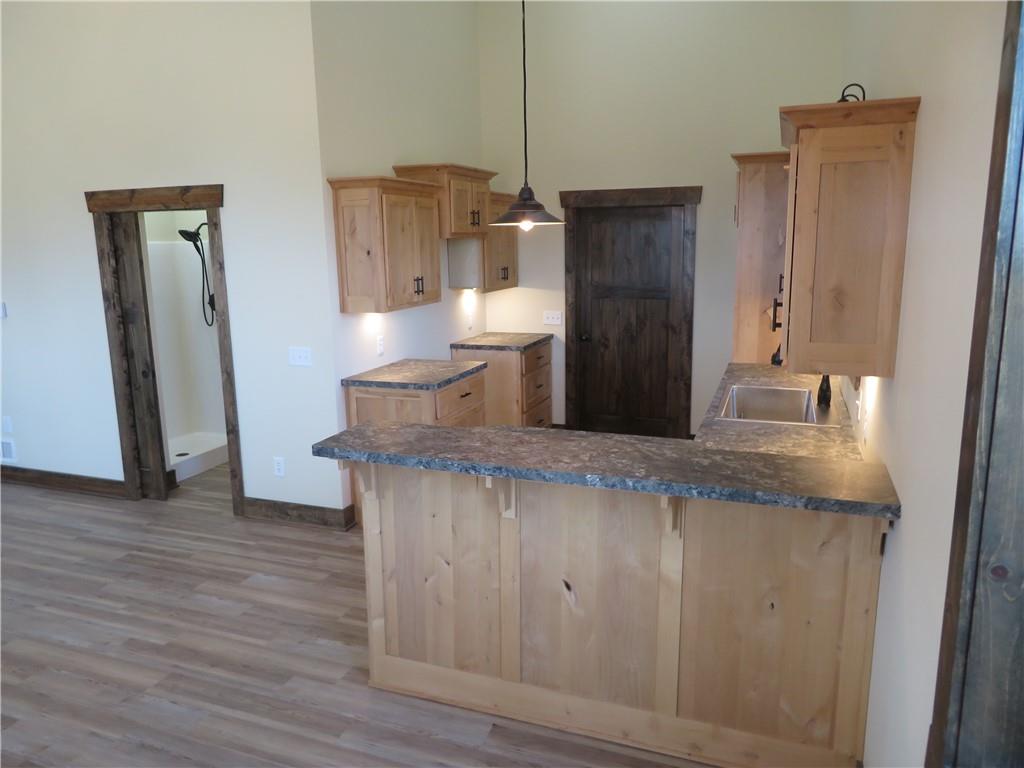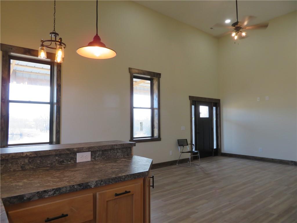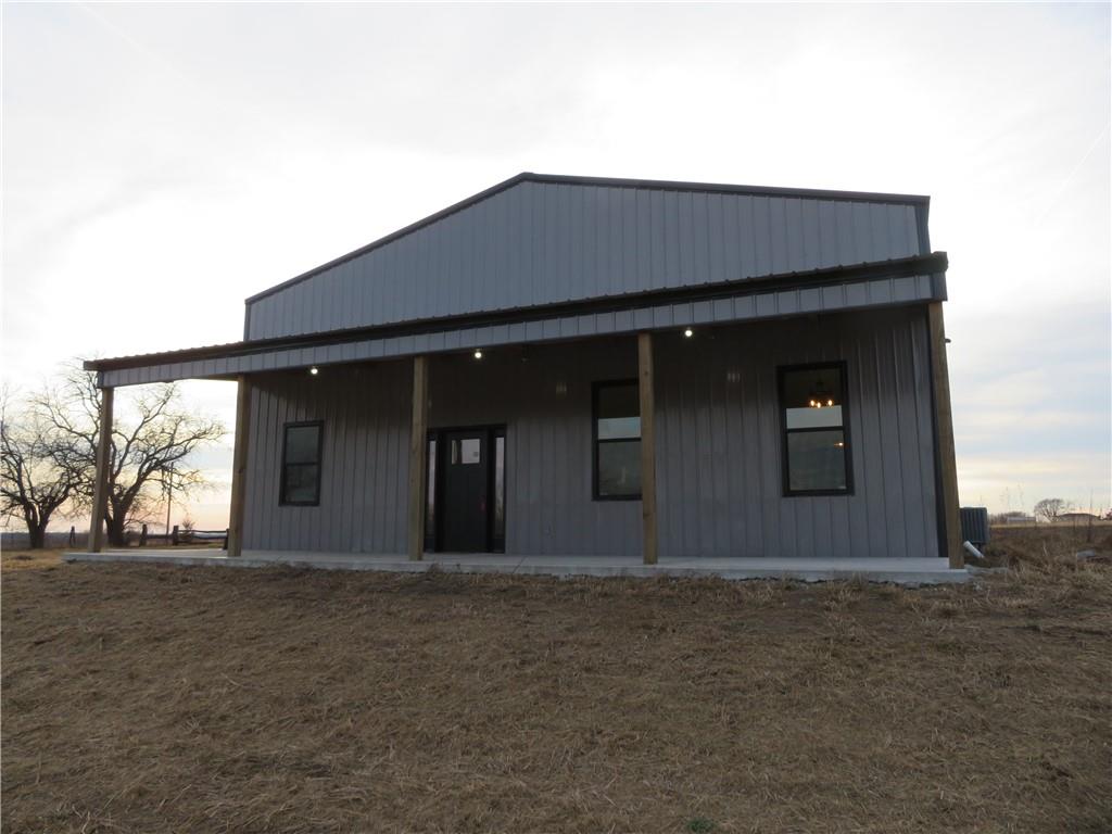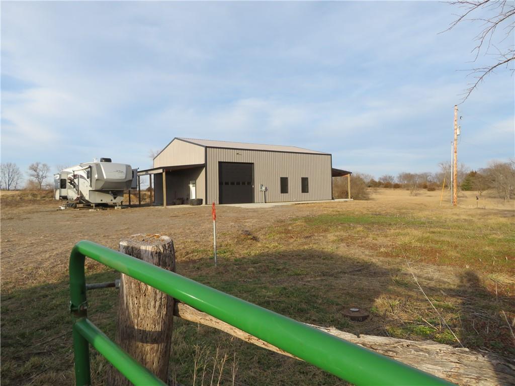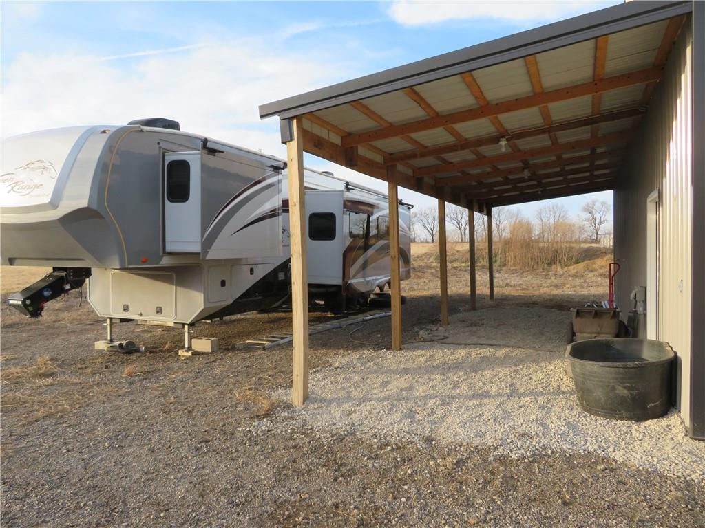 New, recently finished Barndominium on 12+-acres. 2bedroom, 2 bath, open floor plan. Custom kitchen & large, shelved pantry. Oversized primary suite w/enormous walk-in closet & large full bathroom w/extra cabinets for storage. Unique finishes, and light fixtures throughout. Covered front porch on east side is perfect for enjoying the views and Kansas sunrises. Oversized 35'x16' garage w/extra storage above finished space, 12' door perfect for large vehicle parking. 35'x15' attached lean-to has RV/camper hook-ups. Expansive 12+-acres w/nice pond, perimeter fencing & 3-sided shed for animal shelter. This property can easily be set-up for horses/livestock. Lovely country setting on paved road. Settle in and stay awhile!