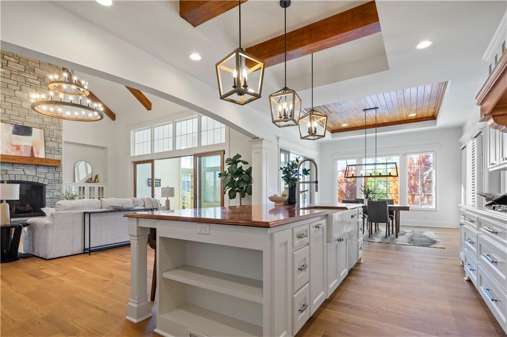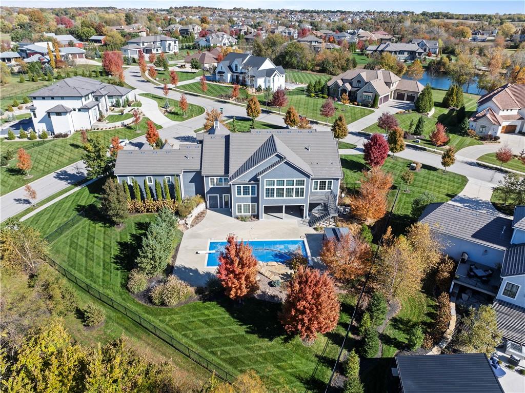 SHOWSTOPPER Reverse 1.5 story in The Farms at Garnet Hill! Impressive from the start--thoughtful landscaping, circle drive and a 5 car garage. Custom build by Cecil & Ray design team. This elegant home blends timeless design with resort-style living. Step inside to soaring ceilings, rich hardwoods and expansive windows showcasing beautiful views of the private backyard oasis. The open-concept main level features a great room with stone floor to ceiling fireplace and built-ins flowing seamlessly into the gourmet kitchen. Please any chef and entertain in style in this expansive kitchen featuring custom cabinetry, large center eat-in island, walk-in butler's pantry and high-end stainless steel appliances. Adjacent dining and breakfast areas! Easily move the experience onto the lanai with multiple access points for convenience. Spacious primary suite offers a spa-inspired bath including double vanity, soaking tub, large walk-in shower and huge walk-in closet conveniently adjacent to laundry room. Second main-floor bedroom or office with built-ins adds flexibility. Option to take the stairs or use the elevator to the beautifully finished walk-out basement. Here the entertainer’s dream continues with a family room, rec area, gorgeous wet bar, tiered media room, two additional bedrooms each with their own en-suite bath and walk-in closets and bonus pool bathroom with changing room and 2nd laundry. Walk-out access to the in-ground resort styled pool, covered patio, sun deck and lush landscaping providing privacy. Impeccably maintained, thoughtfully designed and located in one of Overland Park’s most desirable neighborhoods—this is luxury living at its finest! WELCOME HOME!