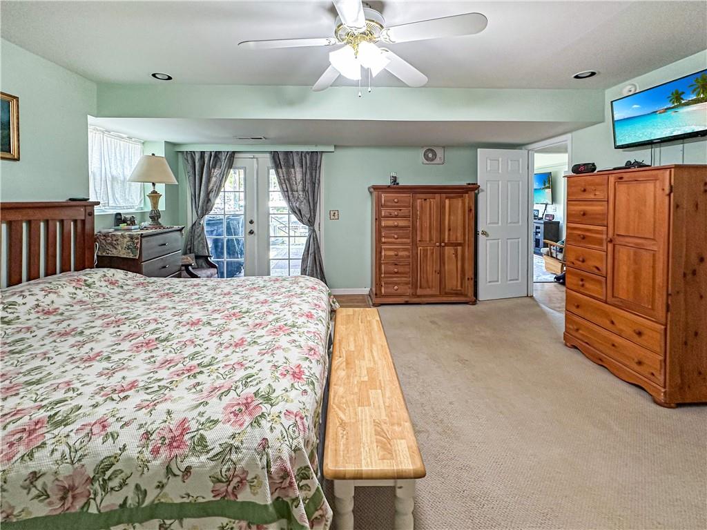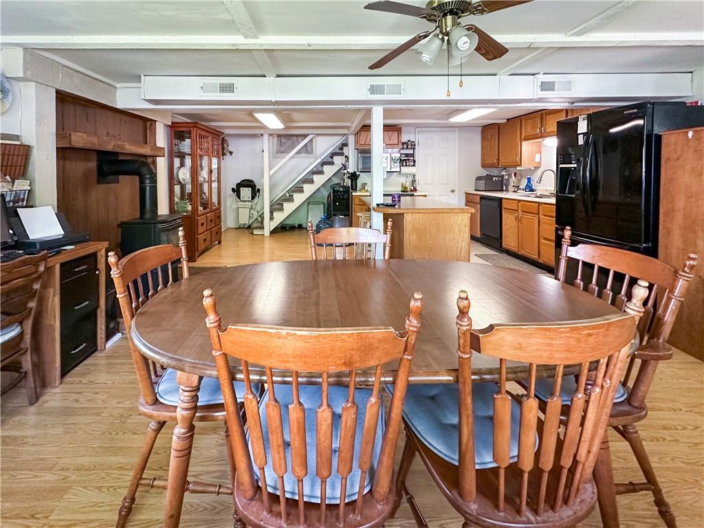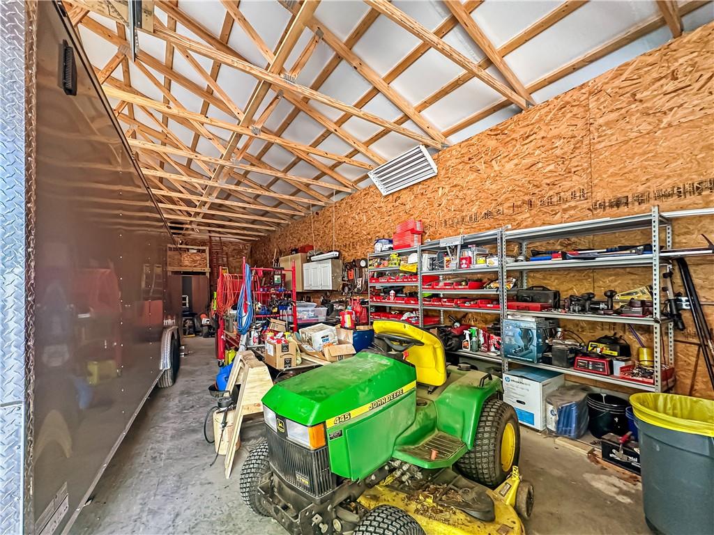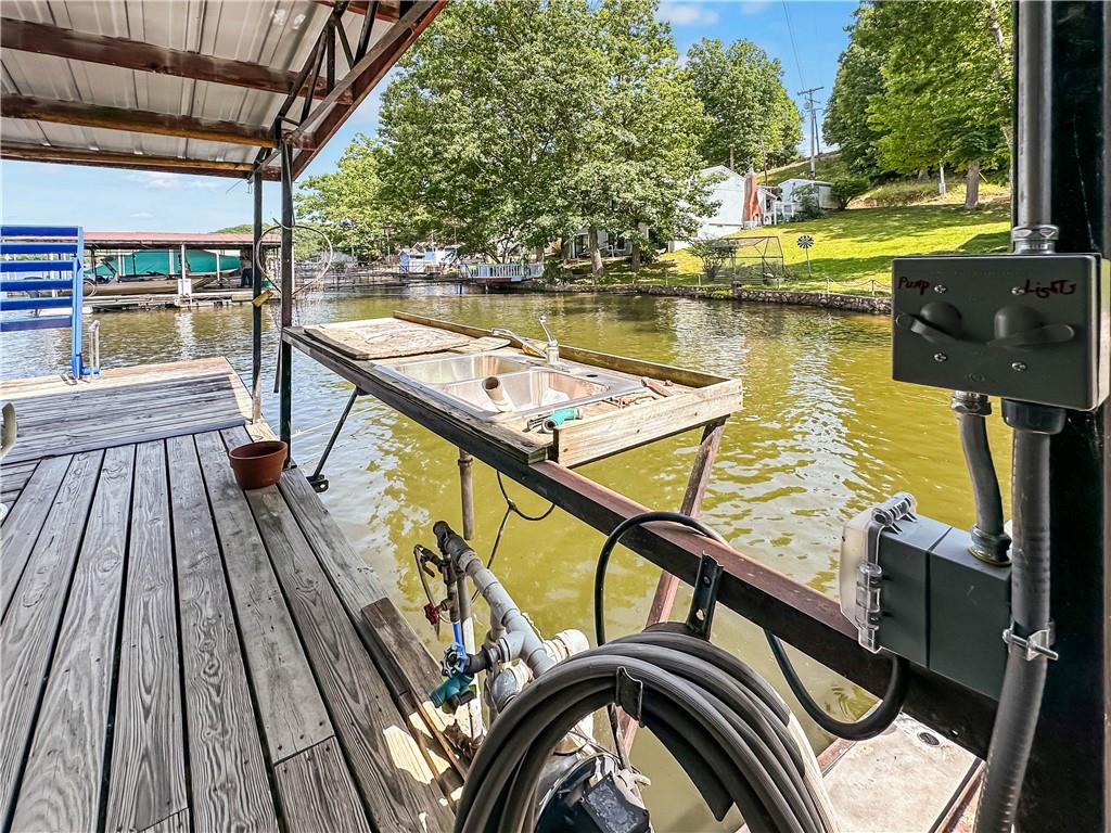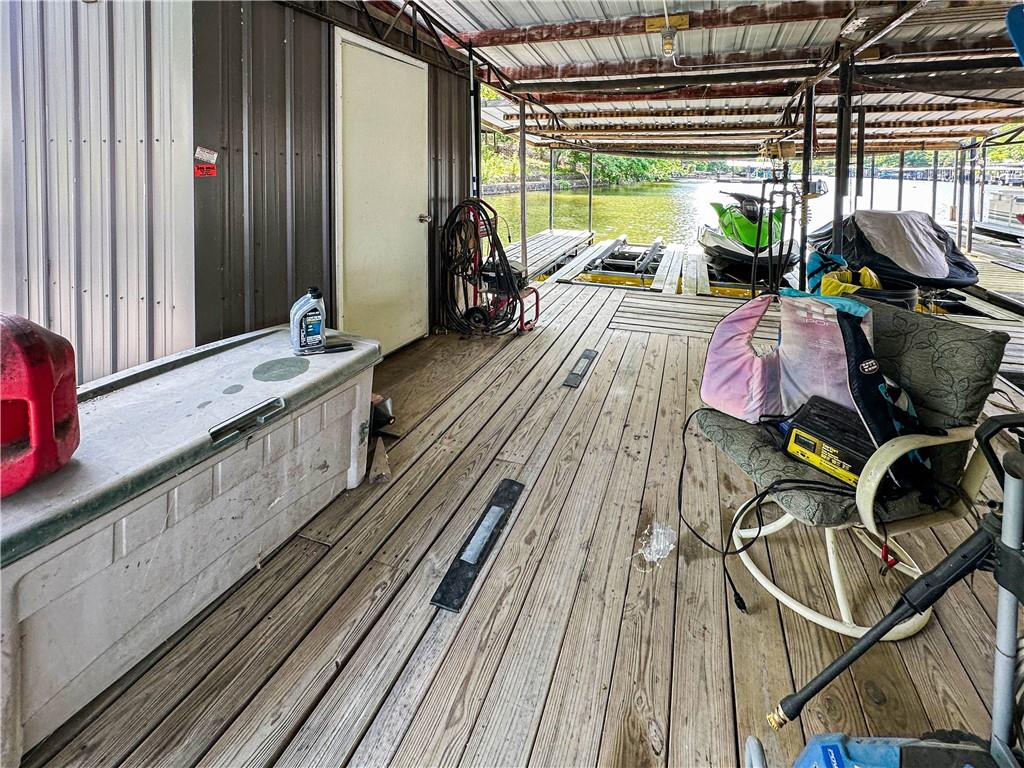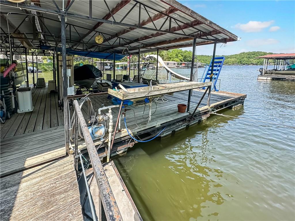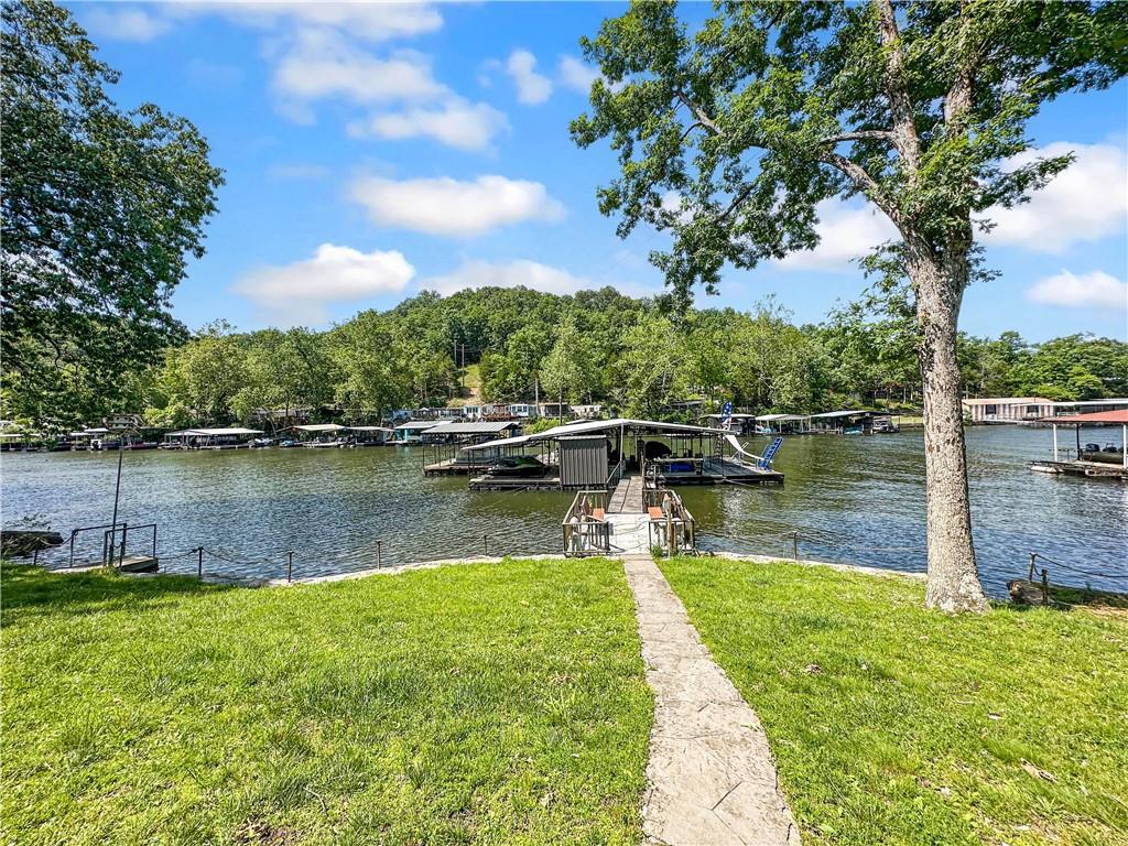 The Lake of the Ozarks is a popular destination for boating, fishing and water sports, known for its beautiful scenery. This 2737 sq ft home features 5 bedrooms,3 baths, and a open concept kitchen and dining area, perfect for entertaining. The patio offers a serene spot for outdoor dining under pergola the with lake views. There is a additional waterfront vacant lot for space to enjoy yard games.. Water enthusiasts will appreciate the gentle slope to the recently stained, 4 well covered dock with martini deck, 3 boat lifts and 3 PWC lifts, swim platform with wet steps, slide, and pirate plank. The stainless-steel cleaning station is ideal for fishing enthusiasts. The dock storage building is perfect for storing fishing equipment and water toys. The 2000 sq ft storage building/shop across the road is heated, with a loft for extra storage. Its extra tall overhead door accommodates an RV, adding convenience for travelers or guests with large vehicles. This property blends comfort, convenience, and recreational opportunities, making it ideal for full-time living or vacation getaways.