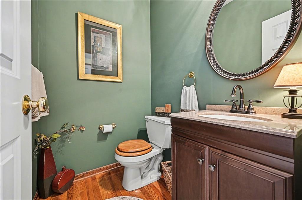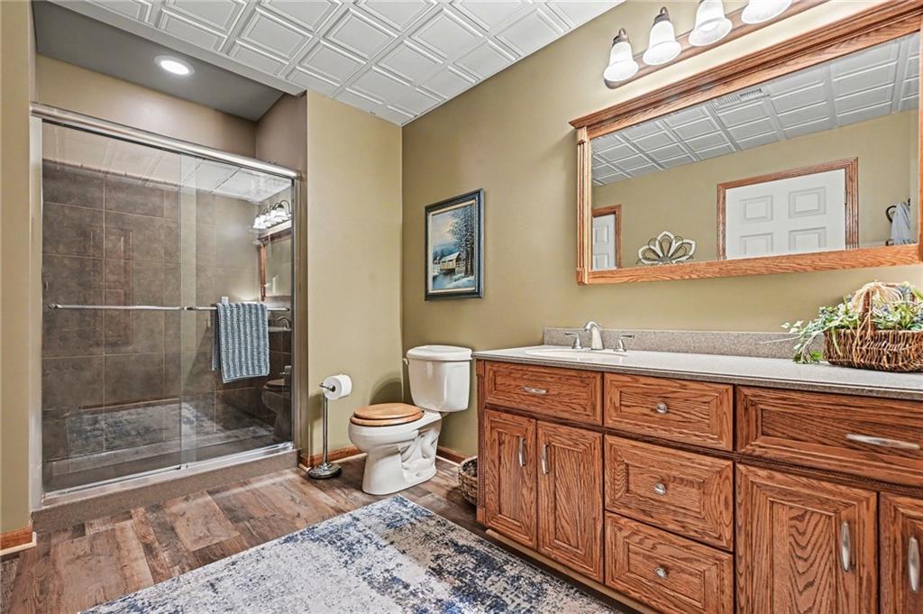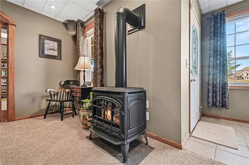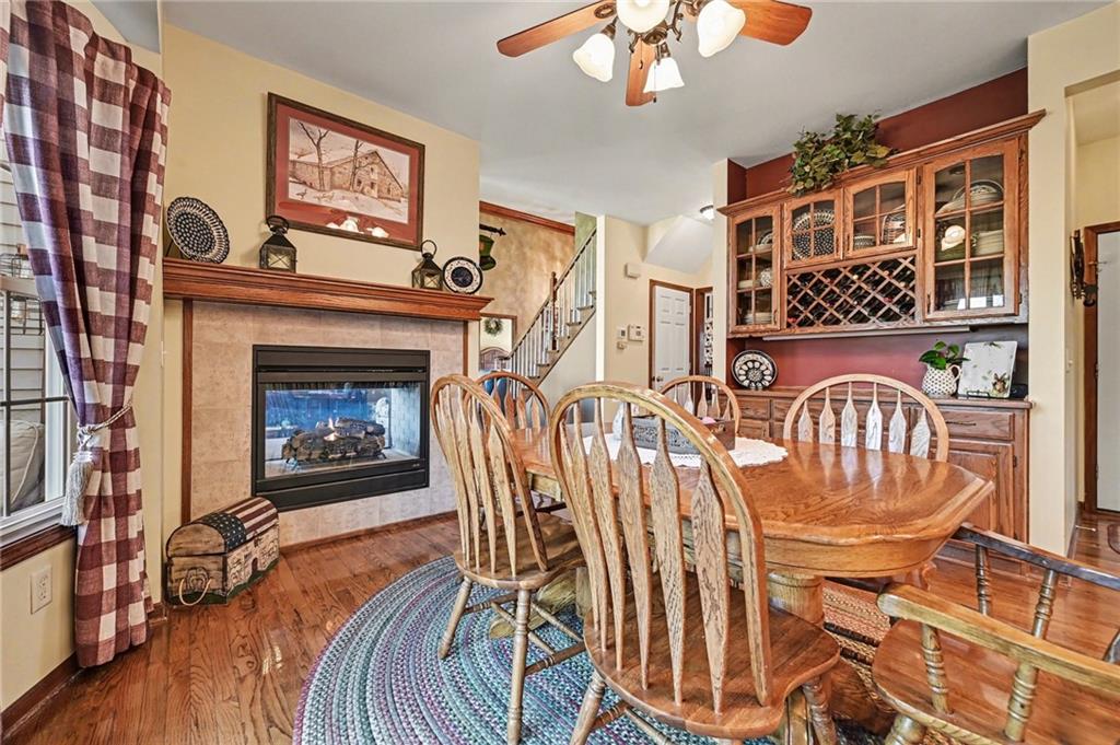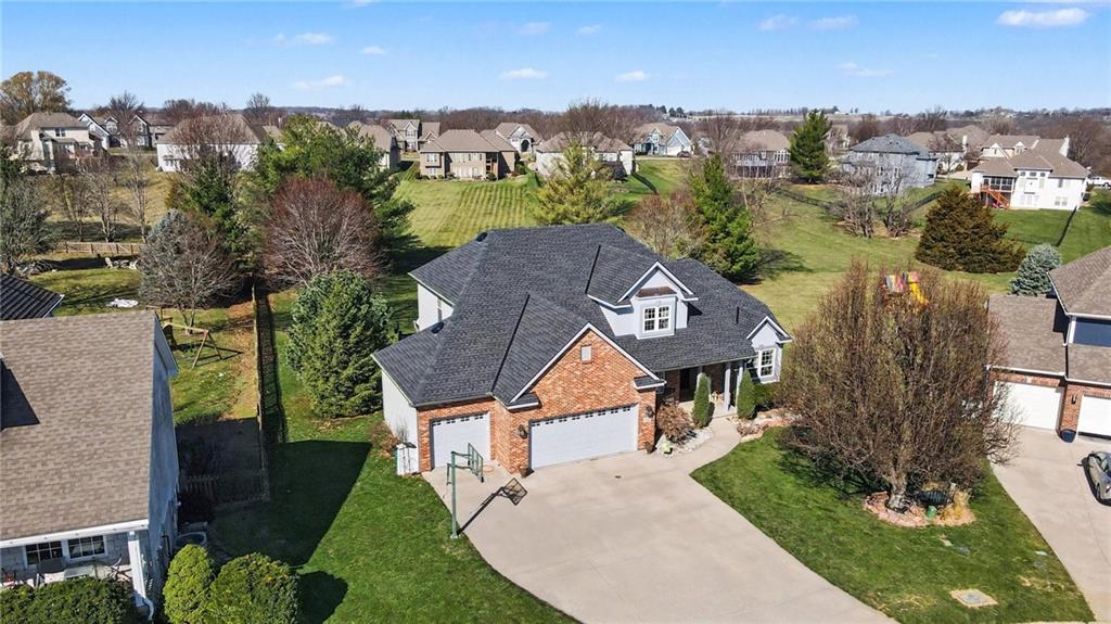 Stunning 1.5-story home in the highly desirable Lakes of Oakmont, ideally situated on a quiet cul-de-sac and featuring a welcoming covered front porch, spacious 3-car garage, plus an additional rear garden garage. This beautifully maintained home offers exceptional quality and thoughtful upgrades throughout. The main level features a spacious living room, formal dining room, and a well-appointed kitchen with solid surface countertops, pantry pull-outs, built-in buffet, and a beautiful see-through fireplace shared between the eat-in kitchen and living room. Also on the main level are the primary suite, laundry room, and convenient half bath for true main-level living. The primary bathroom offers heated floors, creating a spa-like retreat you’ll appreciate every day. Upstairs includes three generously sized bedrooms, two full bathrooms with direct access from each bedroom, providing comfort and privacy for family or guests. The finished walkout lower level is ideal for entertaining with a large family room, custom built-ins, wet bar area, and a dedicated office that could easily serve as a fifth bedroom, along with a full bath, spacious storage room, and convenient access to the rear garden garage—perfect for lawn equipment, a small vehicle, hobbies, or workshop space, and even includes an additional oven. Outdoor living is just as impressive with a covered patio, full-yard sprinkler system, routine pest control services, and an electric awning over the back deck for shaded relaxation. Major updates include a one-year-old roof and a new garage door opener featuring battery backup.