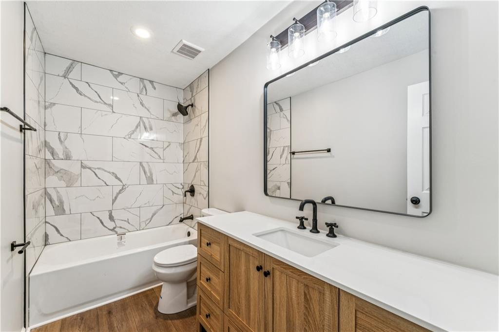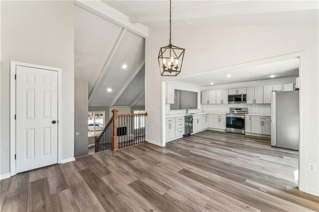 Style, space, and serious wow factor. This beautifully refreshed home features soaring vaulted ceilings in both the living room and primary suite, creating an open, airy feel throughout. The gorgeous kitchen steals the show with sleek cabinetry, stainless appliances, and modern finishes that feel straight out of a design magazine. Enjoy cozy evenings by the fireplace, entertain on the brand new deck, and appreciate the fresh updates and move-in ready condition from top to bottom. With new flooring, updated spaces, and great natural light, every room feels bright and welcoming. Conveniently located with easy access to shopping, dining, and highways, this home offers comfort, style, and everyday convenience all in one. Homes with this much personality don’t come around often.