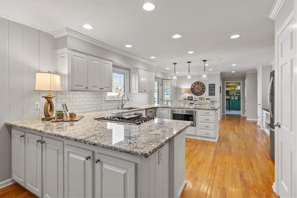 Beautifully updated, this French Design inspired home blends timeless character with thoughtful modern upgrades. The renovated kitchen is the heart of the home, featuring a generous quartz peninsula island, stainless appliances, a five-burner gas stove, abundant built-ins, and seamless flow into a spacious, inviting hearth room perfect for cozy evenings or lively gatherings. The main level also offers a formal dining room for memorable celebrations and a second living area that provides flexible space for relaxing evenings at home. Rich hardwood floors extend throughout both the main and second levels, adding warmth and continuity. Upstairs, you will find an expansive primary suite with built-in storage and a beautifully updated en suite bath designed for comfort and style. The main-floor bedroom, currently serves as an office and could easily transition into a private guest suite to suit your needs. The finished lower level provides a generous sized recreation area and half bath, plus a separate room perfect for a home gym, playroom or hobby area. Step outside and enjoy the custom stone patio with built-in fire pit for an inviting setting for crisp evenings under the stars. The large, fenced backyard offers space to play, garden, or simply unwind. This is the kind of home that feels welcoming the moment you walk in. It’s elegant, functional, and ready for it’s next chapter. Located just steps away from the elementary school and a short walk to shopping, dining, spa services, and much more!